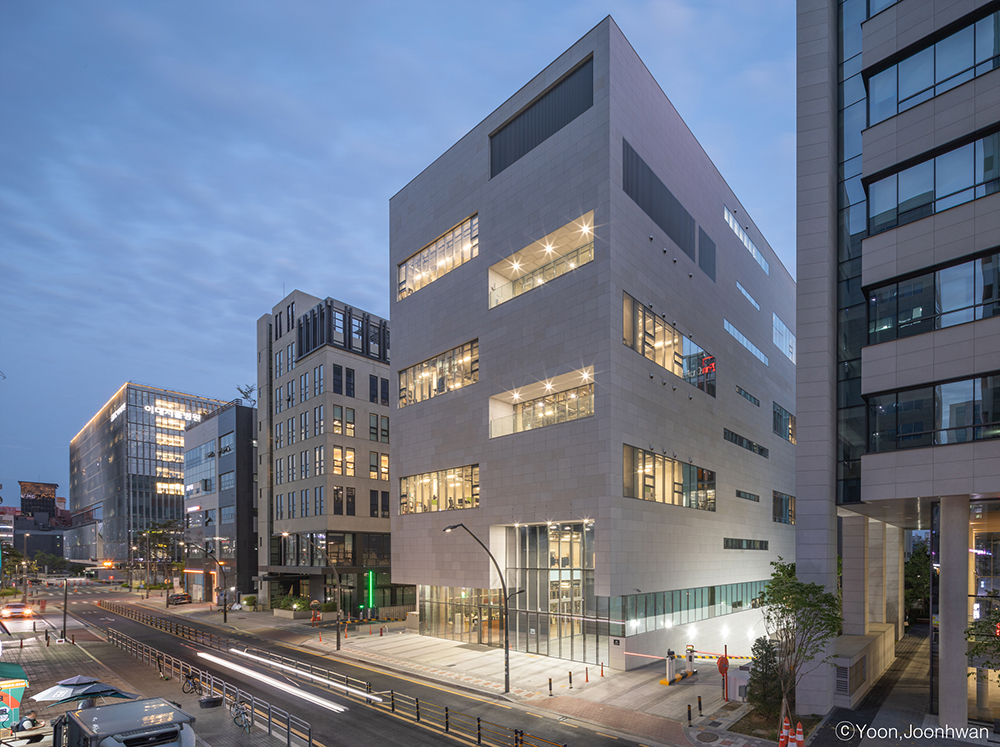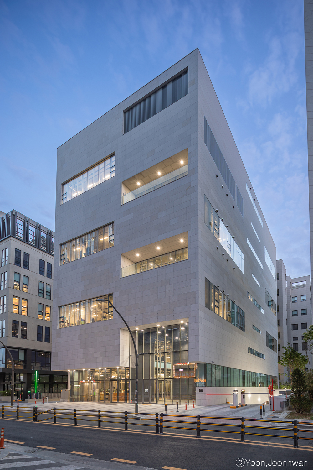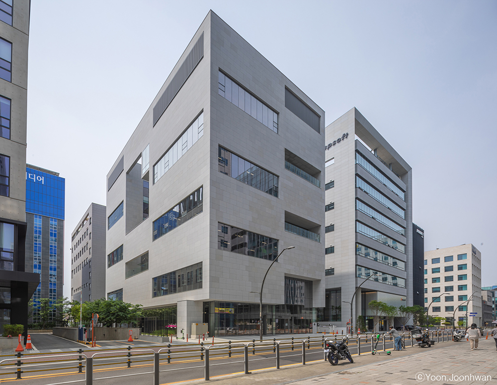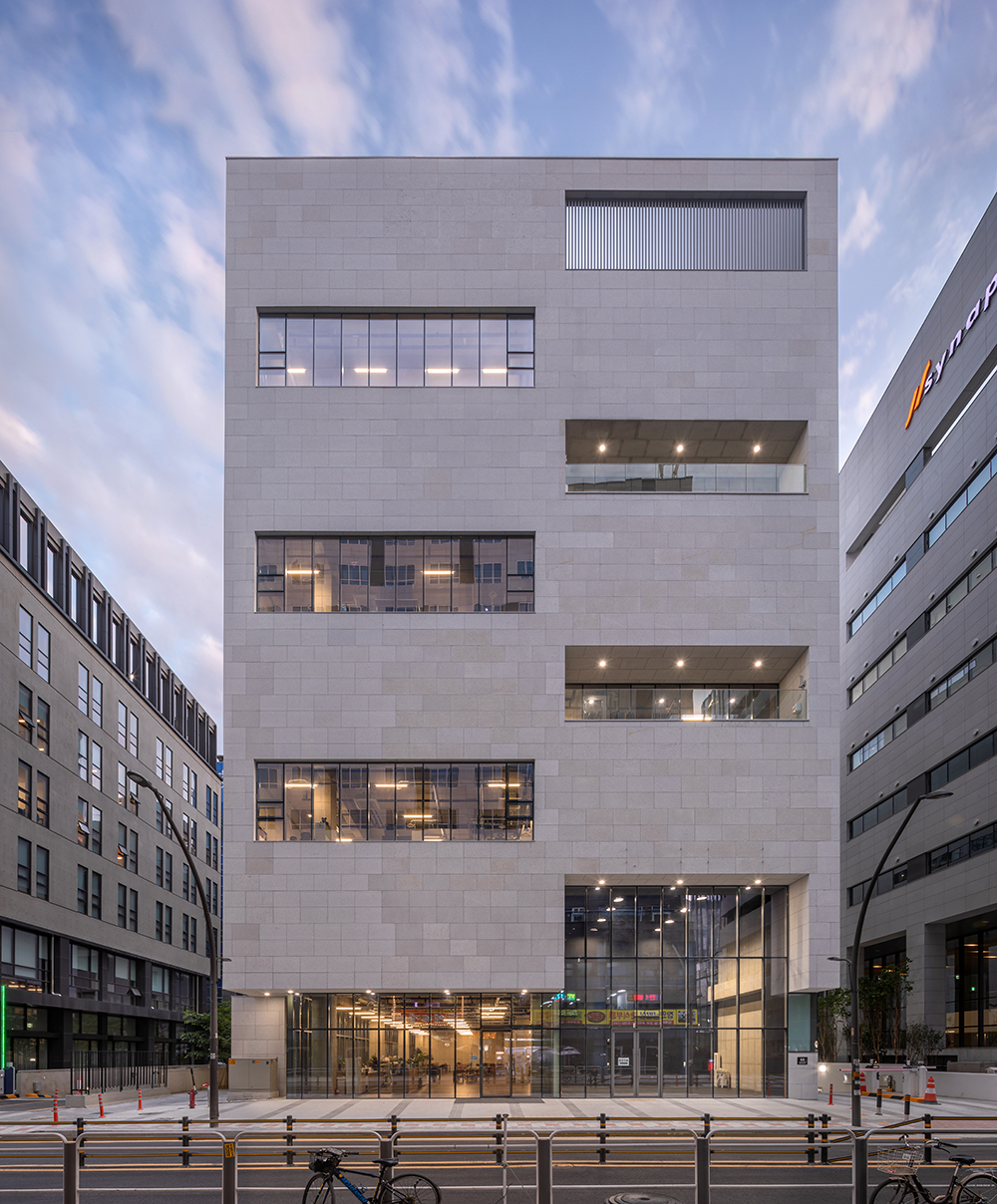 Corporate headquarters should actively promote corporate culture externally, and functionally fulfill the role of a space for research and work. In particular, it is an important architectural strategy for clients to recognize the brand image of MASS C&G, a design company, through the office building. The design was approached with this in mind. The site is located on a back road of the Magok district, and is adjacent to a pedestrian-friendly road formation section with a width of 2m on the left. This means that the minimum conditions are given to avoid the stuffiness of existing roadside buildings.
