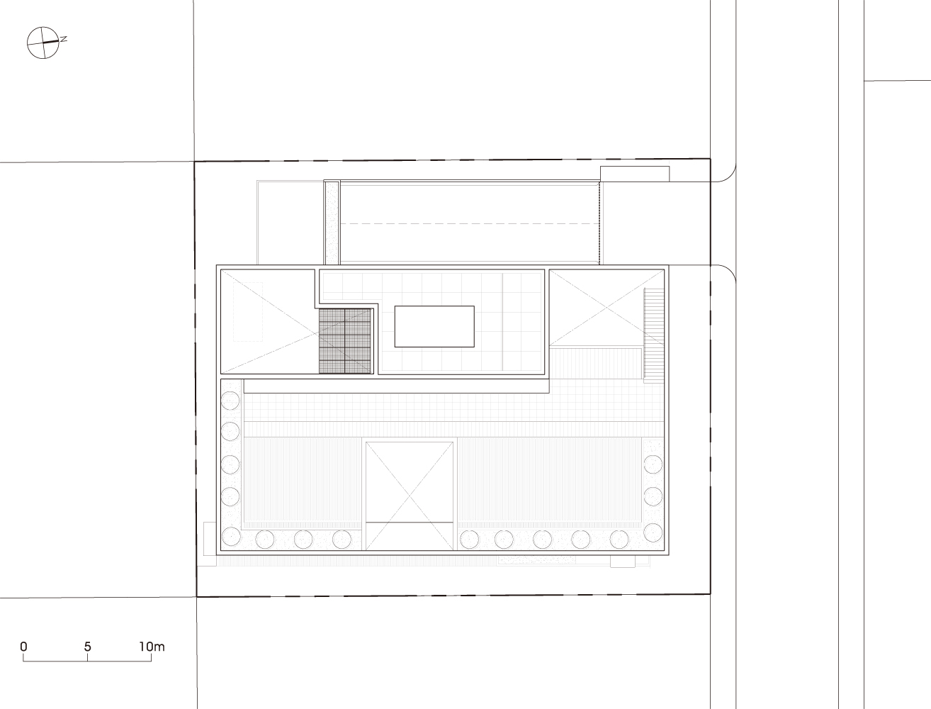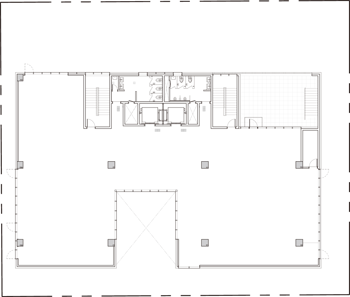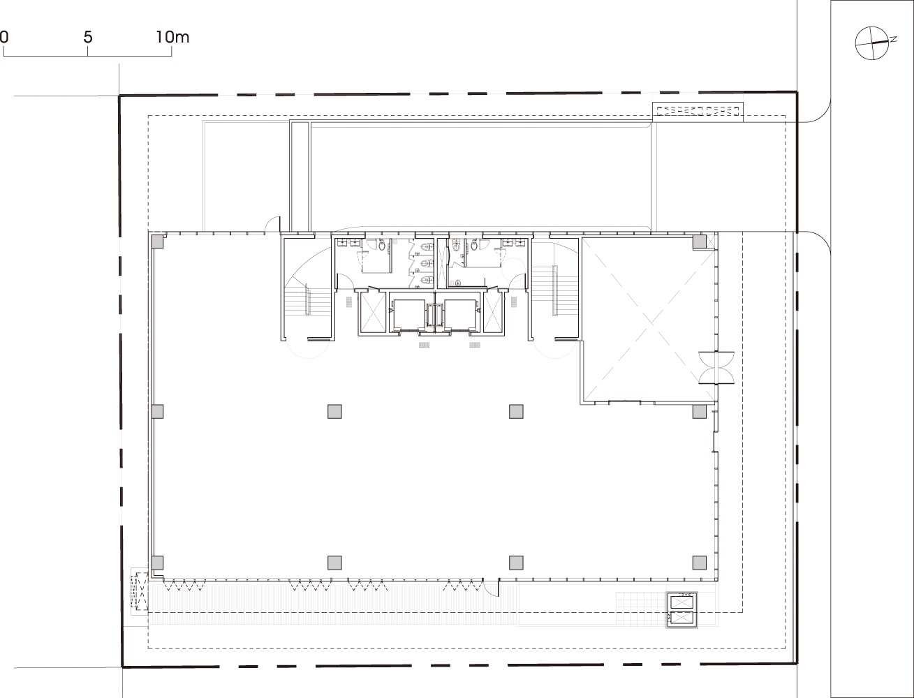 In order to make the building better perceived, the left side was pushed further back 2m, and the right side was also separated by 8.4m including the parking ramp to expose three sides. The form is MASSIVE with the motif of the company name, and this was intended to reveal a creative corporate image. The combination of the void balcony that makes the solid stand out is the main factor. This solid wall is used as a signboard or a space for corporate promotion, and it enhances the formativeness of the building as part of the night view. Taking advantage of the requirement that the effective floor area of one floor is not very large, a balcony facing the outside air and an open space inside are placed on each floor. A floor with a small area naturally maximizes these formative elements. In a way, it is also a strategic approach that differentiates it from other buildings that are light and mostly glass.