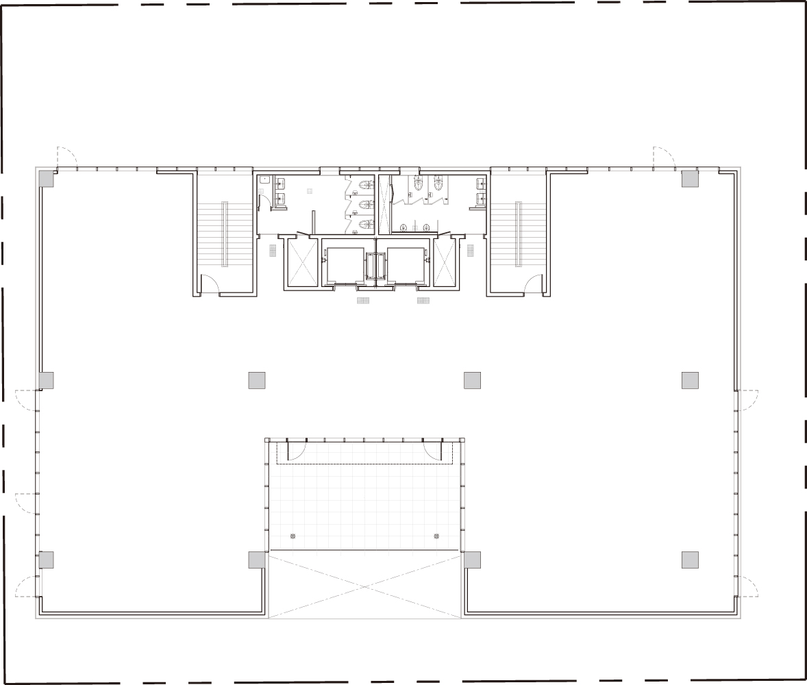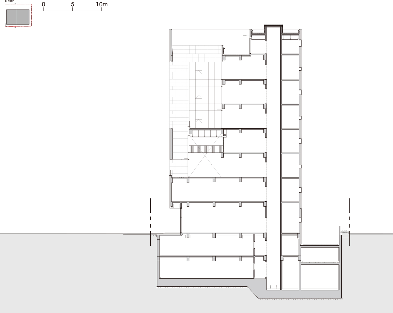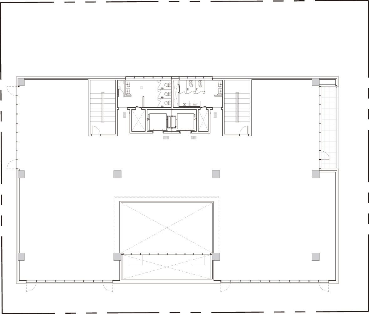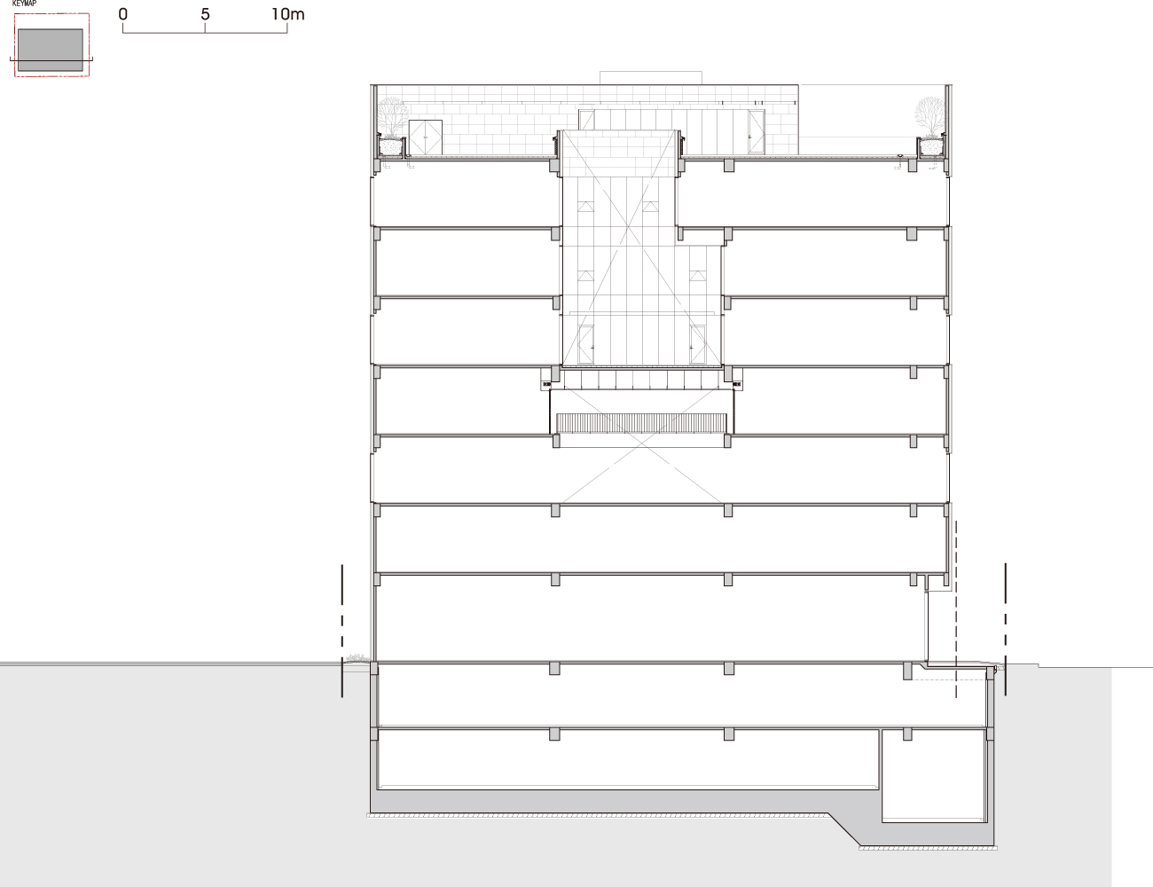 In order to make the building better perceived, the left side was pushed further back 2m, and the right side was also separated by 8.4m including the parking ramp to expose three sides. The form is MASSIVE with the motif of the company name, and this was intended to reveal a creative corporate image. The combination of the void balcony that makes the solid stand out is the main factor. This solid wall is used as a signboard or a space for corporate promotion, and it enhances the formativeness of the building as part of the night view. Taking advantage of the requirement that the effective floor area of one floor is not very large, a balcony facing the outside air and an open space inside are placed on each floor. A floor with a small area naturally maximizes these formative elements. In a way, it is also a strategic approach that differentiates it from other buildings that are light and mostly glass.