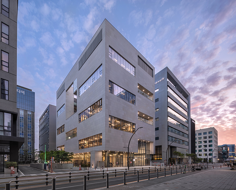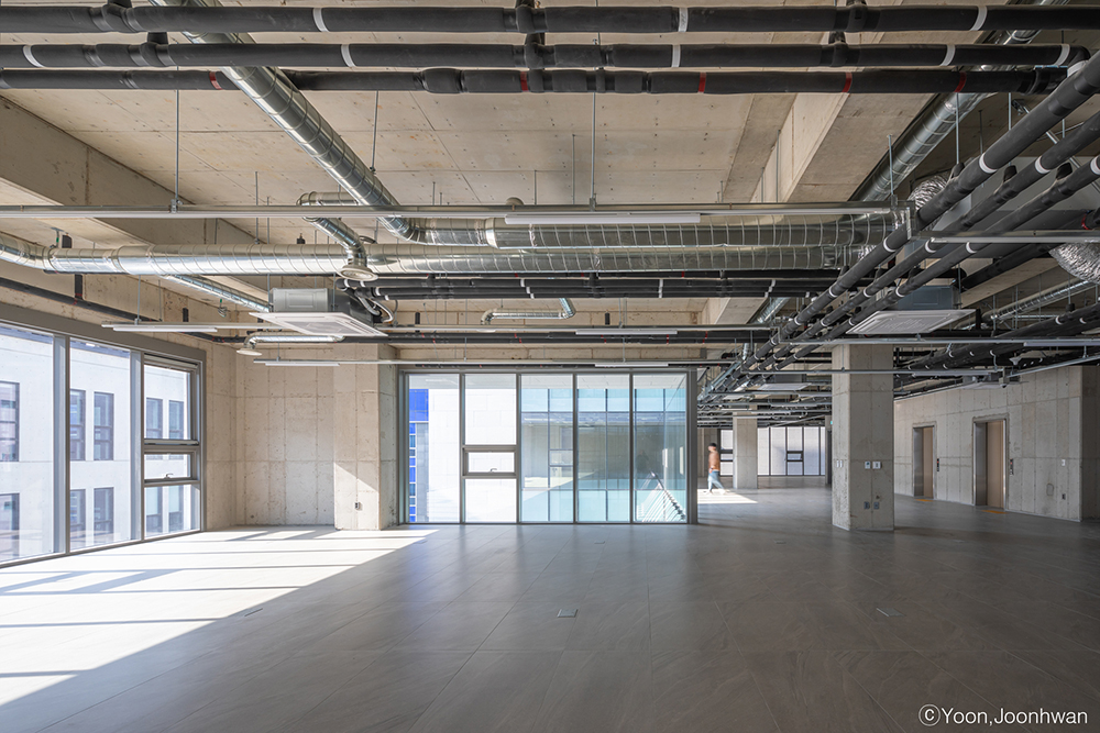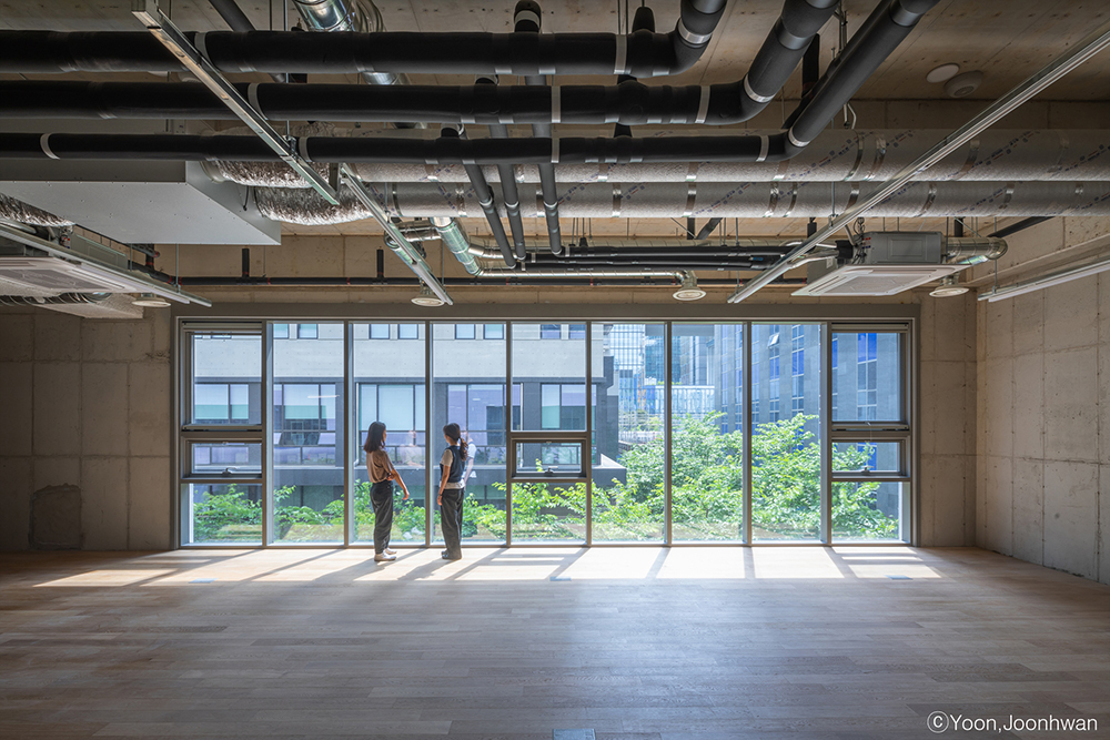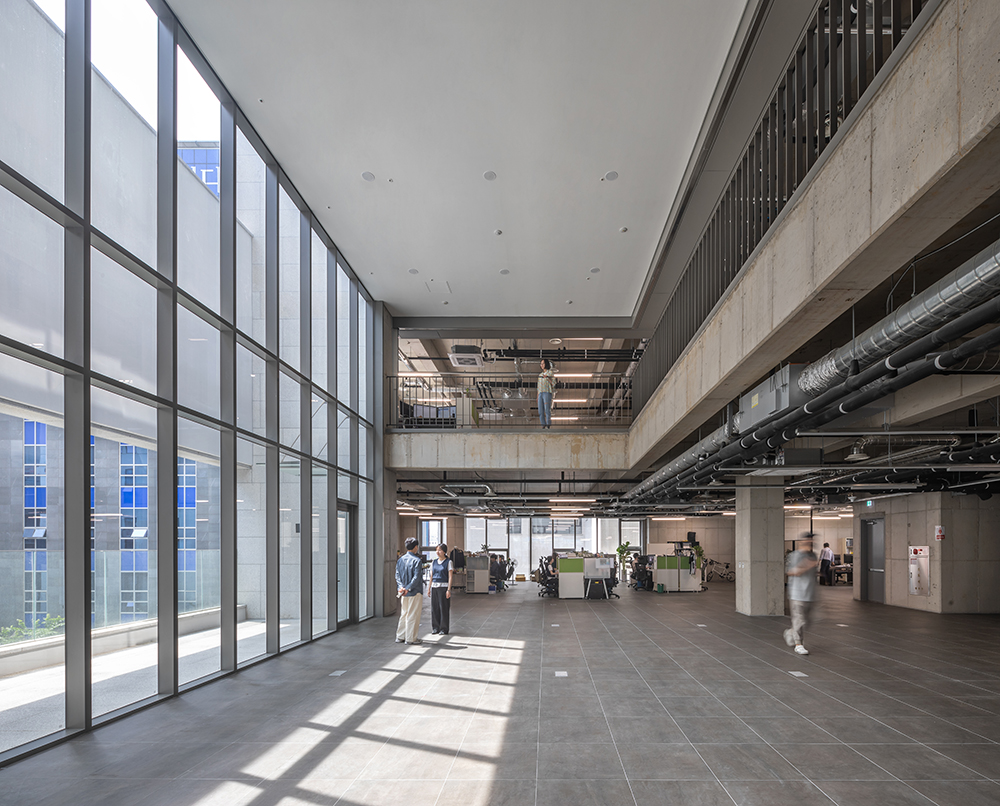 Recently, it is difficult for companies to disregard the environmental aspect. By securing a lounging space at an additional distance to the left, the atmosphere of the pedestrian path and the first floor was improved, and this emphasizes the company's eco-friendly image. It is also the reason why we retreated from the entrance on the first floor and opened the windbreak room. The building also actively accommodates environmental elements such as a yard, trees, and light on each floor. On the other hand, the flat surface maximizes efficiency by closely adhering to the core, and secures flexibility by minimizing the internal pillars. This is an architectural consideration that accommodates the growth and change of the company. Meanwhile, a comfortable working environment was provided by arranging living rooms on the west core, east and south sides, and a rest area was created by installing a rooftop and a balcony on the base floor. Sliding windows on the balcony improve building ventilation, and the stairwell with light and ventilation invites pedestrians. Although it is a small part, these are architectural devices that help the healthy and open corporate culture that the CEO dreams of.