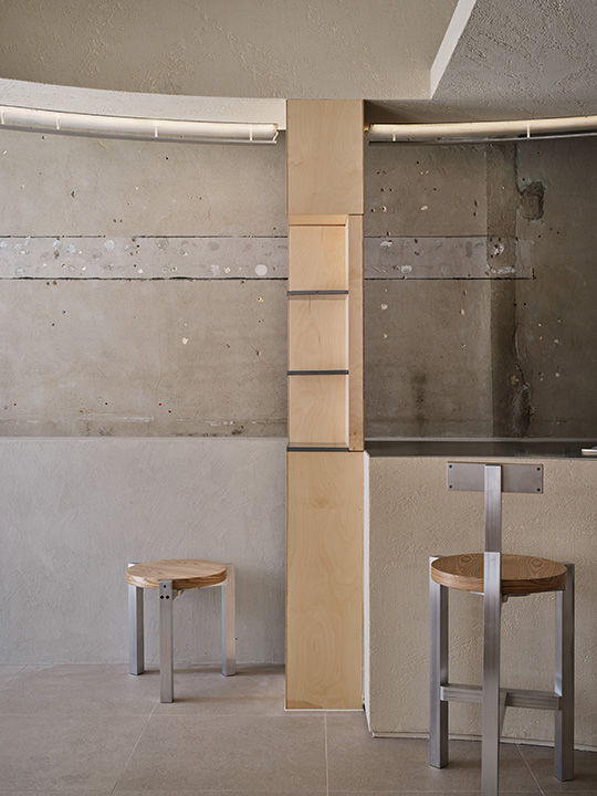 In addition, we erected the masonry bricks remaining in the existing store and utilized the unified vintage wall that had been plastered as a background for the circular mass, which is a consideration for regular customers who like the friendly image of the store before the renovation.
