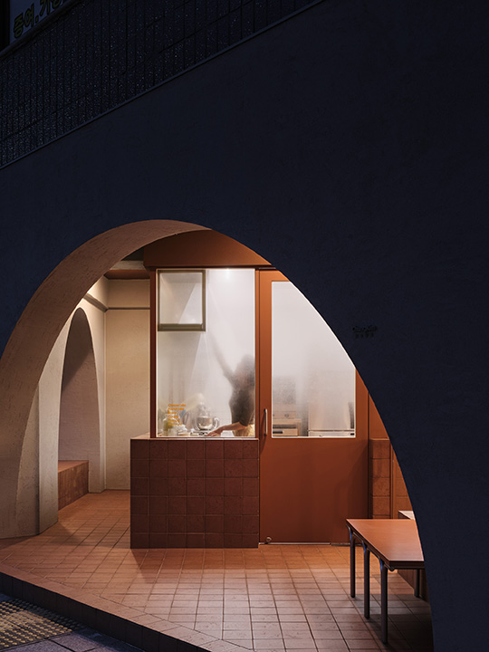 공간은 크게 파사드, 필로티, 실내로 구성되어 있습니다. 기존에 있던 4개의 건축 기둥을 새로운 형태로 연결하여 열린 파사드를 만들었고, 열려있는 입면의 형태는 저녁이 되면 내부의 빛을 통해 더욱 뚜렷하게 드러나 시각적 대비를 만들어 냅니다.