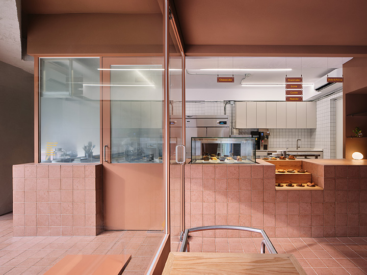 Some open piloti spaces naturally lead to the interior, providing room for purchase and stay, where free-moving guests catch the eye. The deepest kitchen windows in the space blur out everything else so that you can focus on the bread making process.