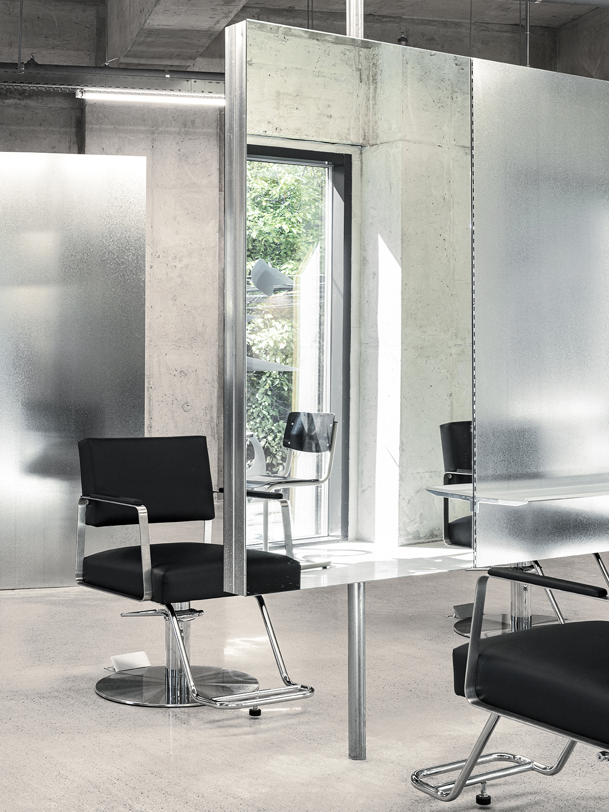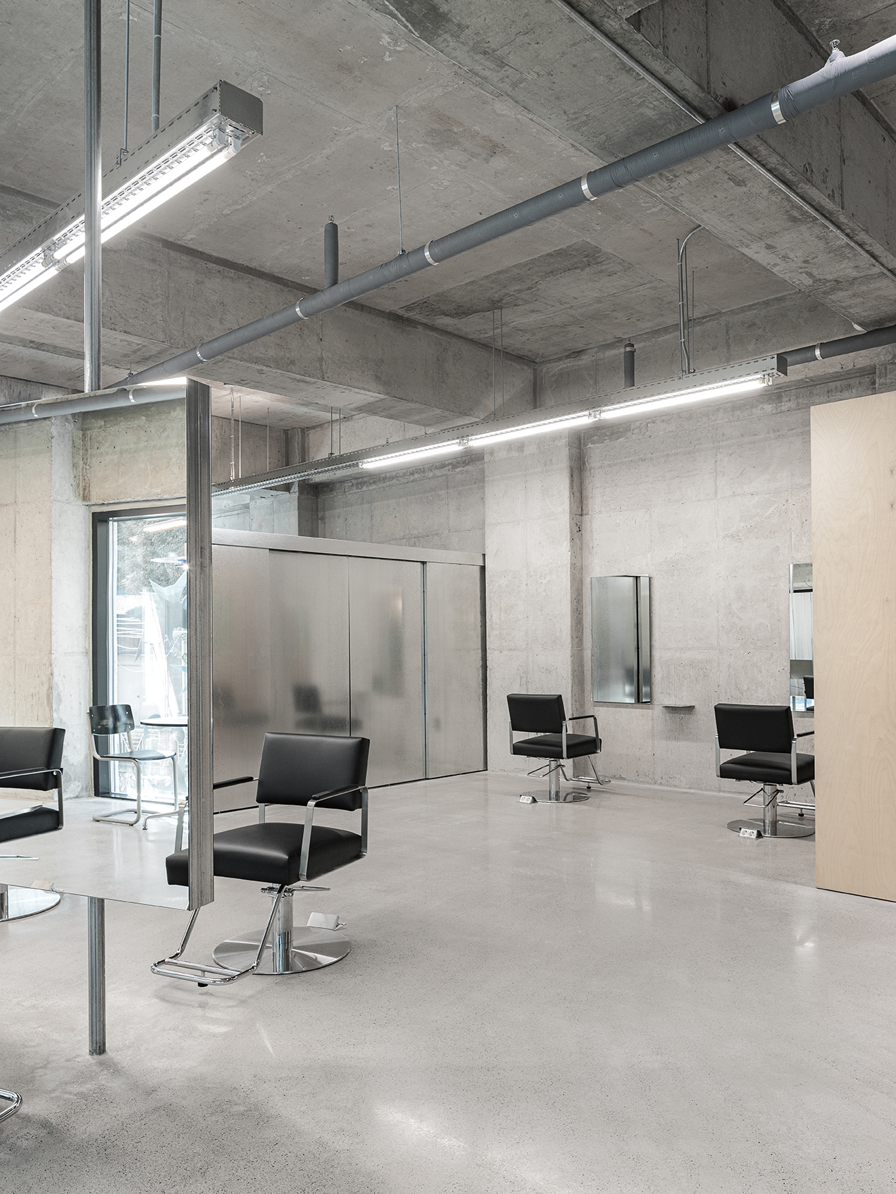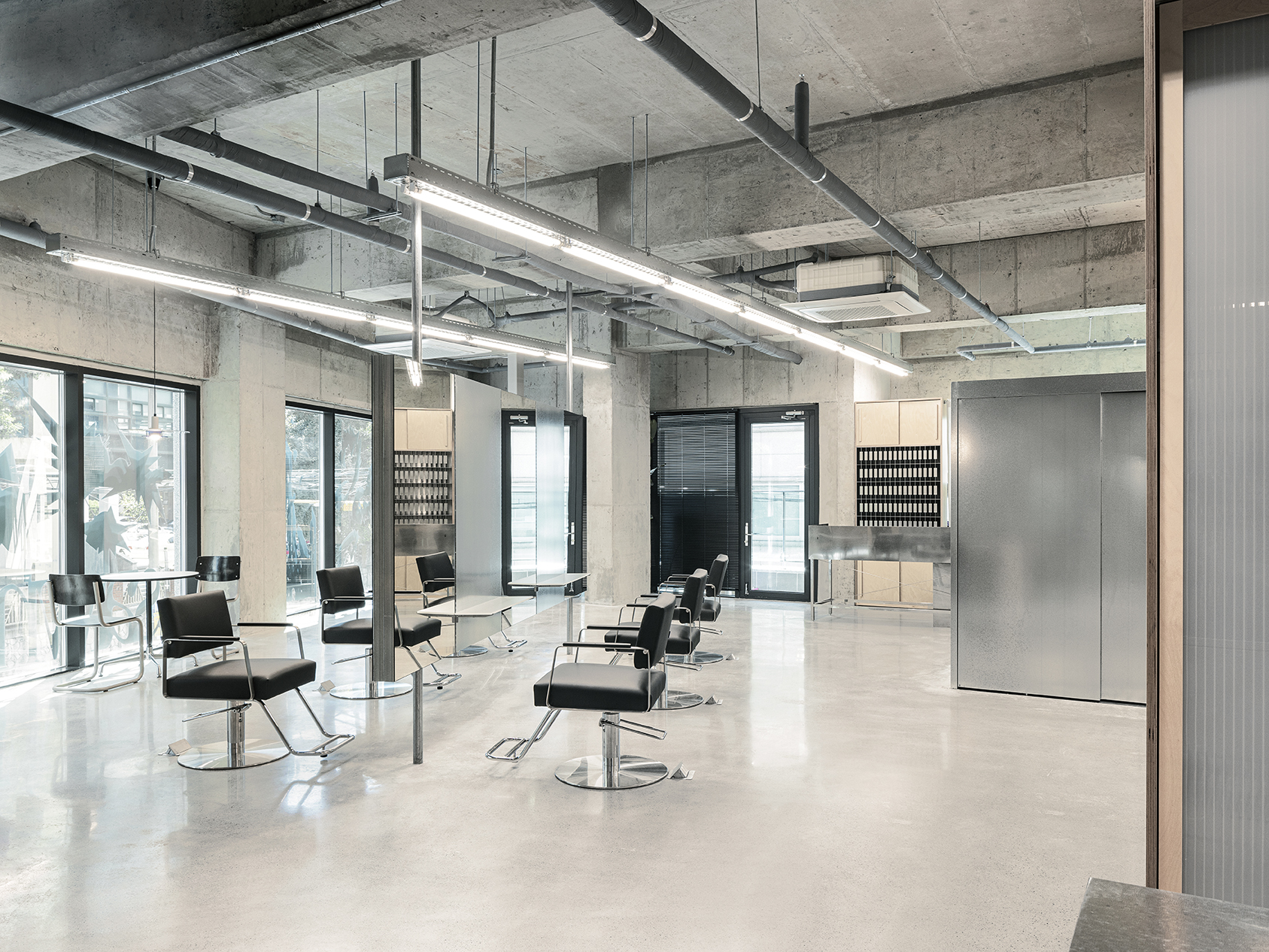 콘크리트 중심의 공간에 자작합판과 아연강판, 거울 소재를 사용하여 대비를 통해 정돈되어 있으면서 개성이 돋보이는 공간으로 계획하였다. 단순한 기능으로의 경대가 아닌 파티션과 구조의 기능까지 더하여 고객들과 작업 동선을 만들어 주고 아연강판 가구, 자작합판 가구 등의 배치로 공간의 레이아웃을 정해주었다. 배관과 전선을 최소로 노출하기 위해 사용한 트레이를 조명으로 사용함으로써 기능을 통해 심미적인 요소를 만들어주었으며 전체적으로 정돈되어진 형태를 갖게 된다. 전체적인 공간의 분리를 벽이 아닌 가구들, 혹은 상부까지 막히지 않는 구조를 통해 공간의 답답함을 해소하고 각 섹션을 보는 재미까지 주어진다. 정형화 되어있는 헤어샵의 공간분리보다는 고객들에게 자유로운 동선을 주어지며 편하게 자신의 집과 같이 사용할 수 있도록 가구들을 배치하였다. 이는 브랜드가 추구하는 편한 분위기의 자유롭게 헤어샵을 방문하길 바라는 방향성에서 시작되었다.