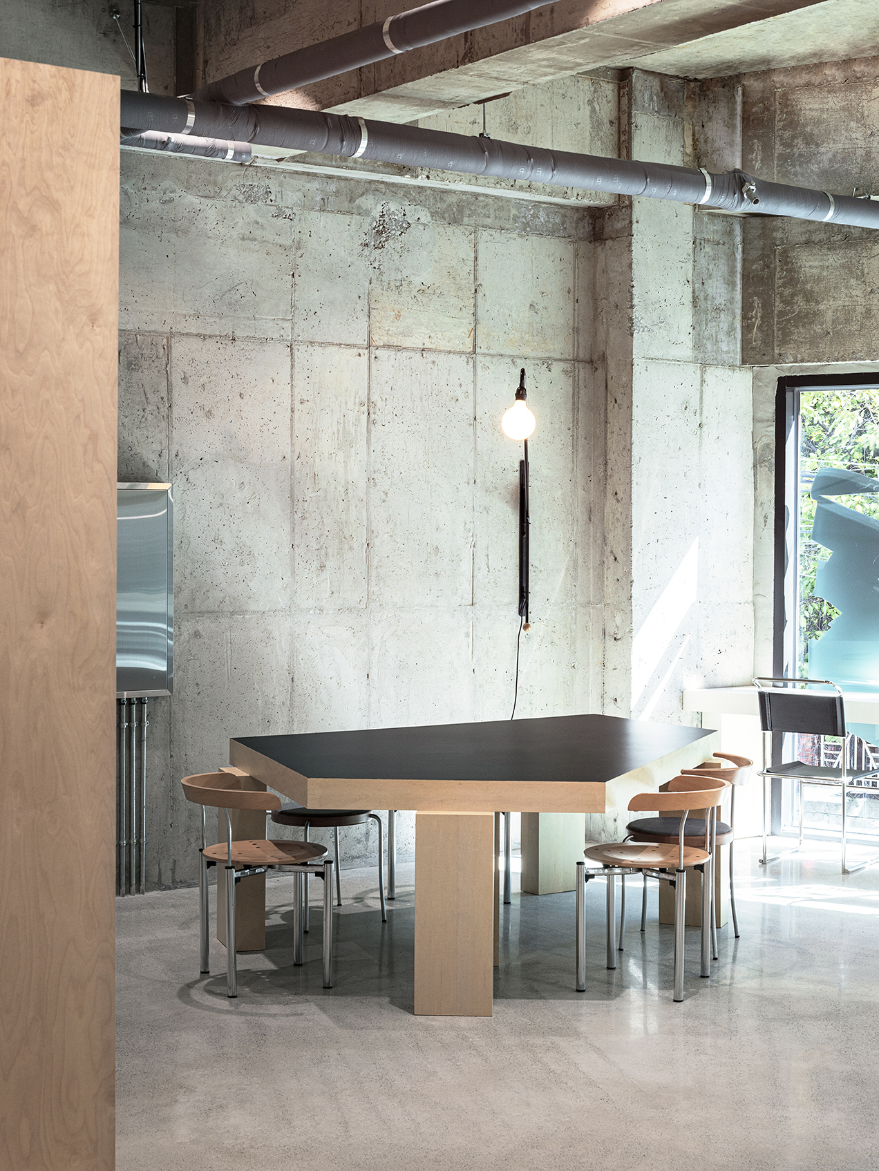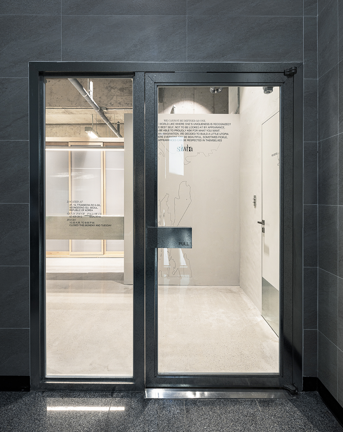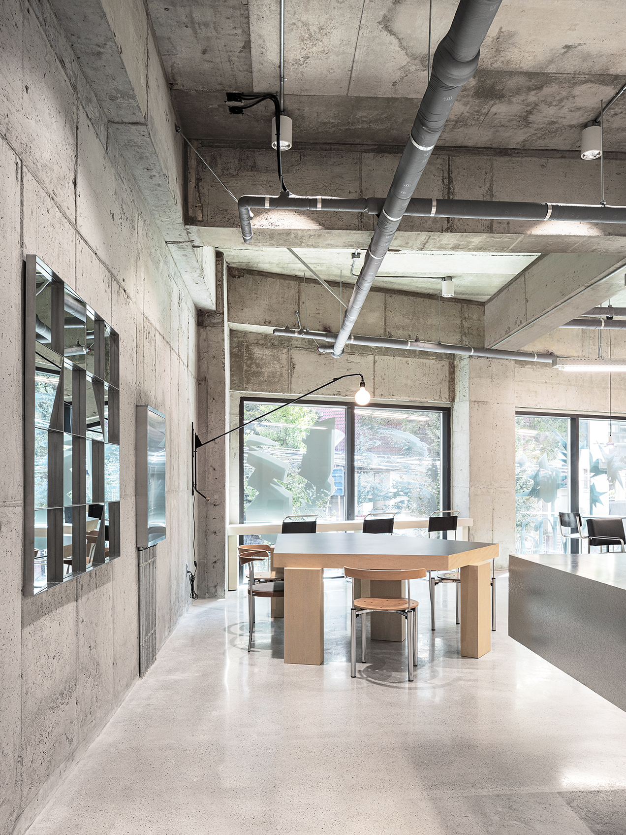 The concrete-centered space was planned to be a space that is organized and unique through contrast using self-made plywood, zinc steel plates, and mirror materials. Not just a simple function, but a partition and structure function were added to create a working path with customers, and the layout of the space was determined by the arrangement of zinc steel sheet furniture and self-made ply. By using the tray used for minimal exposure to pipes and wires as lighting, it creates aesthetic elements through its function and has an organized shape overall.