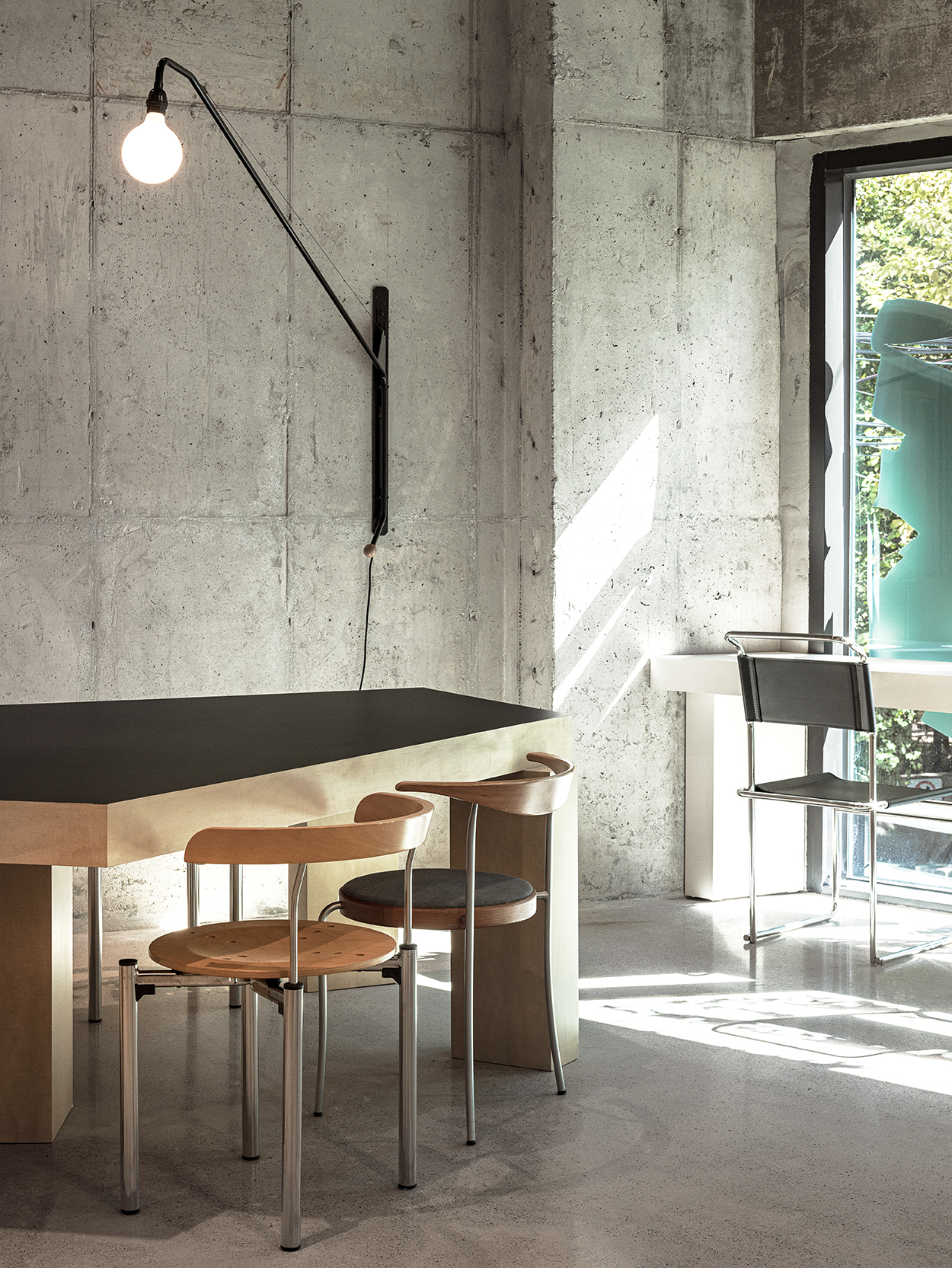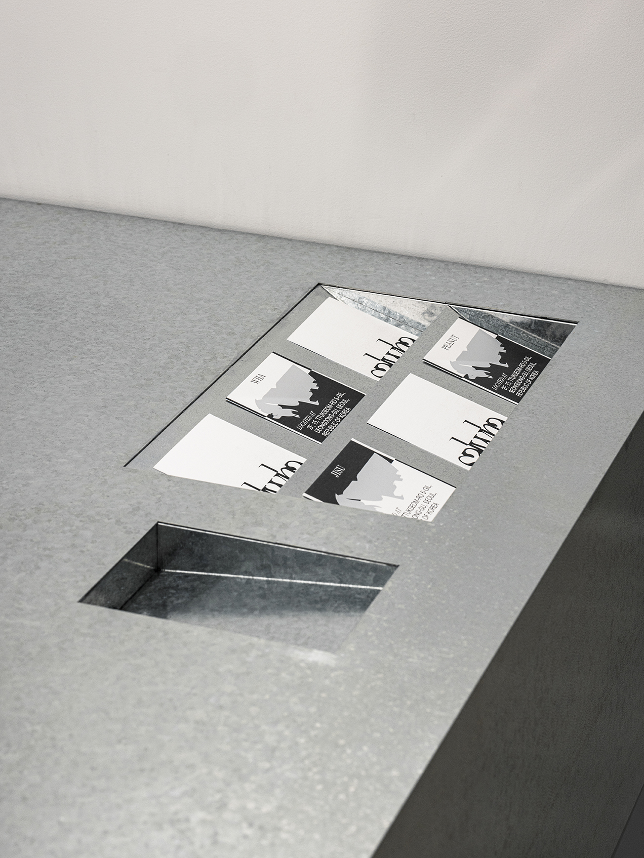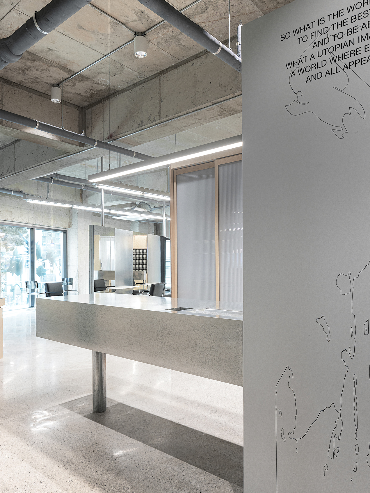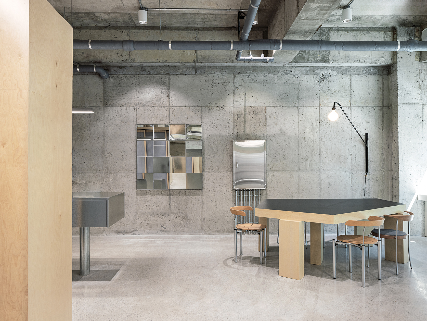The concrete-centered space was planned to be a space that is organized and unique through contrast using self-made plywood, zinc steel plates, and mirror materials. Not just a simple function, but a partition and structure function were added to create a working path with customers, and the layout of the space was determined by the arrangement of zinc steel sheet furniture and self-made ply. By using the tray used for minimal exposure to pipes and wires as lighting, it creates aesthetic elements through its function and has an organized shape overall.