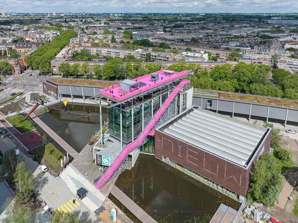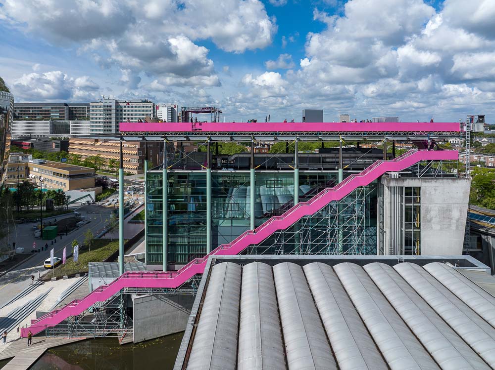Last week, on Ascension Day, saw the opening of that other high-level installation, the Rotterdam Rooftop Walk, opened. For a small fee, visitors can stroll on an orange carpet over various roofs, with the highlight of the walk being a bridge spanning the Coolsingel. The Rooftop Walk is an initiative of the Rotterdamse Dakendagen and was designed in collaboration with MVRDV. The installation will be on display until June 24 and was already sold out this weekend. The extensive programming on the carpet should make visitors more aware of what is possible on roofs: from a platform for drones that deliver parcels, thus reducing traffic jams, to rooftop gardens and various solutions for water storage, to a small village.