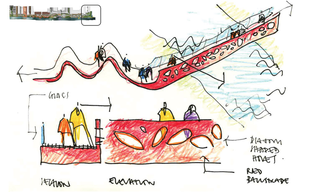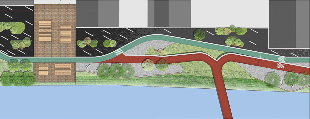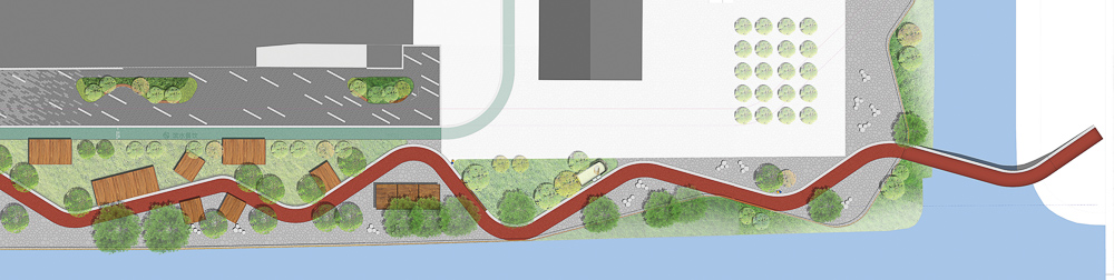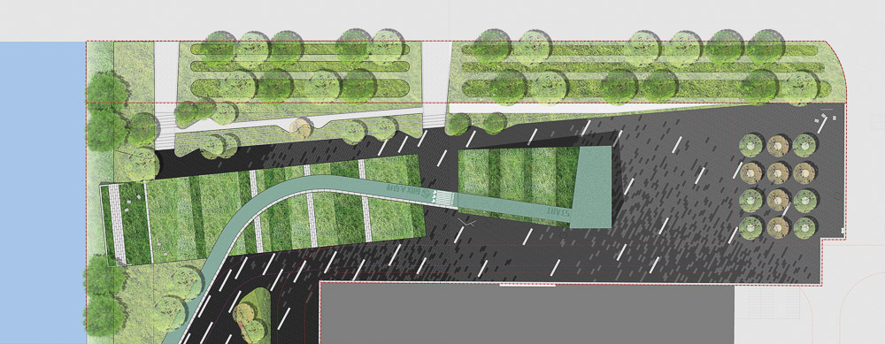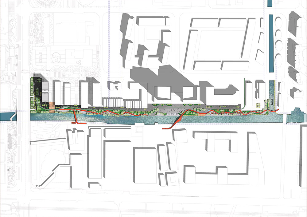 이 프로젝트는 750m 길이의 휴식 환경을 조성해 정부와 지역 주민이 원하는 더 나은 보행 환경과 지속 가능한 생활 환경을 만드는데 도움을 준다. 디자인 콘셉트는 단세포인 규조(Diatom)을 반복되는 디자인으로 사용했다. 규조류는 자연적으로 물을 깨끗하게 만드는 단세포 무리로 다양하고 아름다운 형태를 하고 있다. 규조의 형태를 강둑을 움직이는 2차원과 3차원 물체로 추상화해 강과 환경을 재생하는 이야기를 들려주었다. 강변 디자인에는 도보, 조깅과 자전거 트랙이 있는 녹색 리본과 주거, 교육과 비즈니스 커뮤니티들을 연결하는 3개의 보행자 다리가 포함되어 있다. 뚜렷하게 나누어진 4개의 조경 구역은 조망을 강화하고 처음으로 강에 접근하기 쉽게 만들어졌다. 추상화된 강둑의 형태를 한 직선 구역은 잔디밭, 카페, 스포츠 공원과 이벤트 광장 등의 혁신적인 활동 공간을 제공한다. 또한, 달라진 환경의 이야기와 접근성에 도움을 줄 수 있도록 맞춤형 표지판과 가구를 디자인했다.