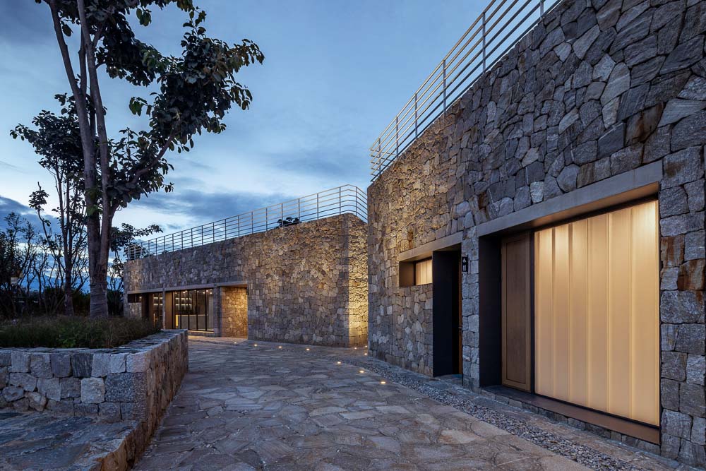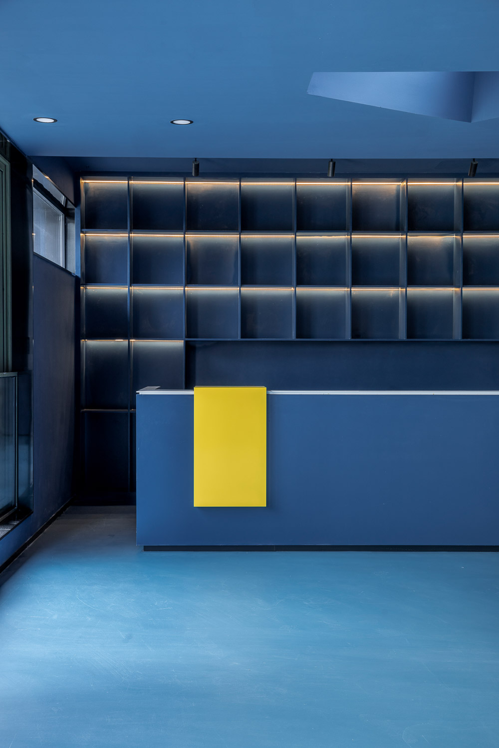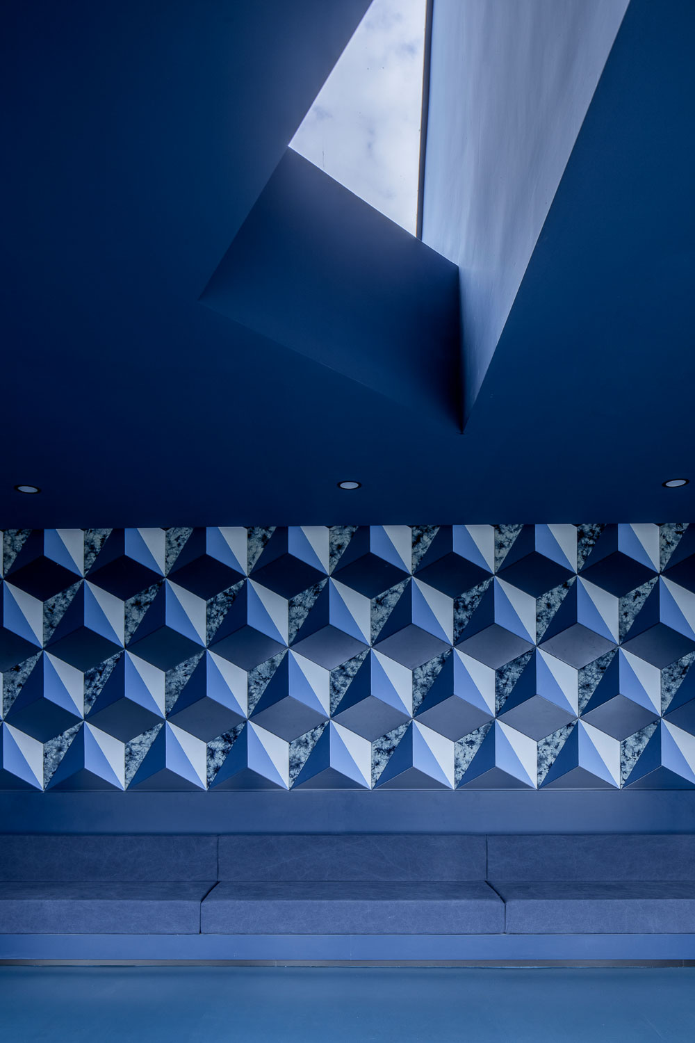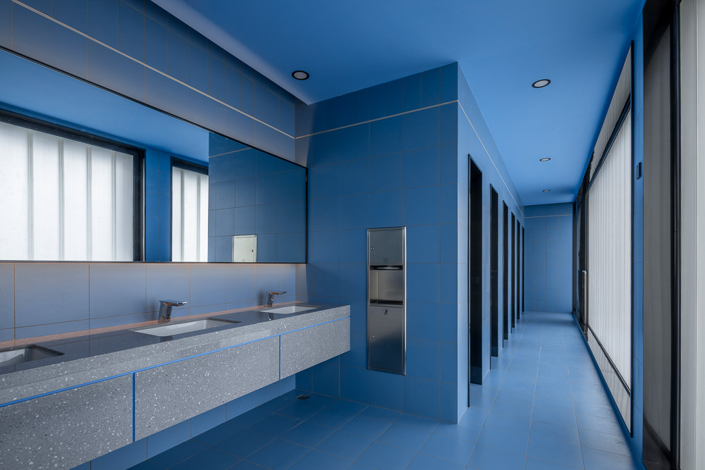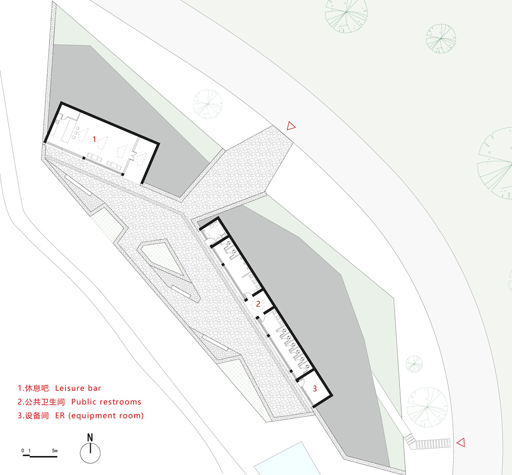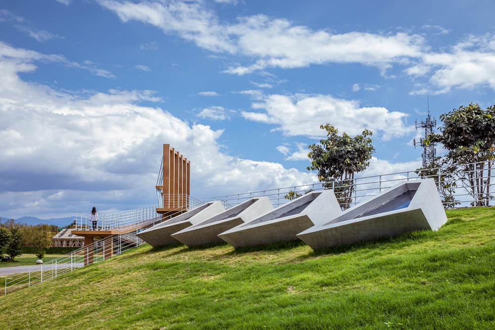 The building consists of three functional spaces: a semi underground covered public restroom and leisure bar and an observation platform standing on the hill. The entrance of the restroom and leisure bar is in the west of the site. People enter from the gap in the middle of the hill, which is relatively quiet and private. The main body of the building is reinforced concrete structure, and the external wall adopts local masonry technology. The indoor of the leisure bar use emphasized colors: the representative blue of tie dyeing technology is extracted to become the main tone of the space, and the bright yellow added on the vertical board of the water table has a comparative and specific effect. The interior of restroom is also blue. The entrance is specially designed with a circular water ripple device and a circular skylight. When the light enters, the three circles echo each other, increasing the interest of the space. The observation platform and sail are the signs of the area. Through the Z-shaped ramp, people can reach the 6.5m-high platform. This is a rare high point in the greenway park around Erhai Lake where one can overlook the scenery of Erhai Lake over the treetops.