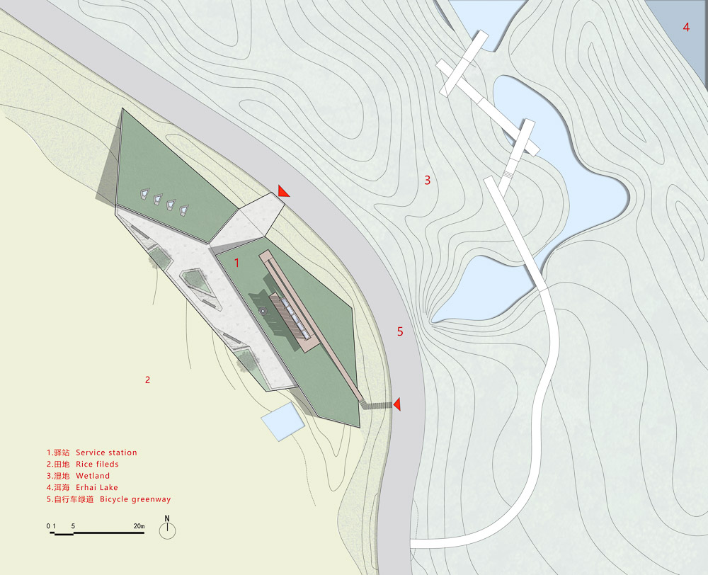The service station is a part of the bicycle greenway system around Erhai Lake. The east side of the site is close to the bicycle lane, about 50m to the east is Erhai Lake, and the west side is Xiajiyi Village and a large area of farmland, overlooking Cangshan Mountain.