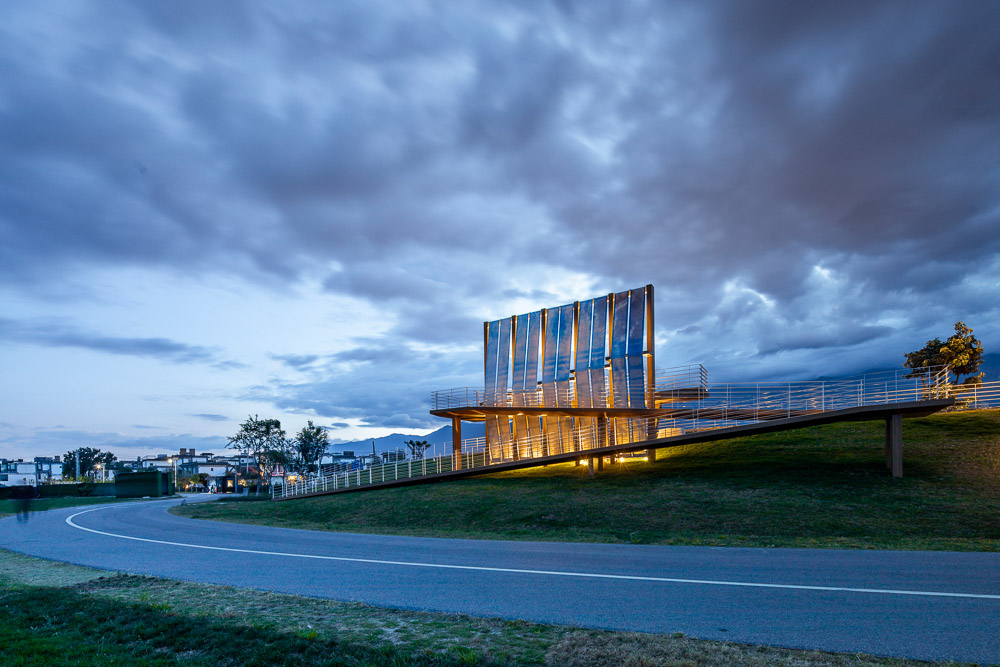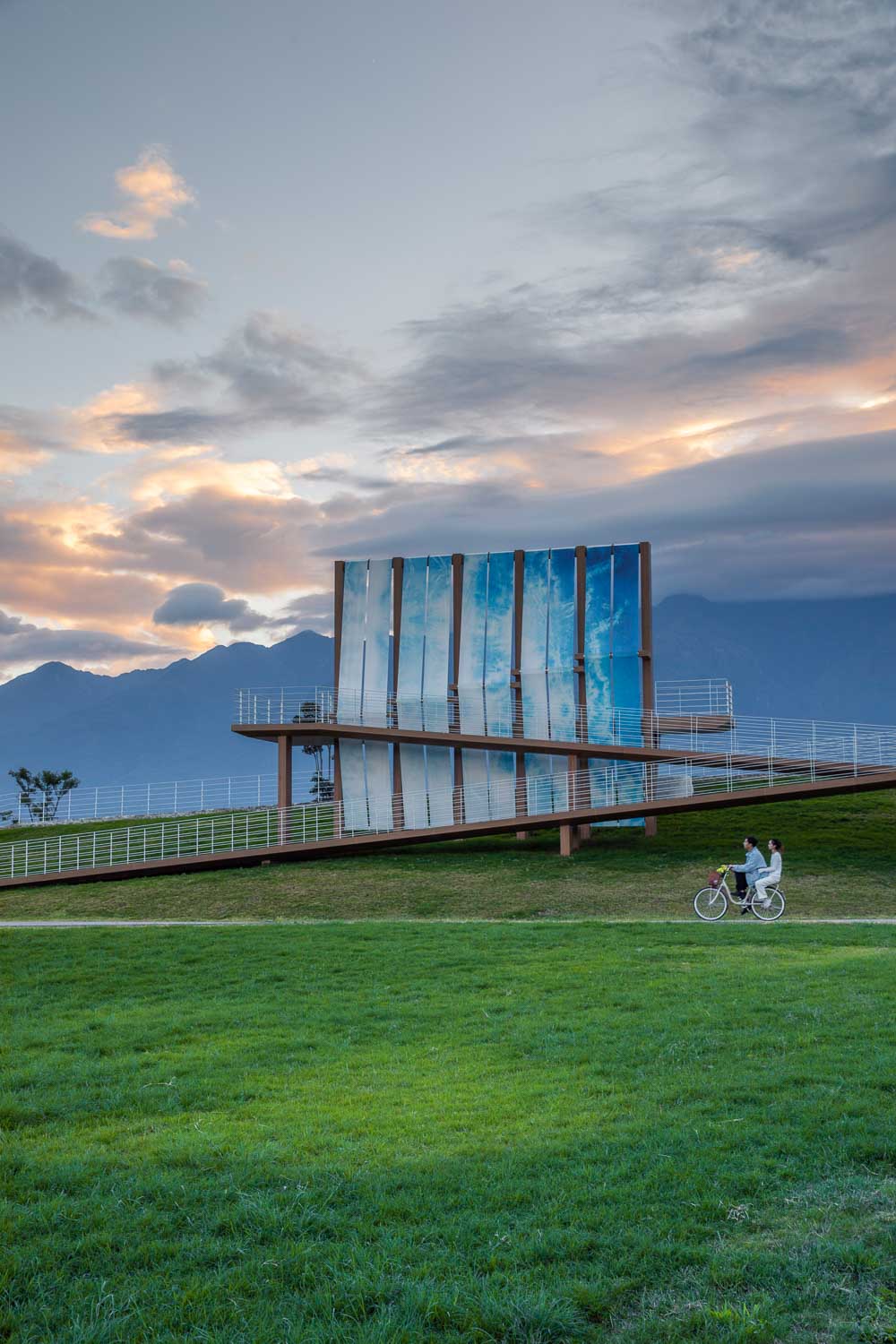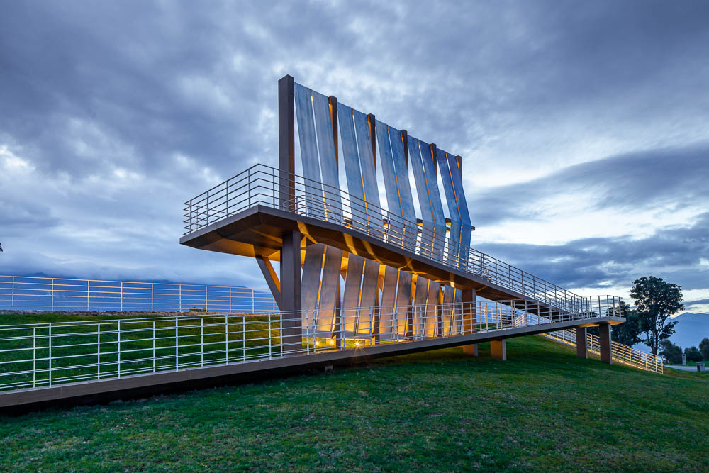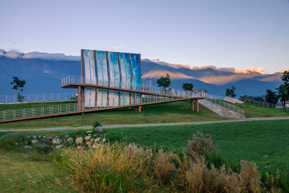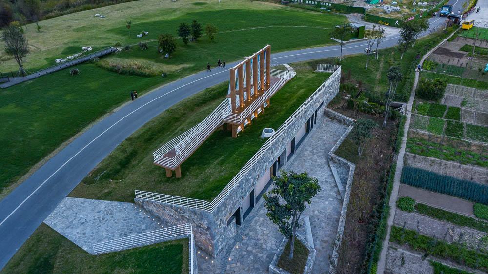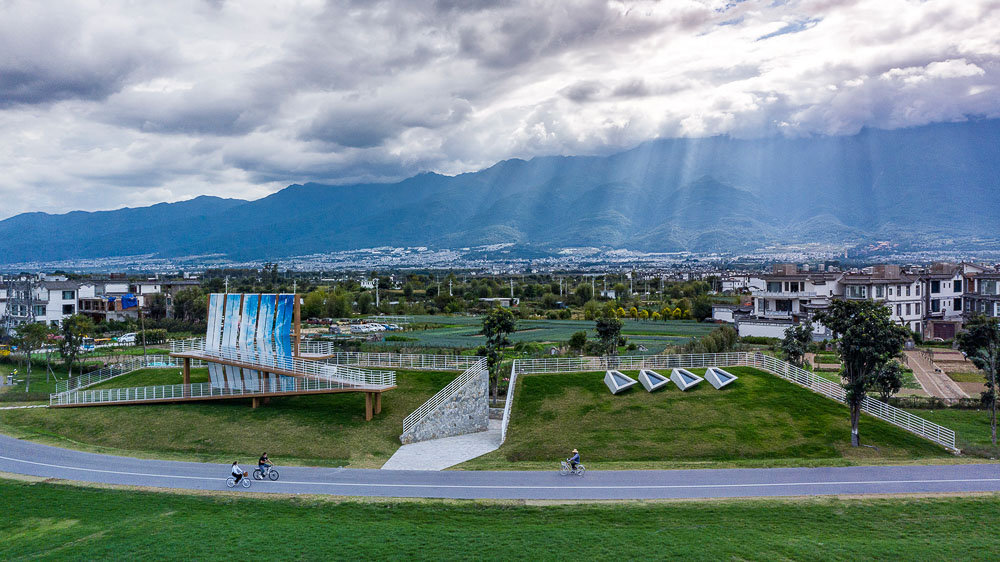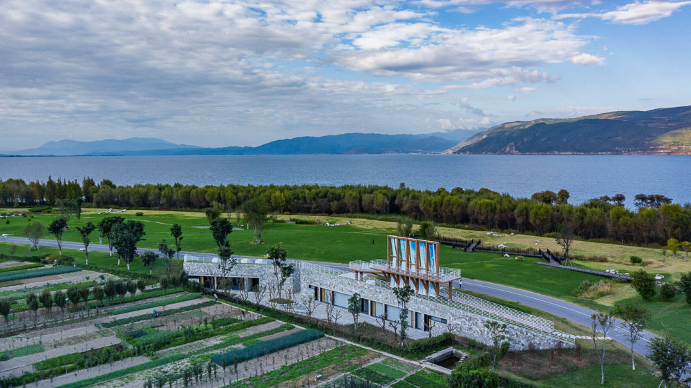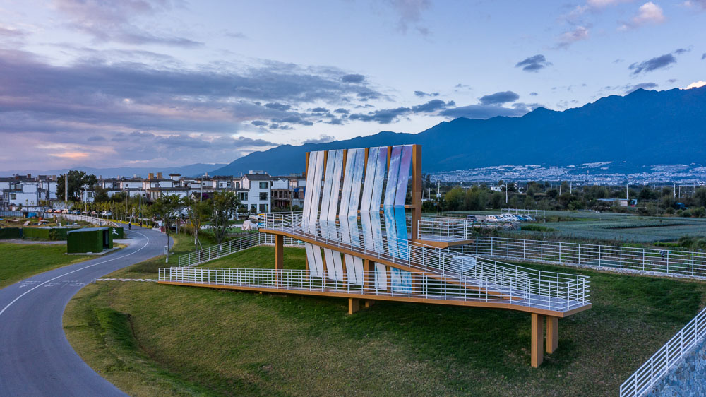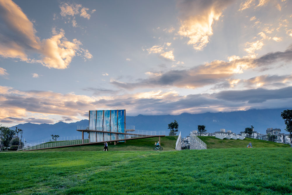 The design inspiration comes from the commemoration of Dali Bai ethnic group’s traditional sailboat. The designer uses the height difference of the site to bury the functional space in the semi underground on the side facing away from Erhai Lake, and realizes the effect of green hill through roof soil covering and green planting. Above it is a sail of 9m high and 14m wide. The cloth surface of the sail adopts the traditional tie dyeing pattern of the Bai nationality, with the blue and white colors echoing the sky of Dali.