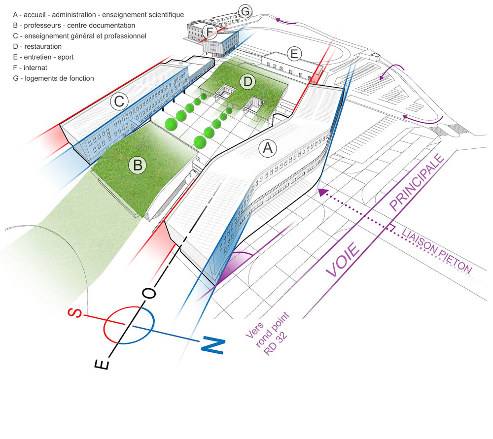 With a Batiment a Energie POSitive (BEPOS - building produces more energy than it consumes) objective, the programme generated a legible layout around a courtyard surrounded by the two 3-storey north-south oriented teaching blocks and buildings with atypical functions - the east-west oriented Documentation Centre and canteen. The parallelogram form of the courtyard results from the superimposition of the access road and north-south building orientation. Due to the differing volumes, it generates spaces with distinct functions, while enabling for optimal surveillance. Independent of the educational facility, the boarding school and staff accommodation are located outside the courtyard, opposite the sports field. In three superimposed curves, the reception building unrolls like a ribbon to form a welcoming entrance - its awning supported on elegant V-shaped columns of ultra high-performance fibre-reinforced concrete(UHPC), the front section of level 1 accommodating the administration and then, the setback volume of level 2. Also acting as a signal, green progressively tints the reception building curve to highlight the entrance porch from a distance by capturing the rays of the rising sun. Likewise, on arrival by the RD32 roundabout, the two gables of the teaching blocks, which frame the facade of the reading room, are clad in a predominantly green terracotta mesh that serves as the background to the portrait of Simone Veil.