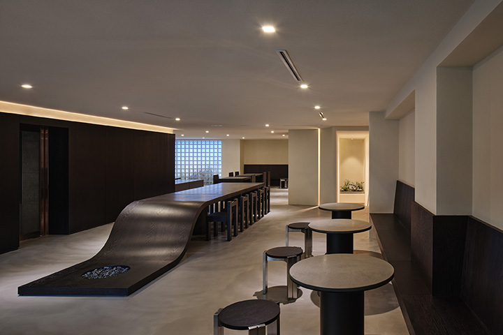 The curved earth wall, which crosses and supports the center of the 11-story building, is a device that divides the space, functions as an axis that induces gaze, and transmits the texture of nature with touch. The ceiling is wound and hung so that the gaze does not face the outside, but the space expands as it is away from the ground, taking in light and extending the floor to the outside. The two-story space, completely blocked from the outside, maximizes the five senses through sensory devices. The image projected from the media wall is refracted and blurred in the process of passing through the glass block, and the incomplete visual information delivered in this way actively accepts auditory information and delivers the image intact to our minds. The sound of wind in the bamboo forest, the sound of waves by the sea, and the sound of flames burning in the fireplace make our hearts comfortable. In addition, we would like to provide us with a moment of "true rest" along with the aroma scent from nature, the texture of the wall expressing the soil layer, and the fullness of bread.
