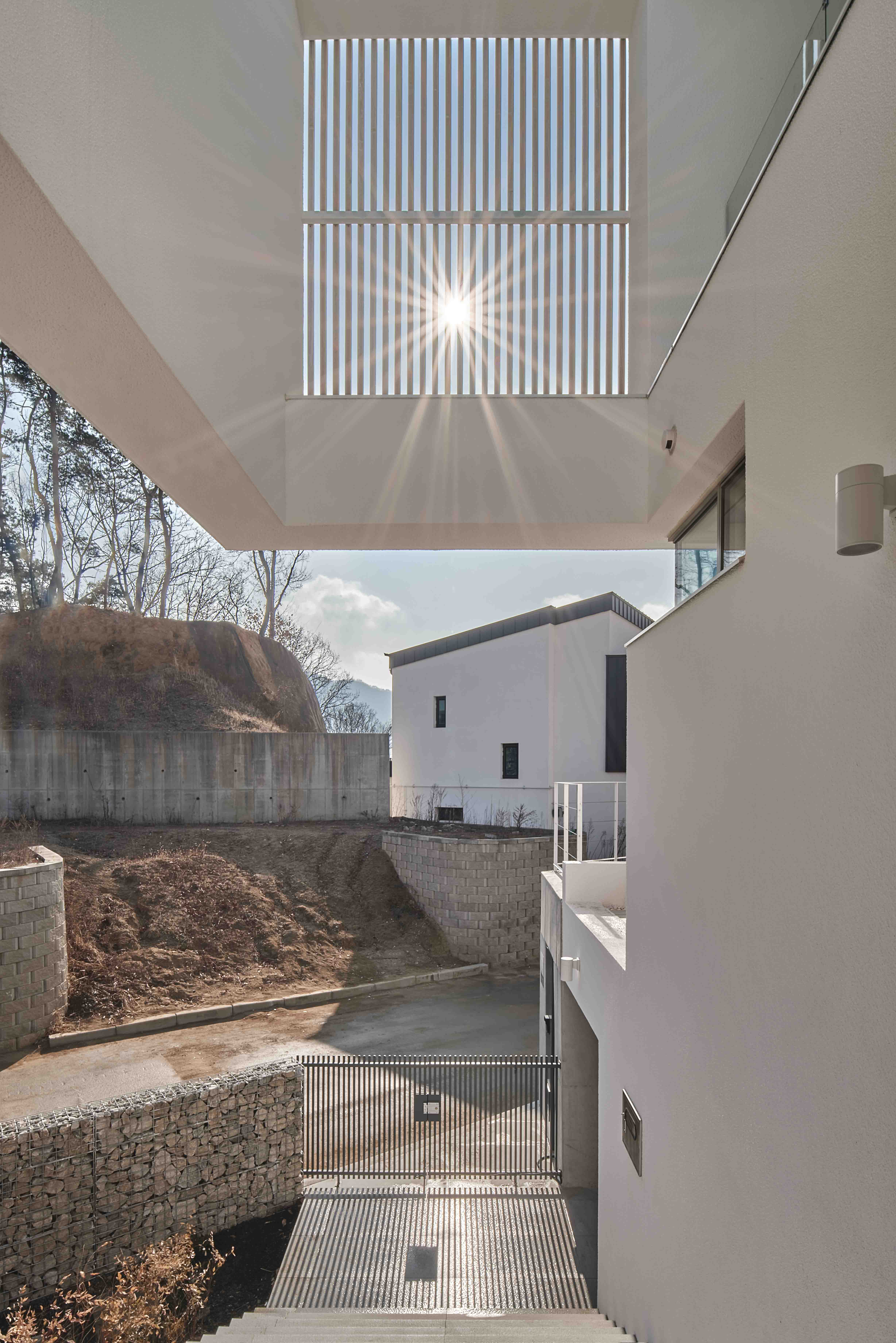 A land which has just been created or is still undergoing a building process is faced with a series of boundaries that cannot be defined. While it is an uncertain situation around the site, one finds the elements that will not change, and arrange the house employing this context. Since it is not a dense area which requires to be sensitively searched for by cadastral lines, it has been arranged to ensure that there is a gap between the site boundaries and adjacent sites. One could also avoid awkward encounters with neighbors of the surrounding houses by finding an angle which allows for an open view and opening up the boundaries between the site and the space by pivoting the house. Rather than a direct method of enclosing a wall or fence, it is about creating a spatial relationship. One elevates the ground to allow for an unobstructed view towards the direction in which the eyes are opened, and searches the shape of the ground so that the nature can percolate through the gap..