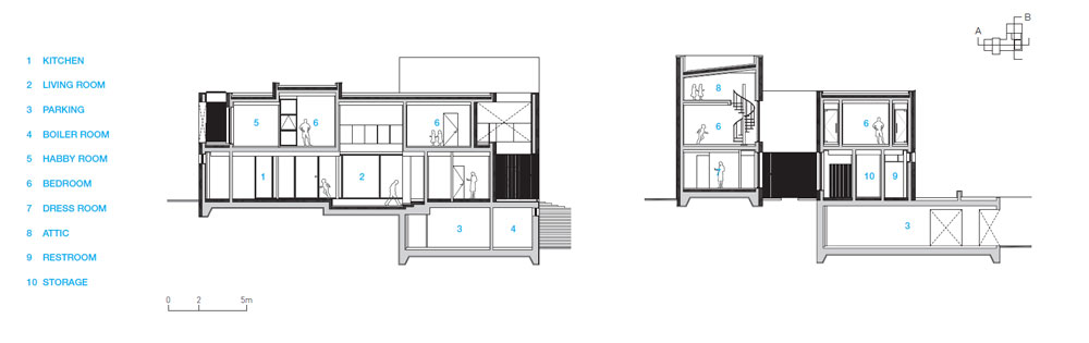 건축주 내외와 다섯 명의 자녀, 고양이까지 대가족의 일상을 상상해본다. 전에 살던 아파트도 작은 규모라고 할 수 없다. 열 식구의 삶이 기능적으로 파편화되면서 피로도가 높아진다. 공동주택의 합리적인 조합이 만드는 삶 속에 격리되어 일사불란하게 움직이지 않으면 흐트러진다. 그래서 여유를 찾기 위해 집을 벗어나 여행을 즐긴다.