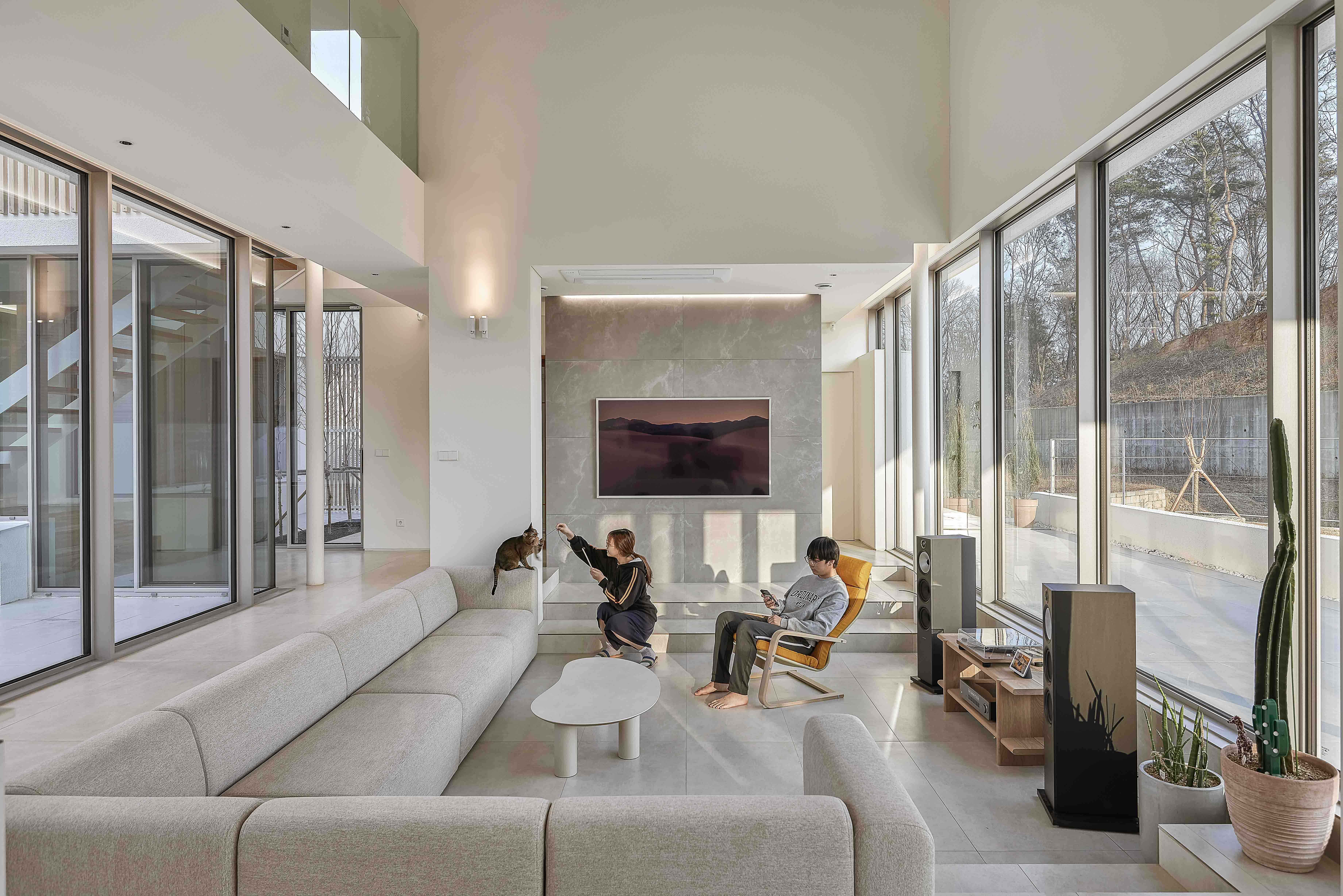 Imagine the daily life of a large family consisted of the owner couple, five children, and a cat. Even the apartment they lived in before was not small at all. Fatigue arises as the lives of a family of 10 become functionally fragmented. If one is isolated from the life created by a rational combination of apartment houses and does not move in harmony, one will be disturbed. Hence, in order to find a room to relax, one departs for a new destination away from home and enjoys traveling. The owner’s desire is to have a house where his family can relax and enjoy for daily life. In an apartment space where the density of family relationship was high, it was difficult to find a space for anyone to squeeze in. If the house were a physical and psychological form of spatial relationship, the tension of family relationship is also carried within the house. A relaxed space that releases a tense mind or atmosphere creates a gap, expands contact with natural elements, and naturally allows one to feel the changes of time. The bedrooms of the family are not arranged in parallel or according to a reasonable area, yet are distinguished for differentiated views, sunlight, and the sense of space. Consequently, the living room on the first floor remains with the nature through the courtyard, which is an external space, as an open structure rather than a walled house.