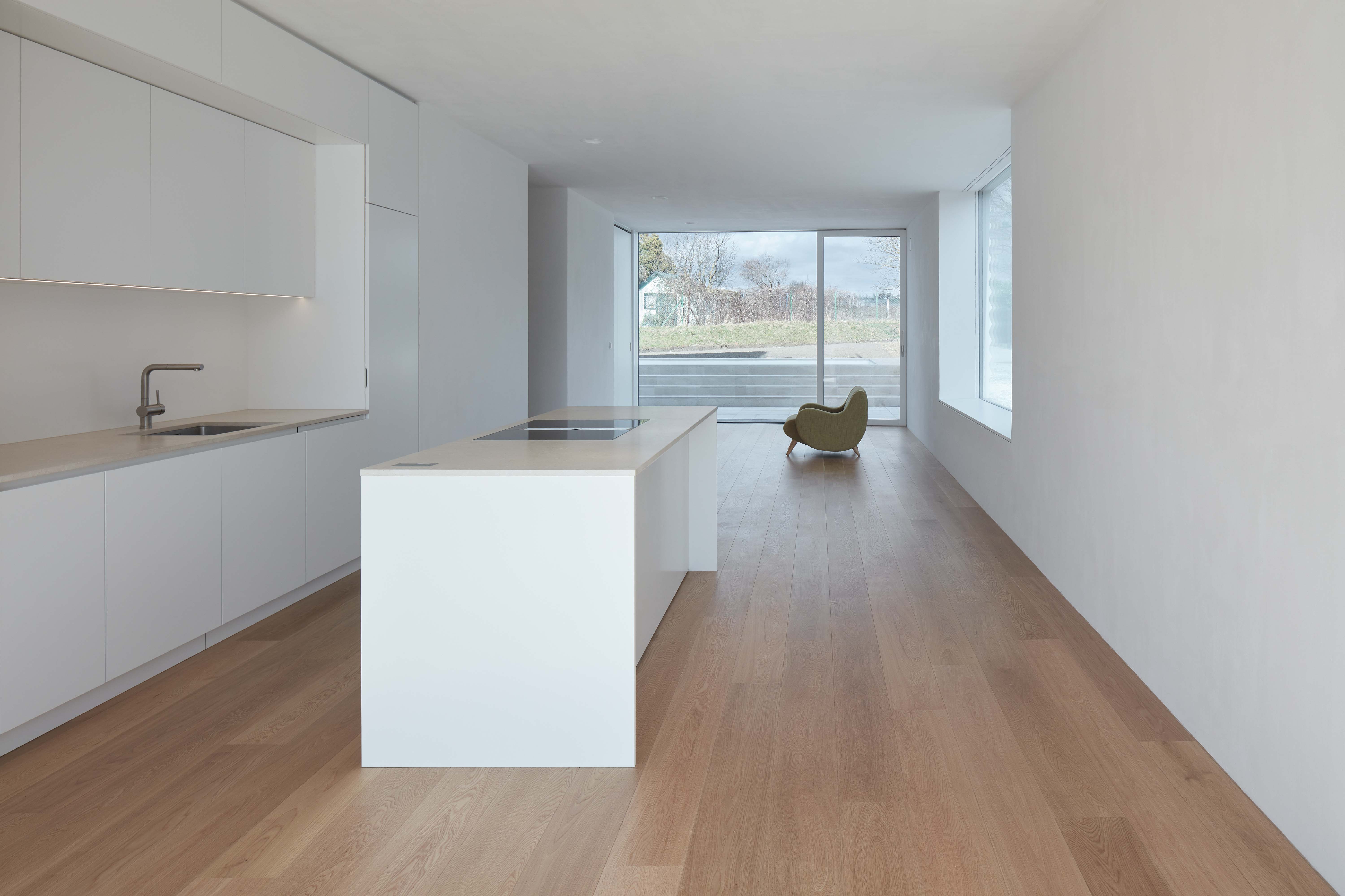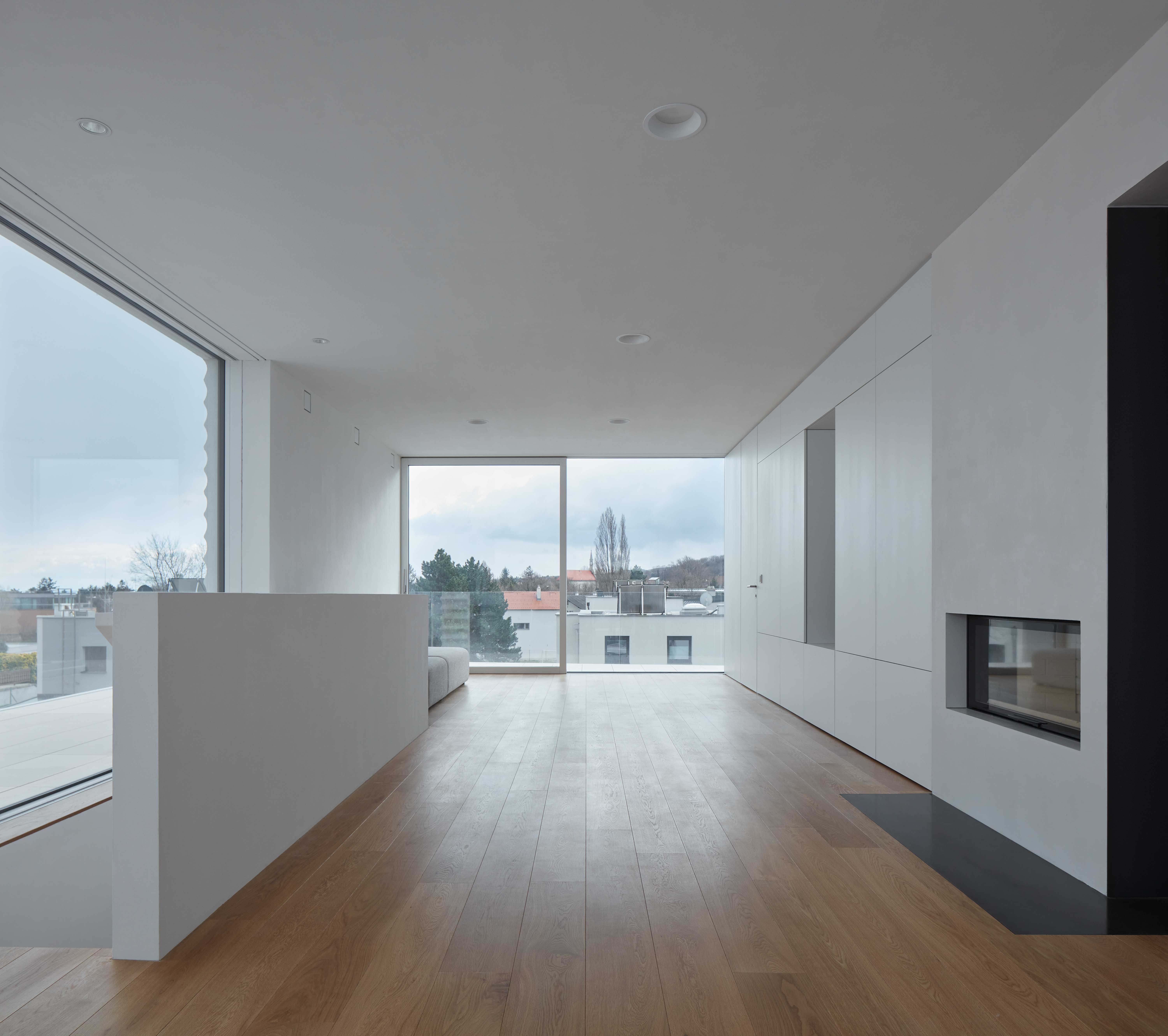 Imagining a villa, one pictures a sprawling complex of buildings and land, echoing dynastic opulence. For this villa commission in a quiet village outside of Vienna, Austria, I was challenged with maximizing the volume of a difficult and narrow plot of land in order to create a modern living space for a two-generation family. The first impression of the construction is of a container as a living space. However, the eye is soon drawn to the discrepancies between the use of ninety degree angles and a slightly deviating complementary angle. The friction between the two angles, used both in the wall structure and the floor plan, can be felt as movement throughout the entire structure. From the intimate entrance to the large open plan living space, this interaction between the perpendicular and the oblique defines a certain perception that pervades the experience of the structure. The outlines and the facade of the new house are reminiscent of the unique and traditional craftwork of Viennese houses. In the last decades, this craftsman work has largely been given over in favor of the standardized use of polystyrene and external plaster.