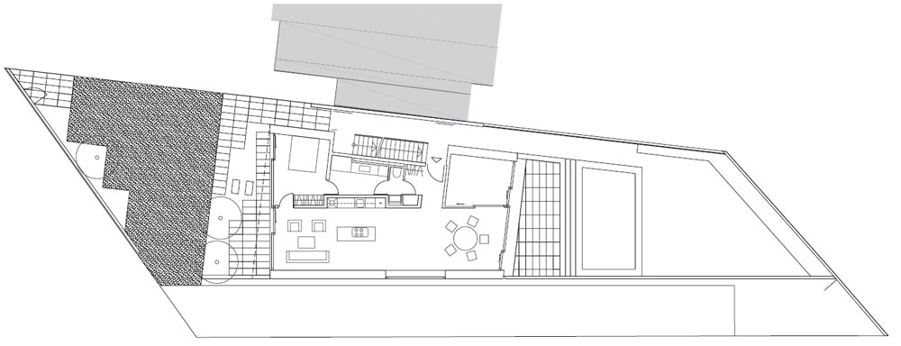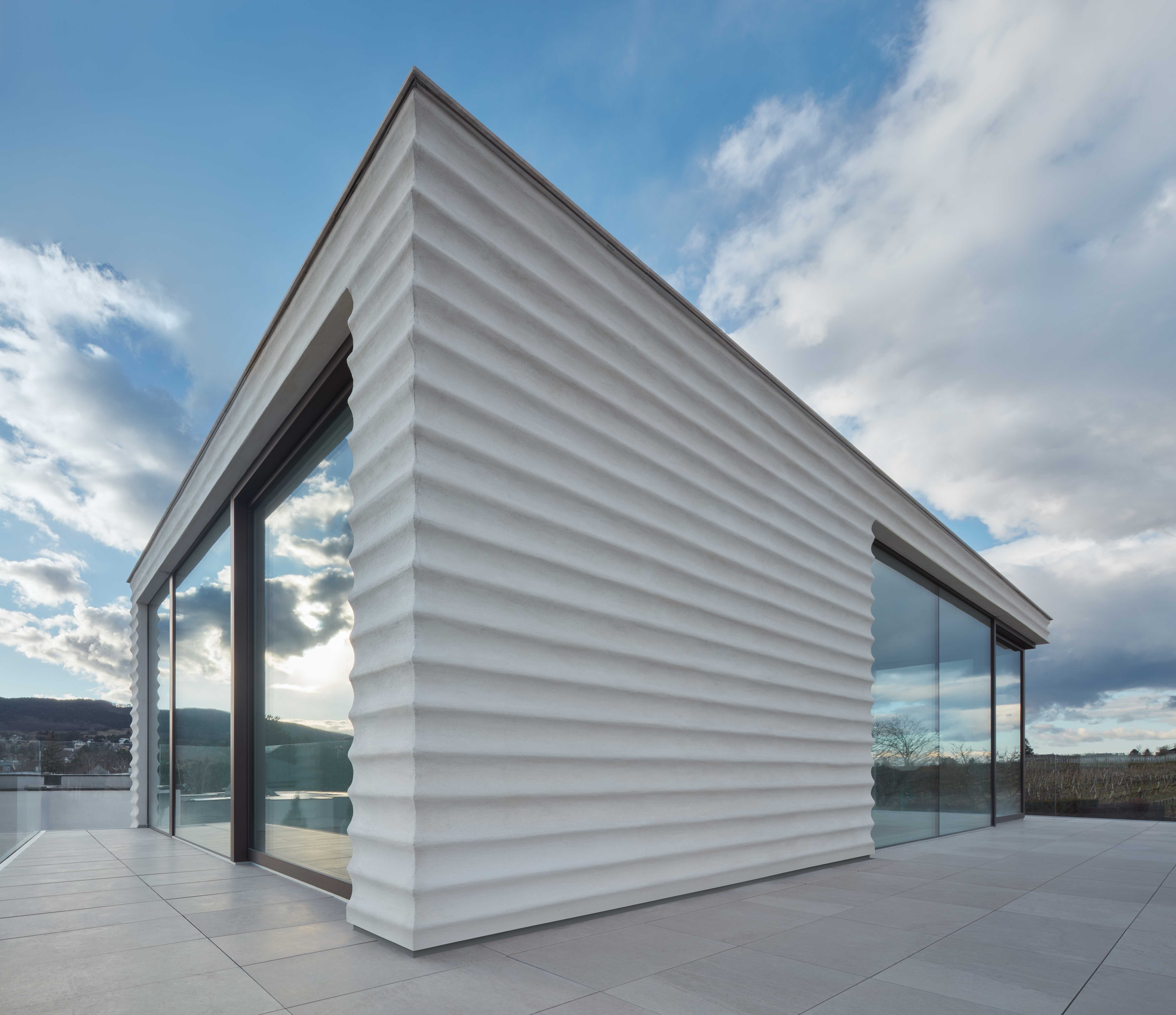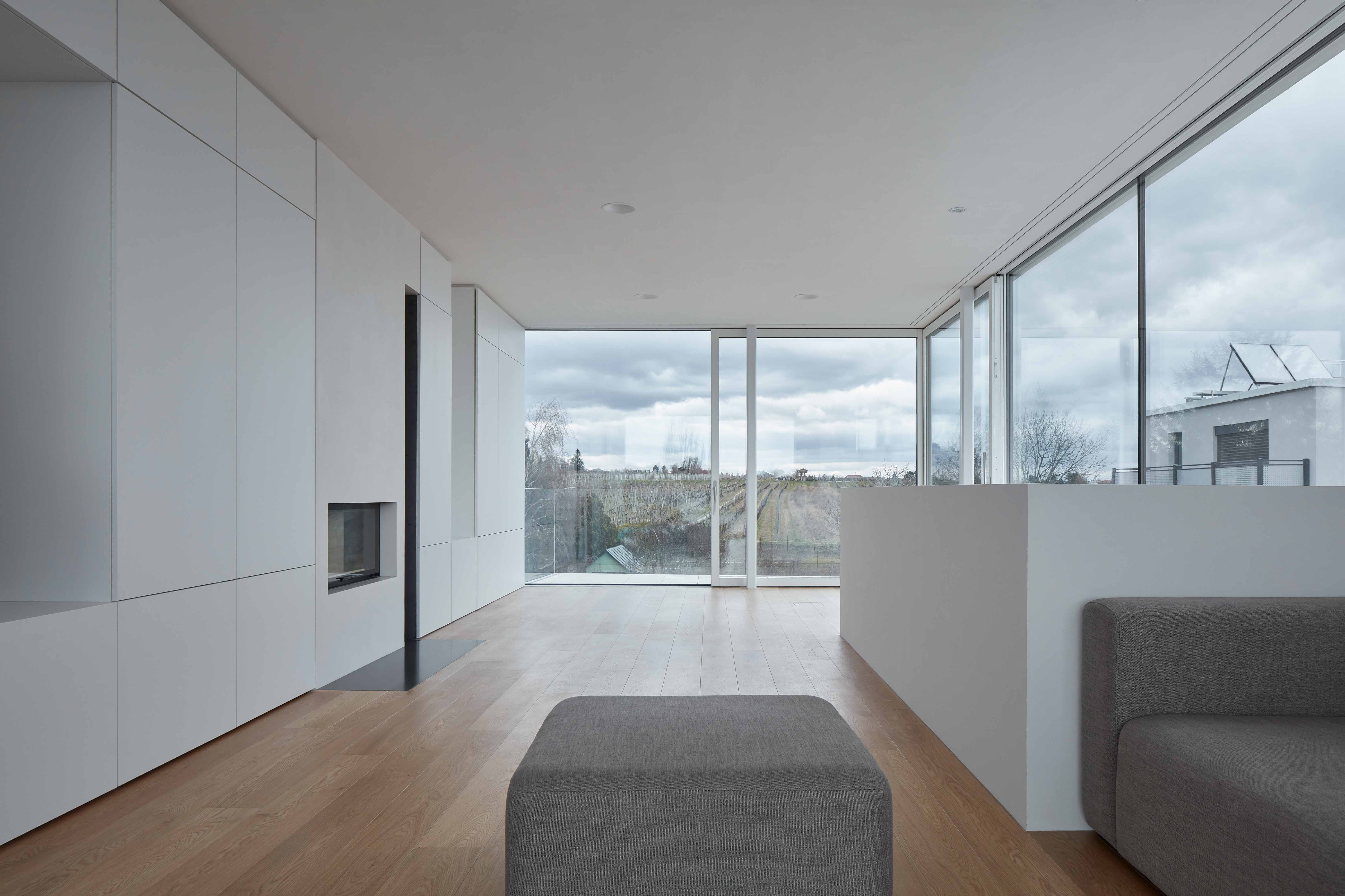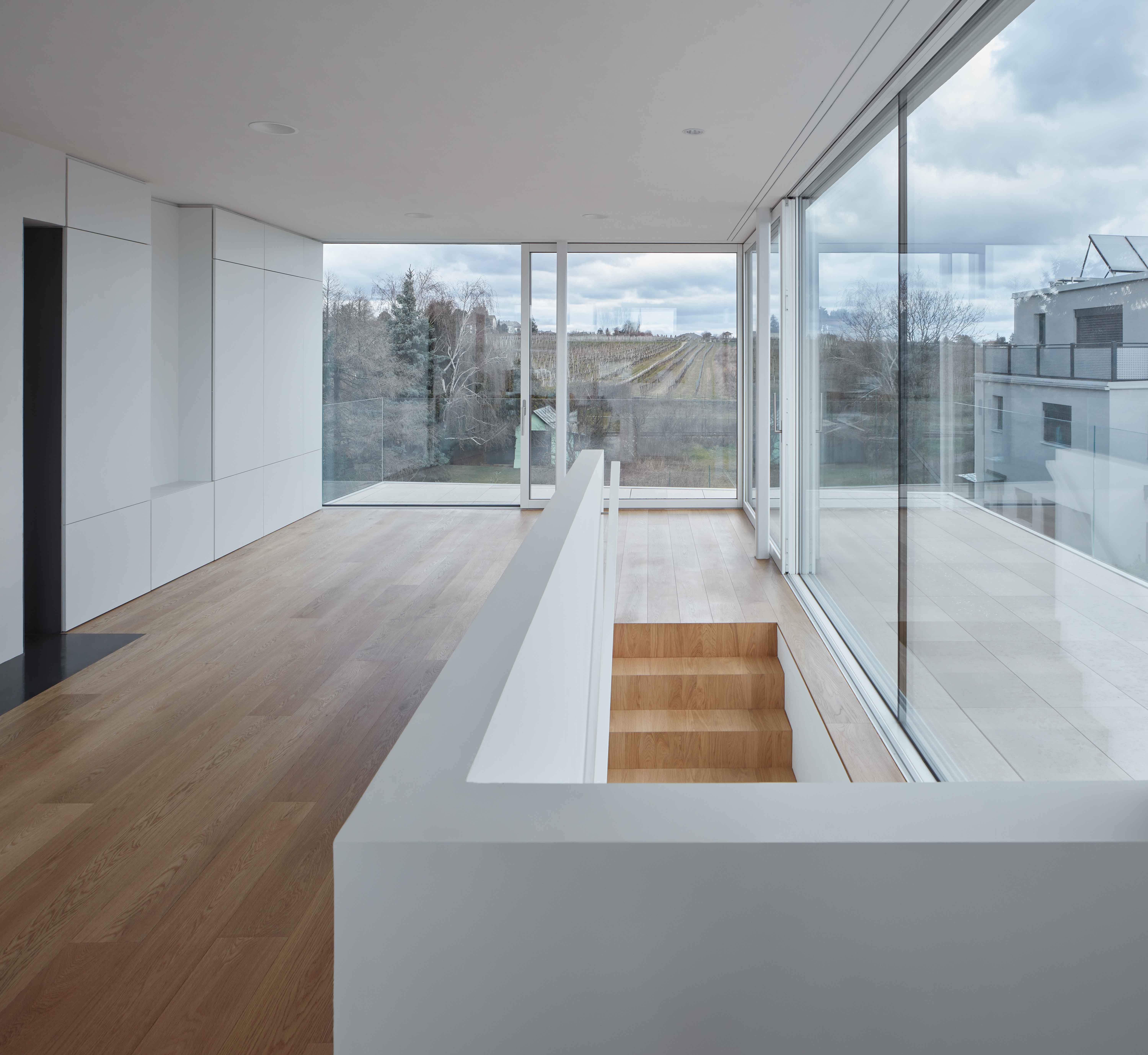 Imagining a villa, one pictures a sprawling complex of buildings and land, echoing dynastic opulence. For this villa commission in a quiet village outside of Vienna, Austria, I was challenged with maximizing the volume of a difficult and narrow plot of land in order to create a modern living space for a two-generation family. The first impression of the construction is of a container as a living space. However, the eye is soon drawn to the discrepancies between the use of ninety degree angles and a slightly deviating complementary angle. The friction between the two angles, used both in the wall structure and the floor plan, can be felt as movement throughout the entire structure. From the intimate entrance to the large open plan living space, this interaction between the perpendicular and the oblique defines a certain perception that pervades the experience of the structure. The outlines and the facade of the new house are reminiscent of the unique and traditional craftwork of Viennese houses. In the last decades, this craftsman work has largely been given over in favor of the standardized use of polystyrene and external plaster.