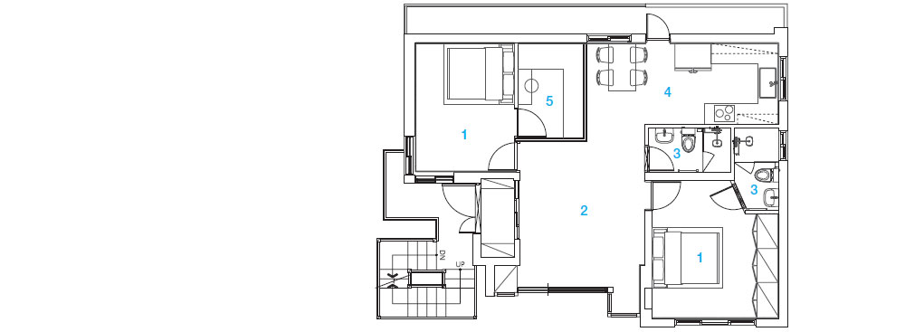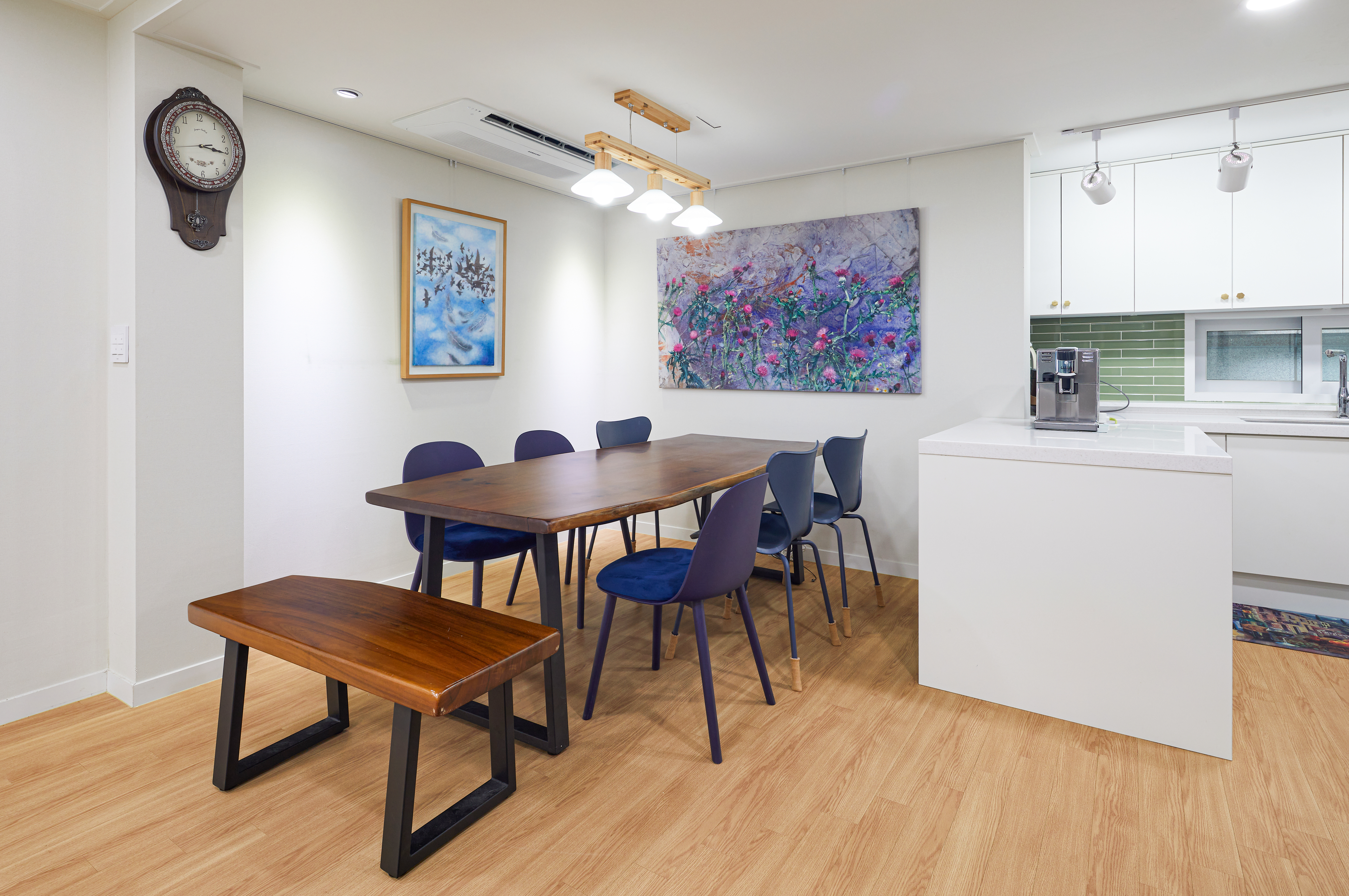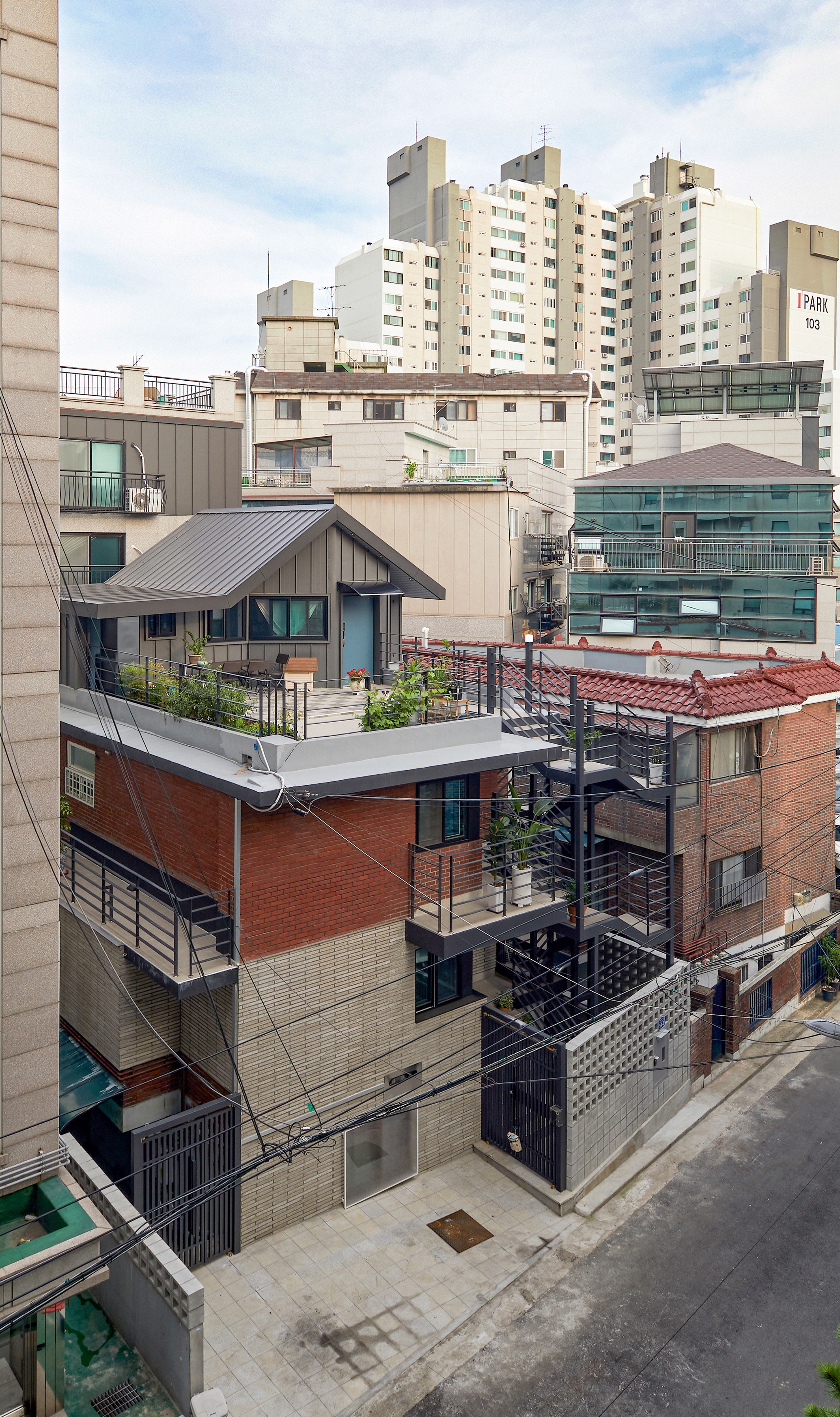 The work to build a house was a dream of the owner's family. Ten years ago, I was introduced to the client couple and did a renovation for them. The relationship continued, and one day they contacted me saying that they wanted to leave their apartment life and go live with their parents in a house with a yard. After visiting several houses with the couple, we found this house in Gwangjang-dong. It was a house with a strong structure, close to the Han River and to the university of the client and his wife, who are professors. The first floor is a space for the couple. The second floor is composed of a work/study space for their daughter, who majored in fashion design, and a space for their son, who is studying abroad, to stay when they come home. The third floor is made up of a study and a studio with a yard for the professor and his wife. This is a project that gave me great joy, in which after drawing the big picture of changing the spatial structure, the client and I happily made decisions through our discussions.