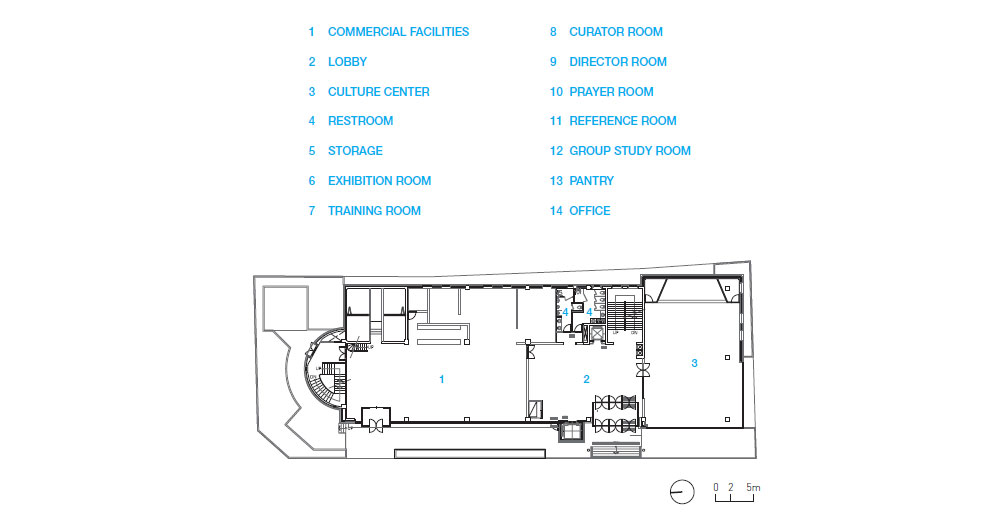 The International Bible Museum of Jooan Methodist Church houses a collection of Bibles and related materials from all over the world. Among the Bibles in the collection, the early translations of the Korean Bible were first propagated by Appenzeller, a Methodist missionary from the United States, when the Incheon port opened in 1885. The museum and Incheon are both significant places where one can deeply understand and experience Christian history and the Bible. The exterior wall of the museum was renovated to reflect this symbolism. With the motif of the ‘Gospel Ship Carrying the Bible’, it contains the history. The mass of the building embodies a ship, the elevator in the center a mast, and the wave of light through the window, waves.