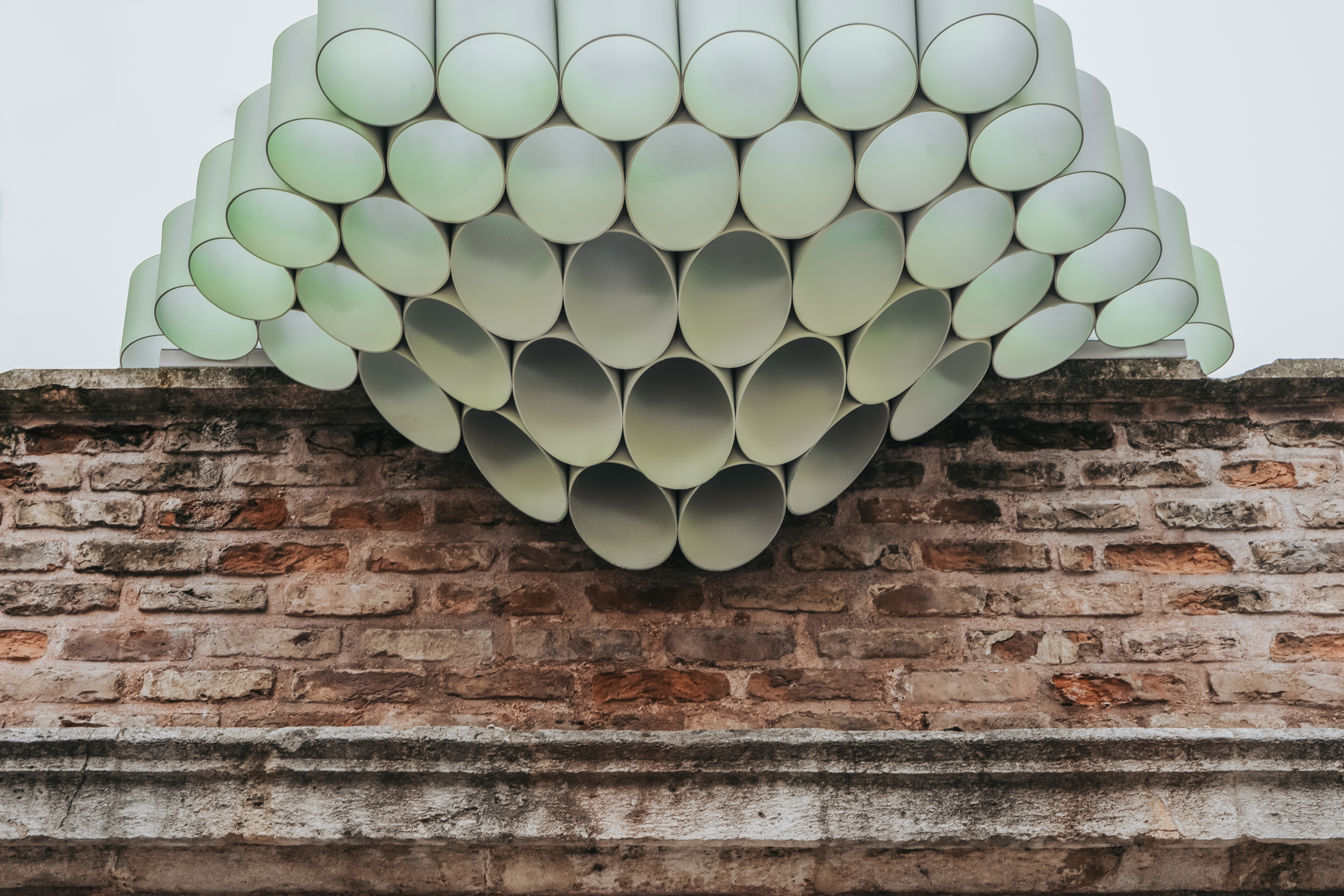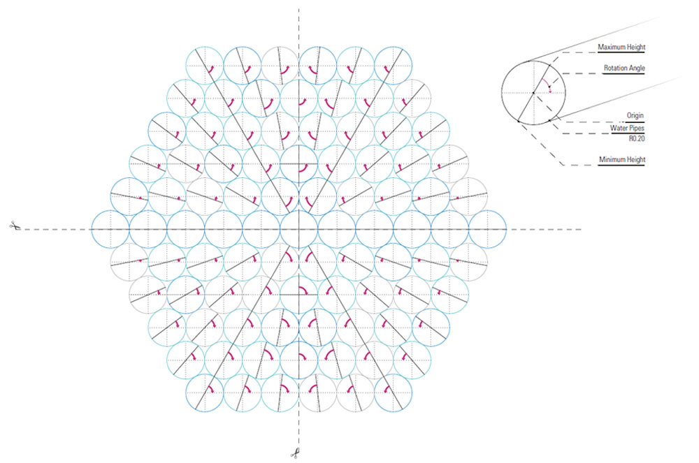 물방울처럼 이끼를 만들어 낸다. 포물선 형태를 띤 파이프를 사용한 콘셉트는 투명한 물의 전환과 과정의 한 순간을 상징한다. 동시에 ‘디 에코’의 공생 관계는 분수에서만 아니라 도시와 도시의 자연적, 인공적인 역동성을 이야기하고 ‘디자인의 주된 콘셉트를 만드는 과정에서 빛으로 스스로를 어떻게 정의할 수 있는가’라는 질문에 대한 답을 찾았다.