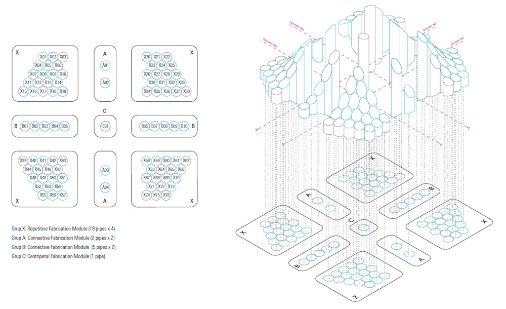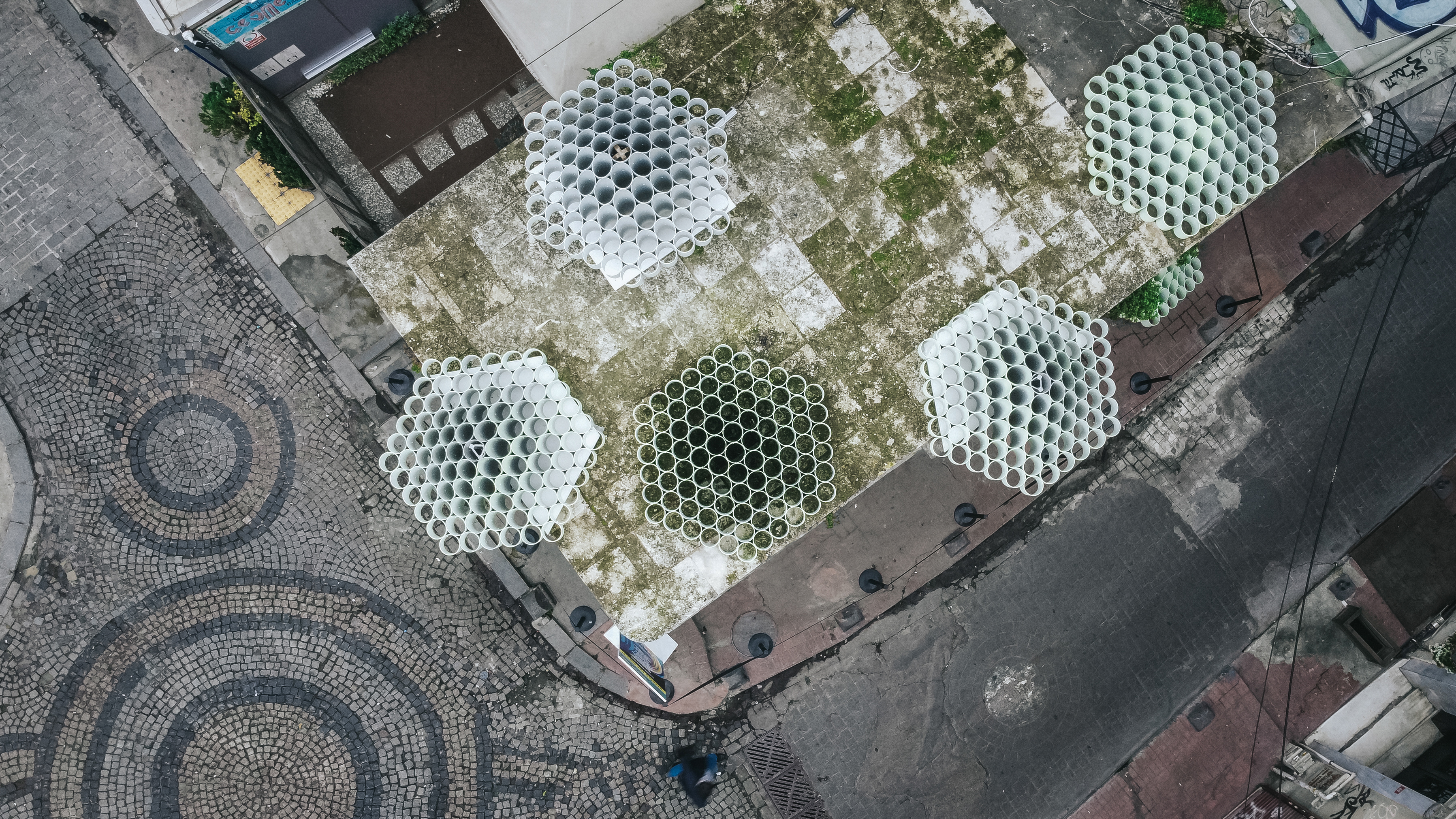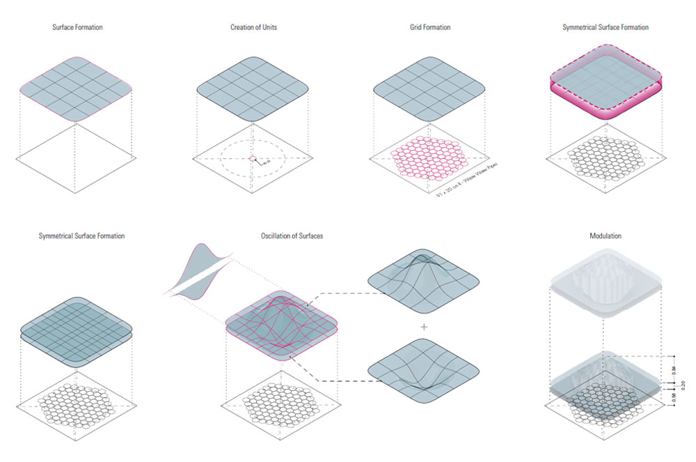 ‘THE ECHO’ is designed by recycling waste water pipes. It is also an installation design that supports the reduction of carbon footprint. The gathering of pipes, like drops of water, forms a cluster of lichens surrounding the fountain. The concept of the pipes designing a parabolic form is a symbol of a transition as transparent as water, of a process, even of a moment. At the same time, the symbiotic relationship of ‘THE ECHO’ is not only with the fountain, but also with the city and the natural and artificial dynamics in the city is an answer to the question of ‘how it can define itself with light, while creating the main concept of the design’.