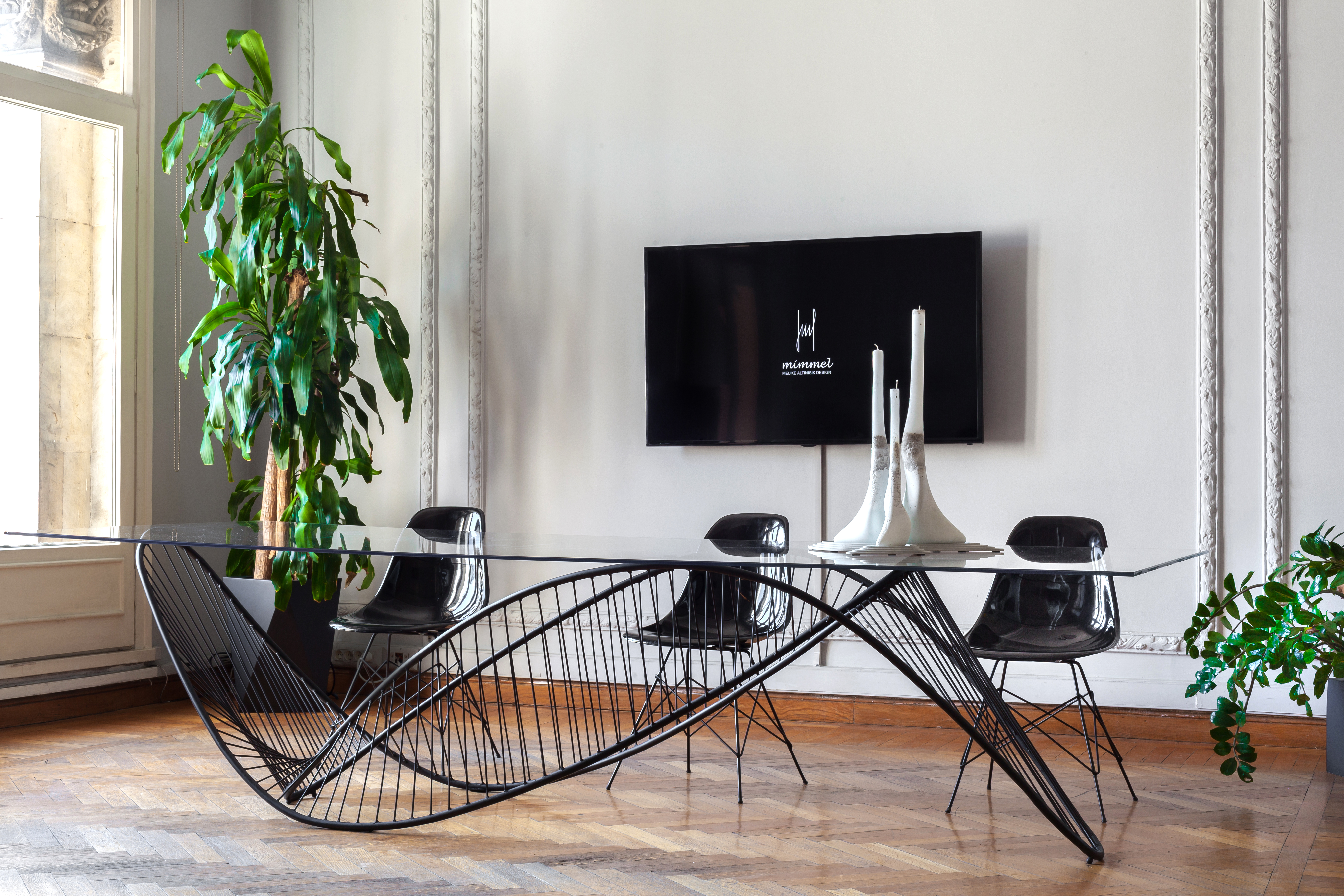 The flowing and rhythmic structure of the table ‘SPIRA’ is intriguing, thus speaks the same language with its function which becomes something continues, fluid and four-dimensional world where it transforms structure into space and gathers various users and their agendas around same space. ‘SPIRA’ creates a world in between two gently curving tubular ellipsis that are paired by multiple linear elements to support each other which become the structure itself; makes us question the three terms that are not formally defined; point without size, line never ends, and plane extends forever. The supporting structure of ‘SPIRA’ is made of steel that permits 3D Steel Bending and enables the reinterpretation of the concept of balance concerning two overlapping but non intersecting geometries. The structure forms the design by shaping each ellipse to carry the load of the glass table surface from two points and distribute it from another two, and the design forms the atmosphere.