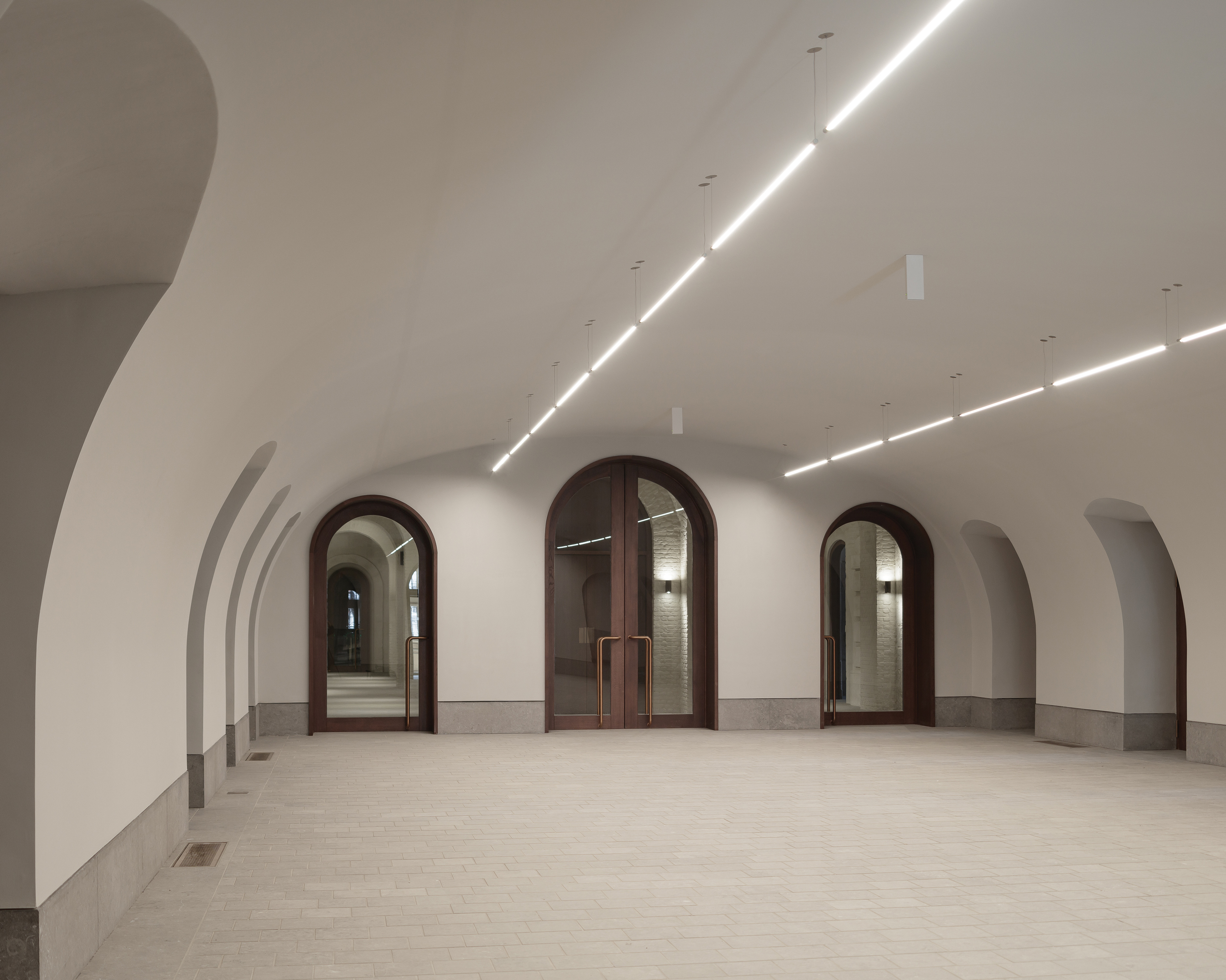 시간의 흔적에 집중하고, 존중하면서 건물의 입면과 인테리어를 복원해 나갔다. 시청은 ‘젊어지는 치료’가 아닌 위엄 있는 복원을 거쳤다. 밝은 공간이 될 수 있도록 지상층의 공간 구조를 복원했다. 모든 문은 다시 열 수 있게 되었고, 주 출입구는 그로테 마켓을 향해 두었다. 현재 많은 사람이 모르고 있는 두 번째 혹은 ‘일루미네이티드 층’은 ‘노블 층’만큼 중요하게 만들어질 예정이다. 의원들 대다수와 그들의 직원들이 상주할 곳이기 때문이다. 중앙에는 둔 2층 높이의 현관은 햇빛을 안으로 더욱 들어오게 하고, 하늘과 오랜 역사를 지닌 종탑을 향해 열린 공간이 되도록 했다. 현관의 공간적 표현들은 새로운 ‘일루미네이티드 층’의 수준으로 확장된다.