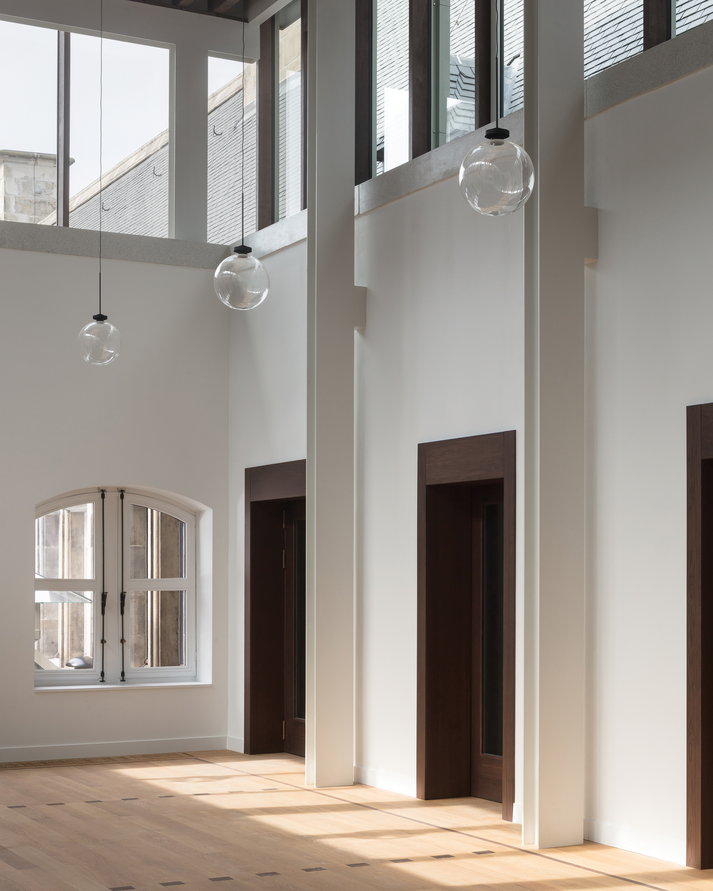 The façades and interiors were restored with great attention and respect for the traces of time. The building did not undergo a ‘rejuvenation cure’ but a dignified restoration. We restored the spatial structure of the ground floor so that the space regains its brightness. All the gates can be opened again and the main entrance is located on the Grote Markt. The second or ‘Illuminated Floor’, currently unknown to many people, will be made equally important as the ‘Noble Floor’, because it is here that the majority of councilors and their staff will be housed. We designed two centrally located, doubleheight spaces – the vestibules - who will let in more daylight and open up the view towards the skies and historic bell tower. The vestibules extend the spatial articulation of the underlying floors to the level of the new ‘Illuminated Floor’.