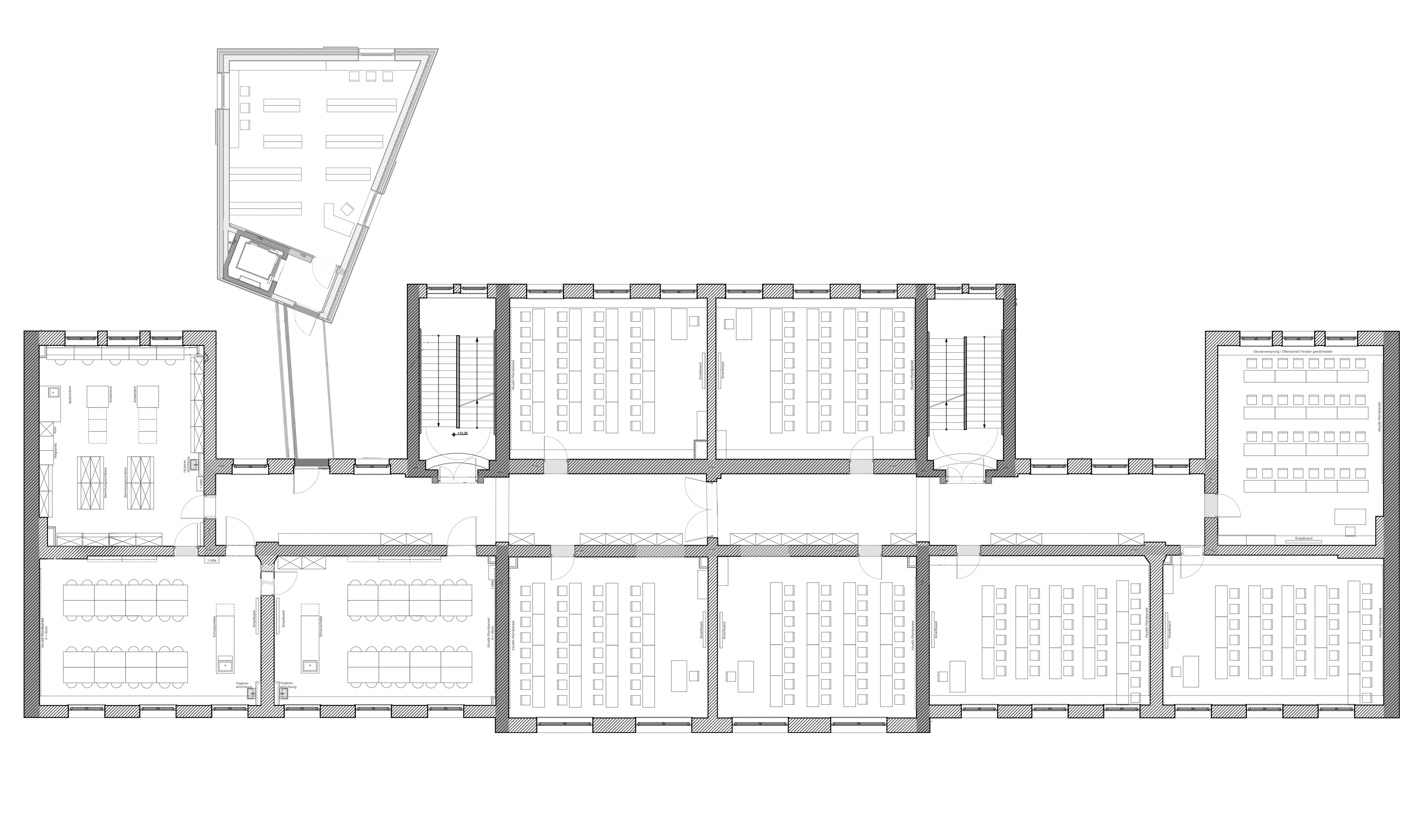 교묘하게 뒤틀린 밝은 노란색 난간이 있는 네 개의 현대적인 다리는 기존 건물과 증축 건물을 연결한다. 새로운 건물에는 도서관과 같은 특별실을 두었다. 새로운 엘리베이터가 통합되면 기존 건물도 무장애 공간이 될 수 있다. 오래된 건물의 벽면 구조는 최적화되었다. 메자니 층은 무장애 공간이 되기 위해 특별한 주의가 필요했다. 이미 초기 설계 단계에서 입구 복도 위에 2m 높이의 아치를 형성하여 두 개의 메자니 층을 연결하는 다리가 만들어졌다. 다리는 내부와 외부 모두 조형적인 모양으로, 기존 건물을 배려하며 통합되었다. 벽돌로 지어진 고전적인 입구 공간은 현대적인 인테리어 개념으로 확장되었다. 진한 녹색의 벽을 강조하는 맑은 흰색, 리놀륨 바닥의 더 진하고 어두운색은 상층의 넓은 복도를 정의한다. 화려하게 부착된 가구는 교실 밖에서 학습 및 작업 목적으로 사용할 수 있는 공간을 확대한다. 교류의 장을 조성하여 미래 지향적인 학교 교육이 이뤄지는 공간이 되었다. 지붕은 보존 명령에 따라 보수했고, 과학실은 새롭게 단장했다. 또한, 설비와 화재 방지 또한 새롭게 개선했다. 공사는 빈 건물에서 이뤄졌다. 따라서 2년 동안 학교 마당에 컨테이너 시설을 일시적으로 설치해야 했다. 2021-2022년 새 학년을 맞아 신축 증축된 본관을 꾸렸다. 공사비는 베를린 상원 행정부 프로그램인 ‘활기찬 센터와 활기찬 이웃’의 이름으로 자금을 조달했다.