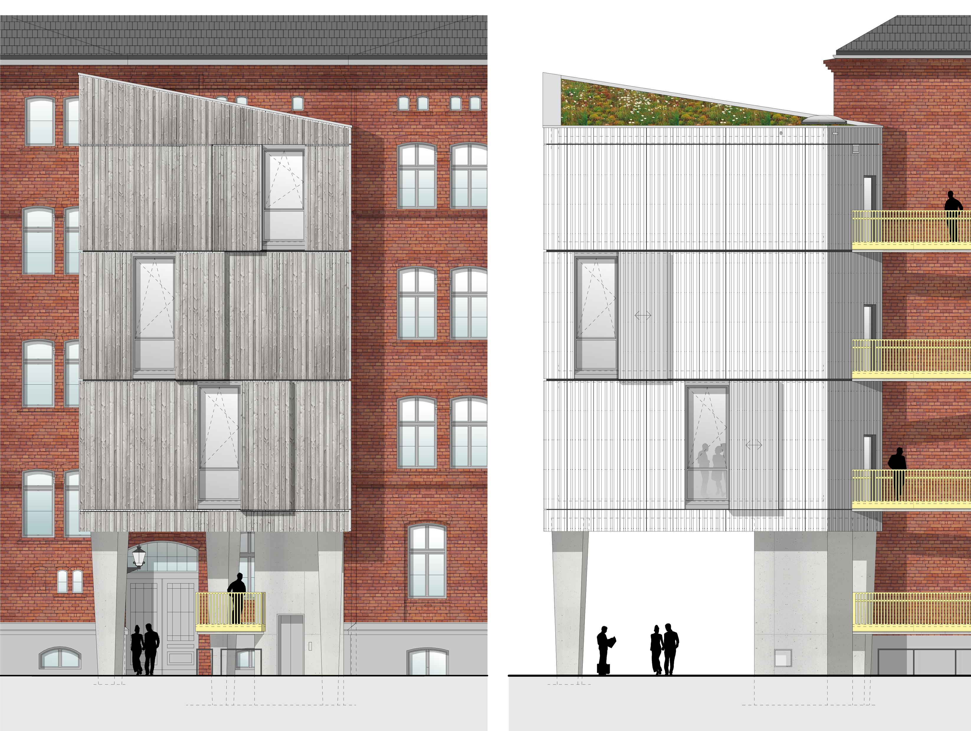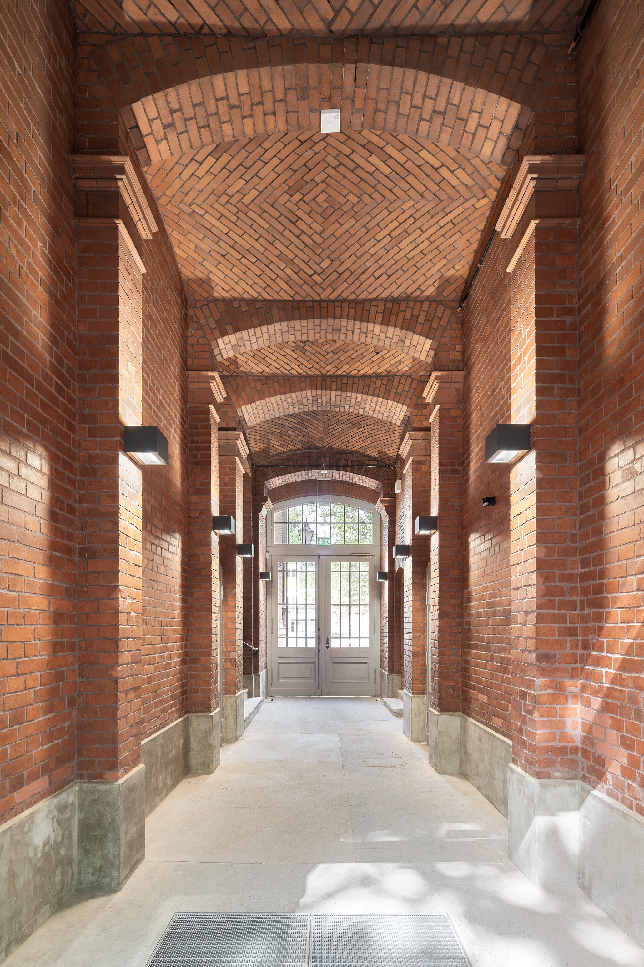 With a modern architectural language, SSP Rüthnick Architekten extended the school, which is under ensemble protection. The main building for 580 pupils was modernized and rehabilitated. The new building in the schoolyard complements the existing school building. The three-story extension respectful distances itself from the solid masonry building with red clinker bricks. A modern-looking façade made of vertical larch wood slats was deliberately chosen to contrast with the historic brick building. In addition to the expressive cubature, the joints between the floors and the movable sliding elements gives the building plasticity. The wooden elements, which can be moved manually, serve as sun protection. The structure of the extension, which is elevated up to the first floor, is given a floating effect by the slender, conical columns. In this way, access to the old building was preserved and the existing schoolyard was affected as little as possible. The building from 1875 by the architect Hermann Blankenstein belongs to the “märkische” brick Gothic style, decorated with ornamental elements.