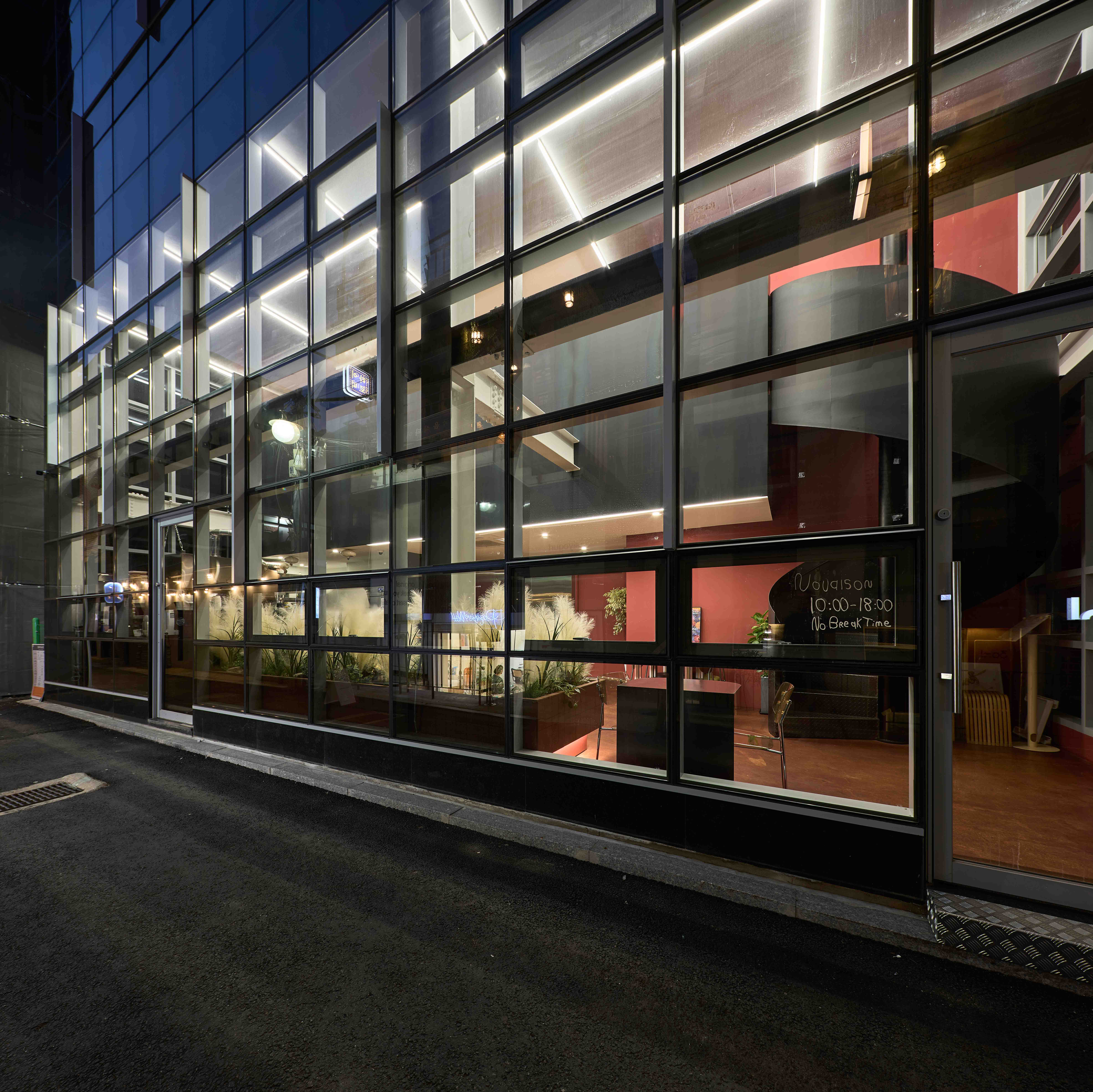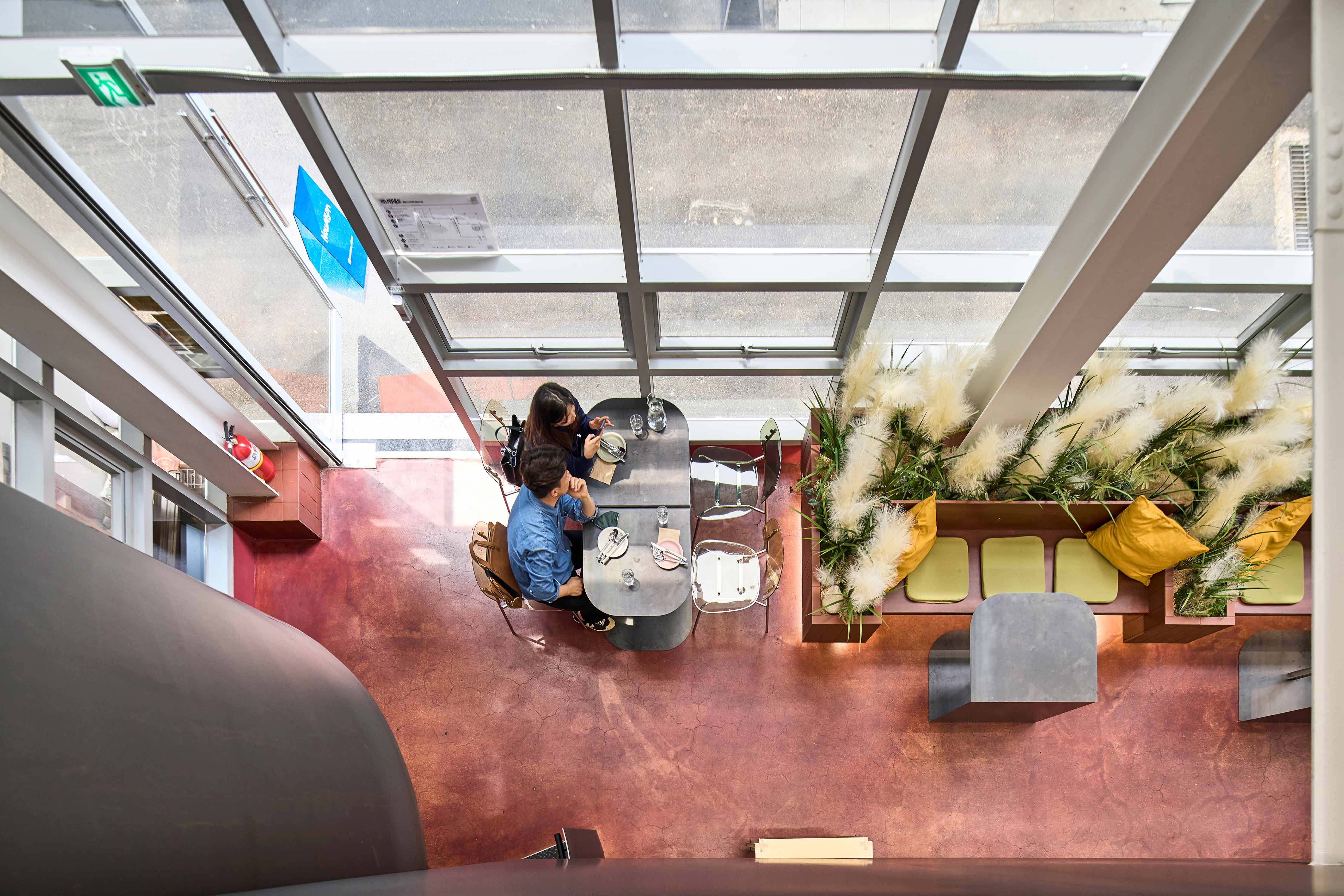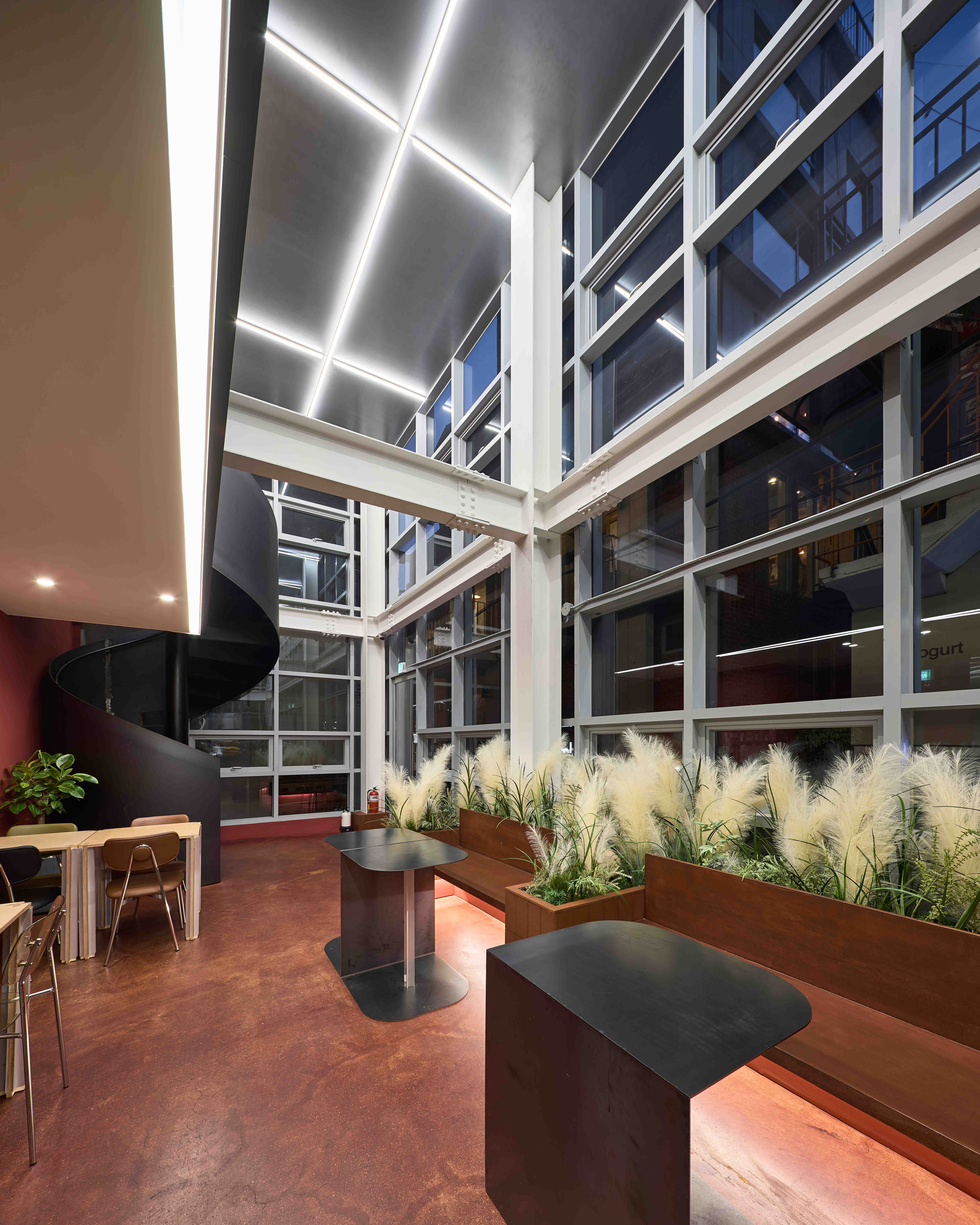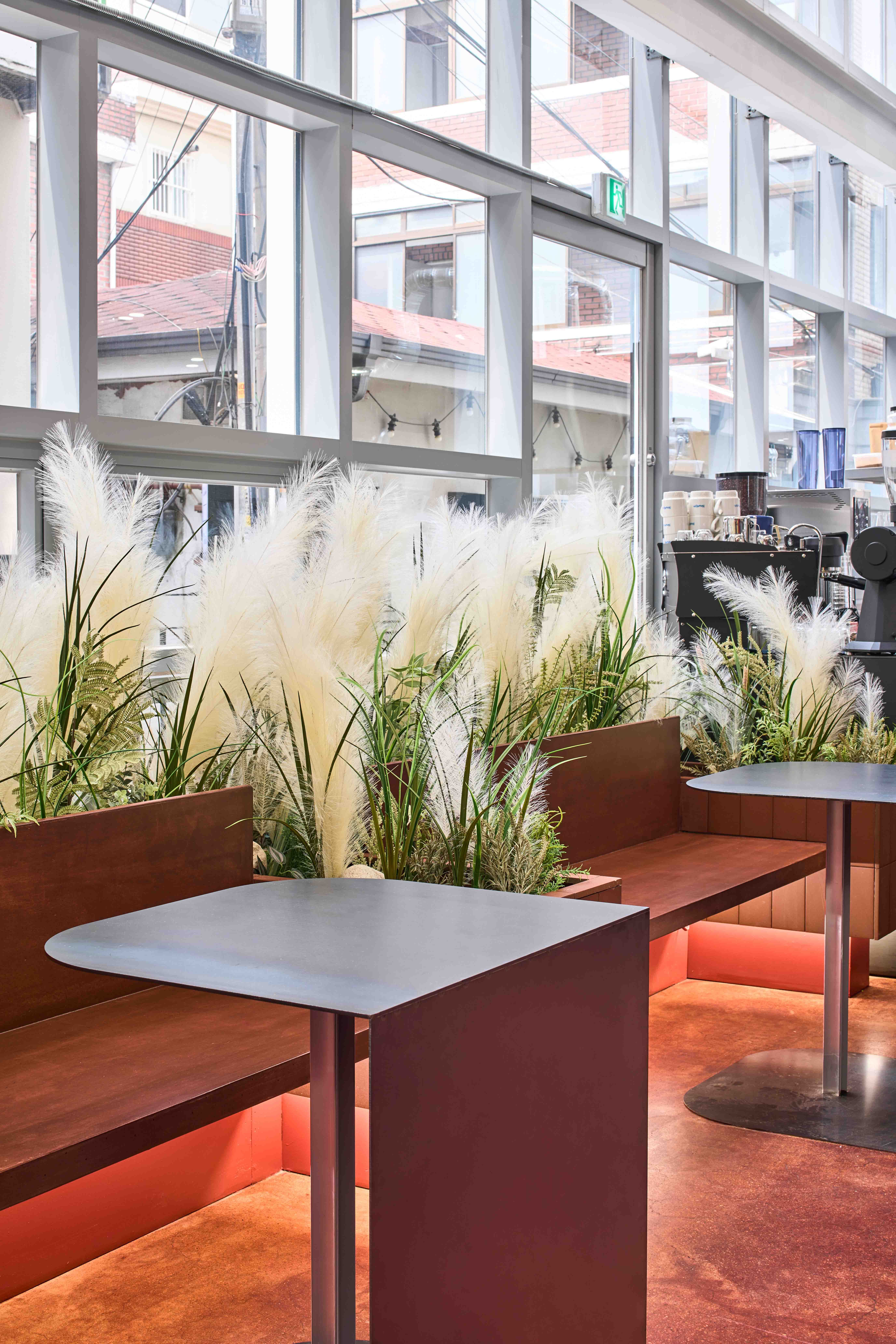 공간에서 사람의 눈을 가장 먼저 사로잡는 요소는 색이다. 좁은 골목길을 지나다니다 출입문을 들어서게 되면, 외부에서는 즉각 인지되지 않았던 붉은색과 검은빛을 먼저 만나게 된다. 폴리싱 처리한 붉은 바닥은 햇빛이 스며들어 색의 깊이감을 풍부하게 만들고, 바닥 위 가구들의 정체성을 더욱 명확하게 만들어 준다. 붉은 벽돌 타일의 테이블은 바닥과 함께 공간의 연속성으로 인식되고, 그 위 흐릿흐릿한 조경은 공간의 분위기를 가볍고 나른하게 만들어 준다. 검은빛의 구로 강판으로 마감된 원형 계단과 벽은 공간을 입체적으로 느끼게 한다.