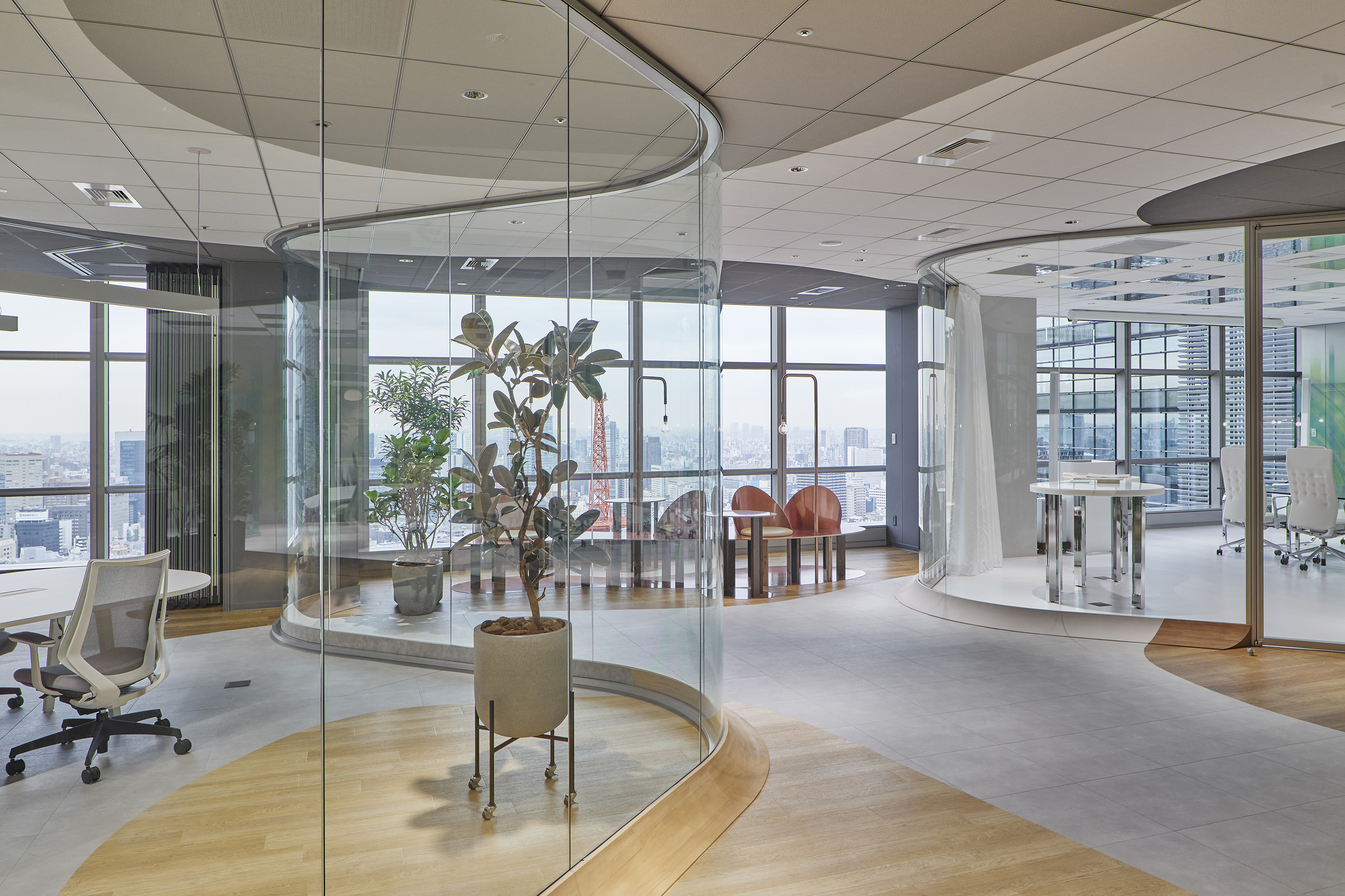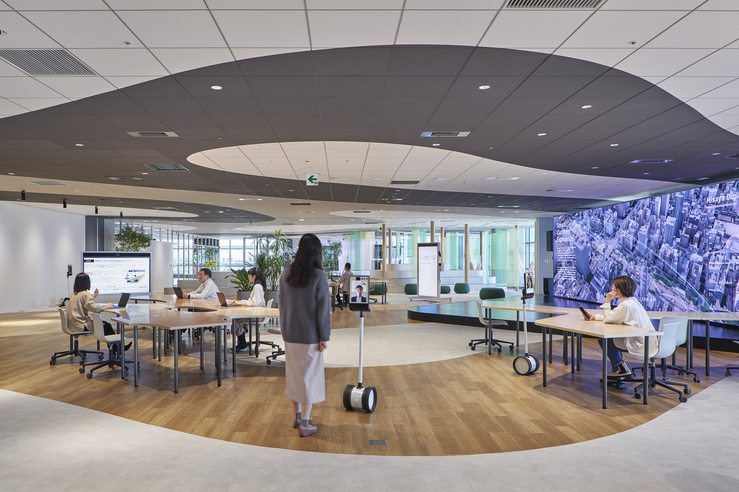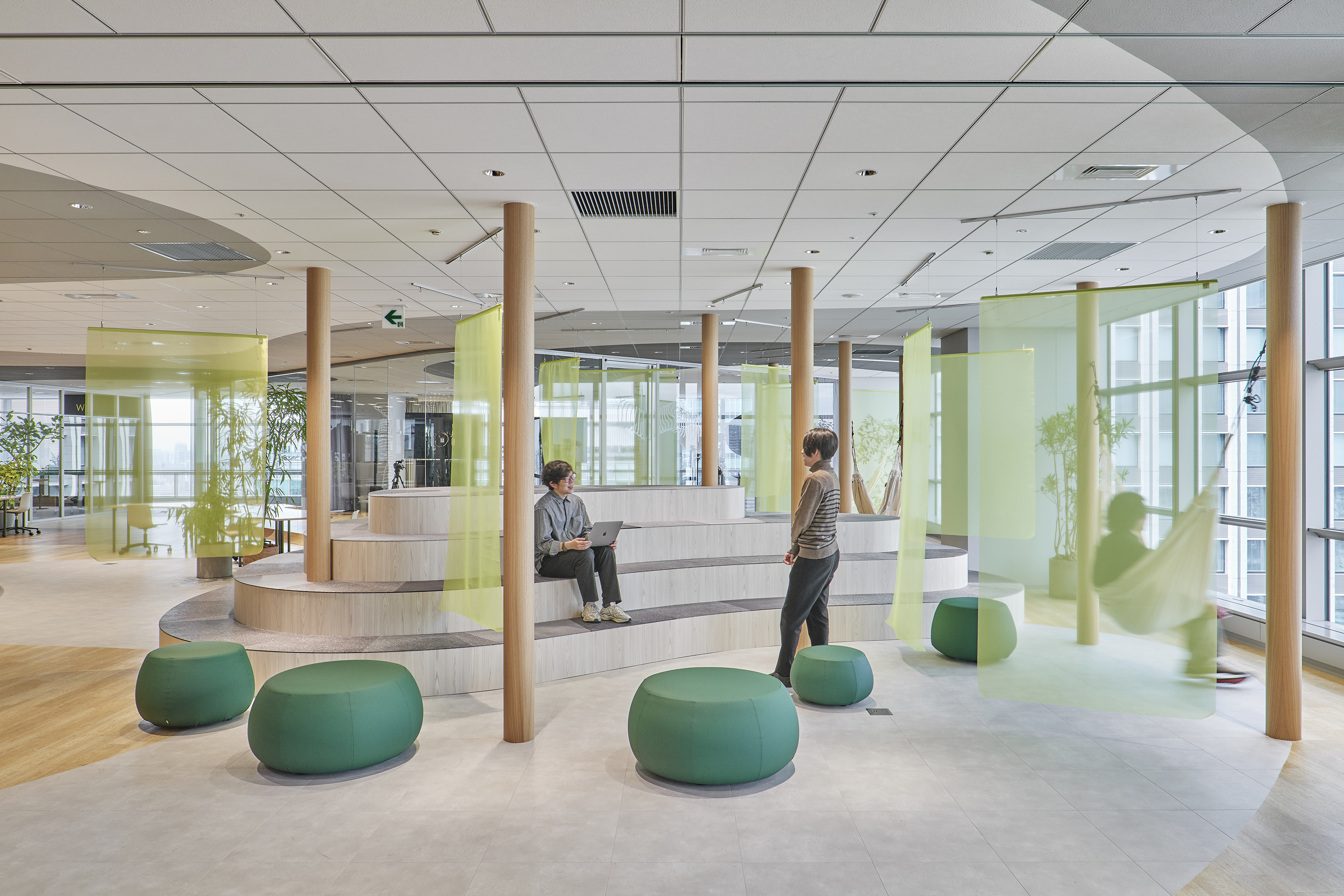 오픈 허브 파크는 부서 간 근무 라운지 공간을 만들기 위해 NTT커뮤니케이션즈가 의뢰한 인테리어 프로젝트다. 국제적으로 대형 통신 회사인 NTT는 본사 내에 창의적인 사고와 학제 간 토론을 위한 공간이 필요했다. 의뢰인의 요청에 따라, 기능과 위치적 요건에 대응할 수 있는 평면이 계획됐다. 디자이너는 기존 건물의 격자로부터 45도 비틀어진 공간을 통해, 직교 그리드가 가지고 있던 경직된 느낌을 벗어난 포켓 라운지 공간을 만들 수 있었다. 오픈 허브 파크는 카페, 도서관, 작업공간 등 다양한 활동을 유도하고 열린 중앙 공간을 자연스럽게 기존 공간에 스며들게 만든다.