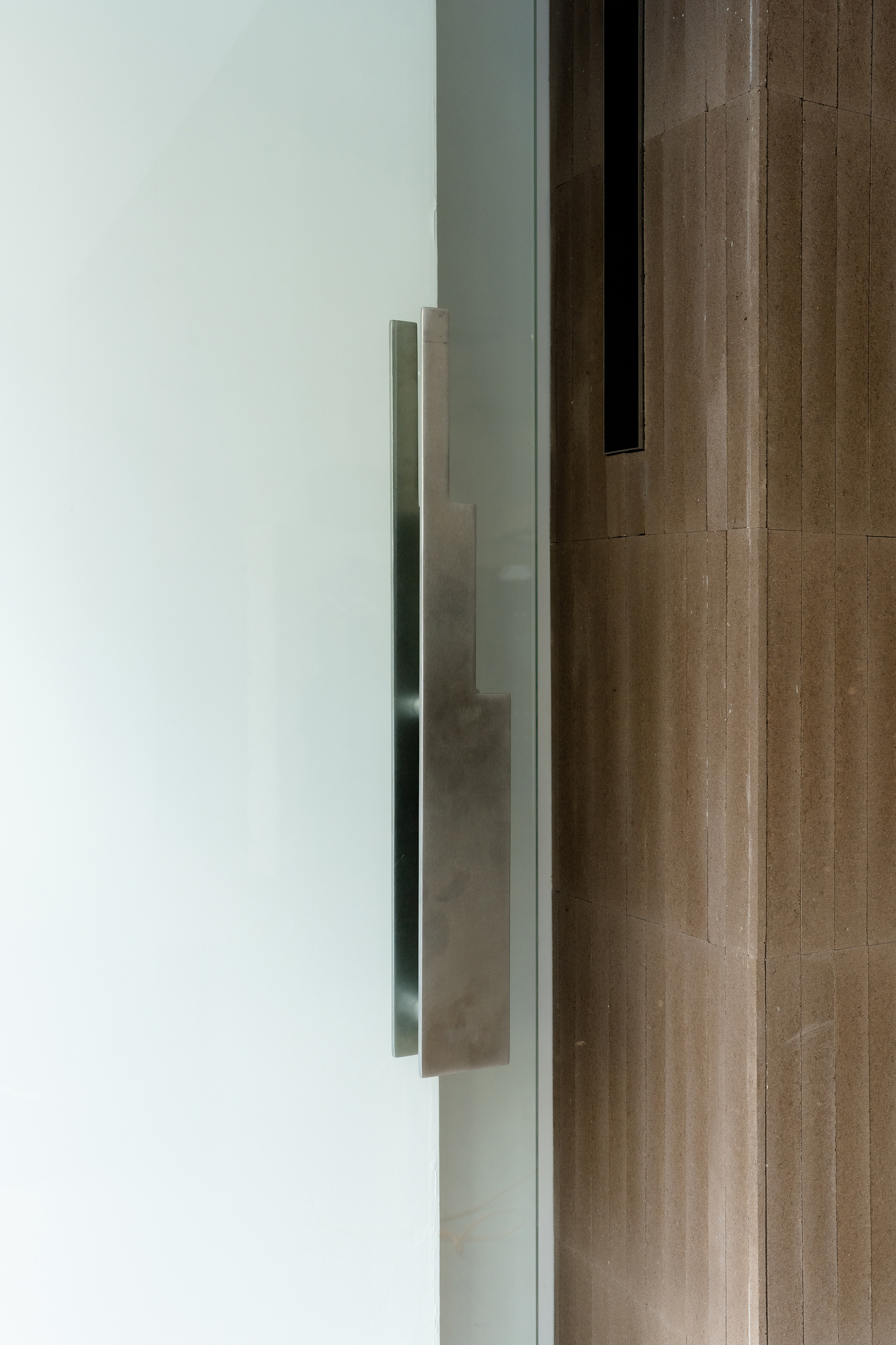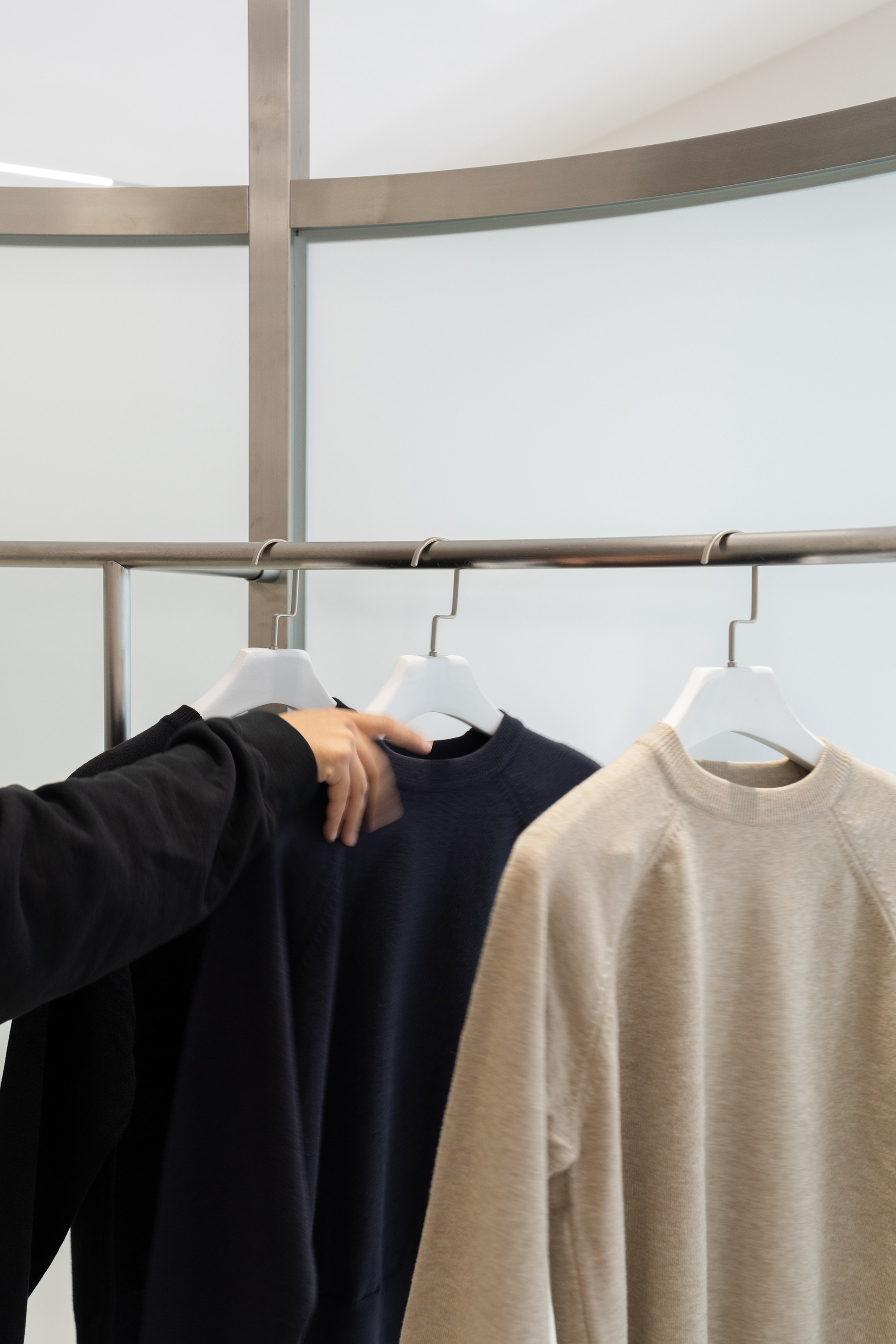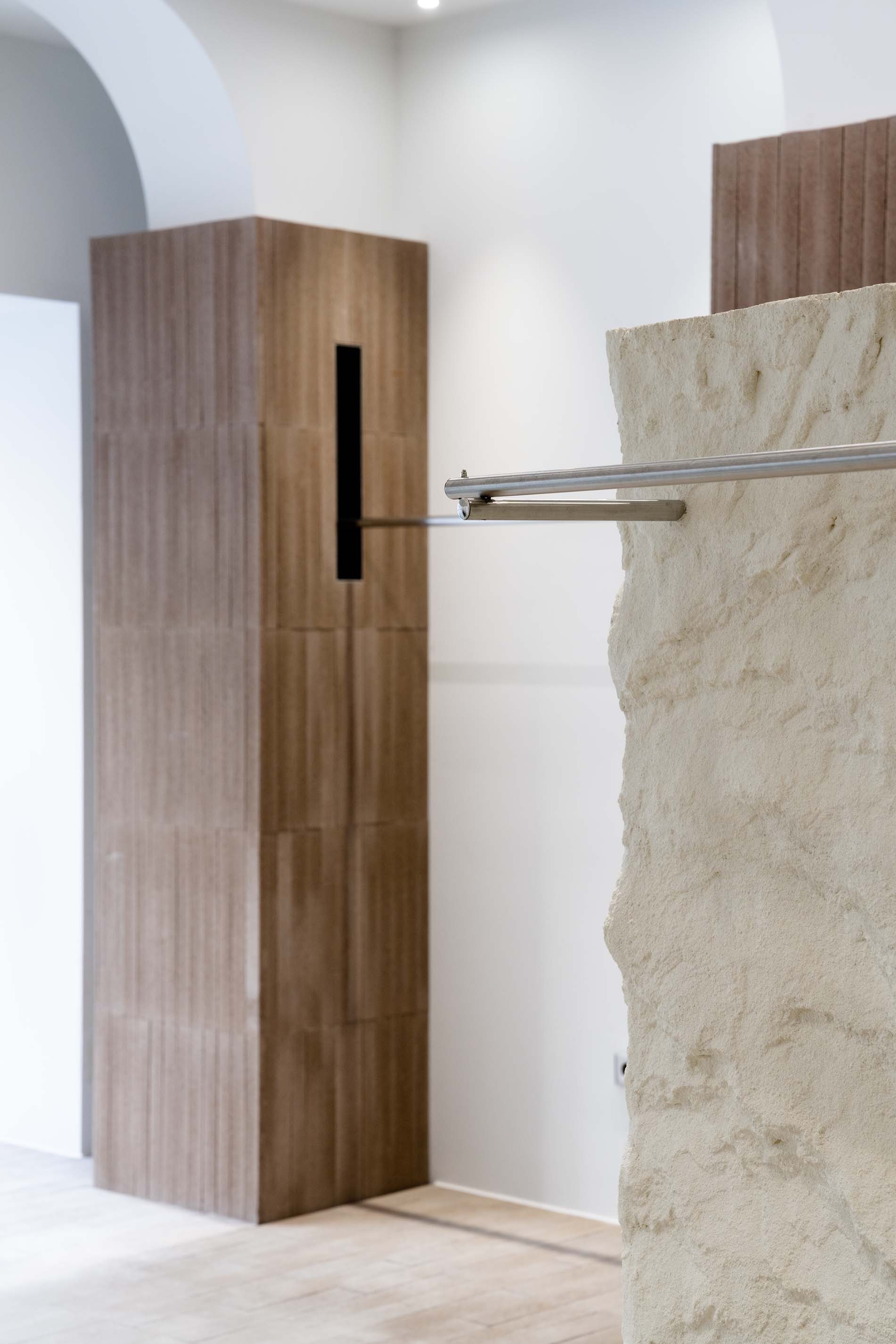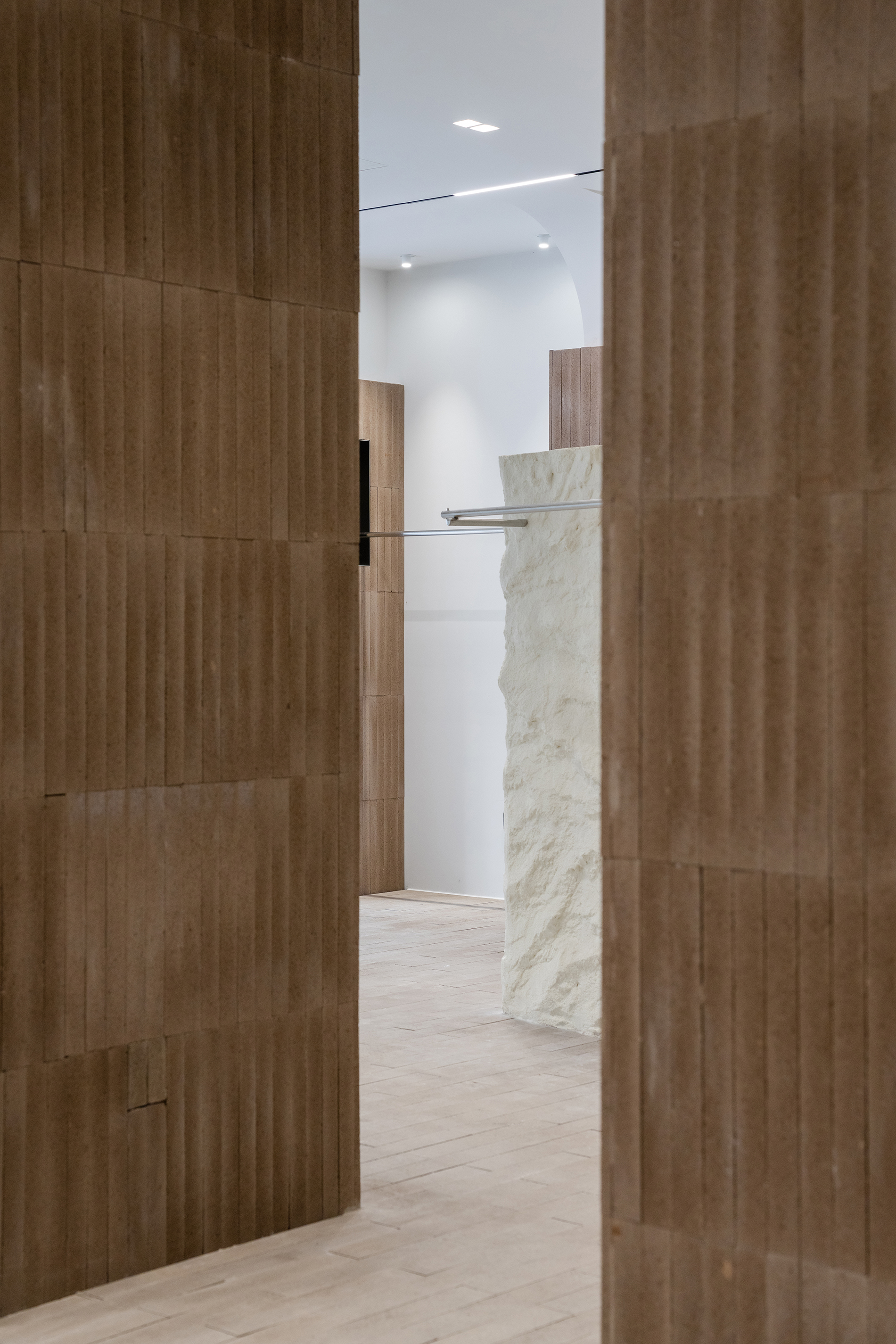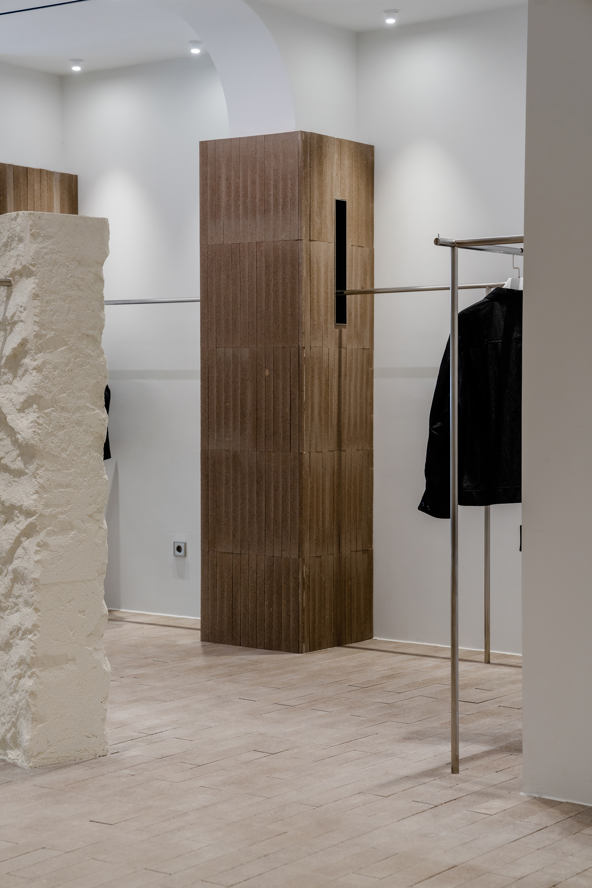 STUDIO SHERPA tried to express the concept of building "relationships" in the structural form of space, and thus took the core concept of a temple. After opening the door and entering, the pillars surrounded by long bricks on both sides balance the space and become the overall basis. In the meantime, the partition with a rough texture and the curved partition in the large main position perform the functions of hangers and mirrors while serving as space separation. These partitions are made in the form of curves and diagonal lines, which show a dynamic feeling as well as colorful traffic lines. In addition, the details of the hangers centered on the pillars were made with a hanger in a tie-up method so that they can be flexibly changed according to the length of the clothes. In the space of the counter and display, which presents the largest image, the stacking of “relationships” was presented in an intuitive form using a copper plate, giving weight to the main image.
