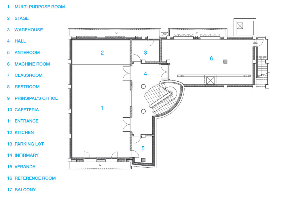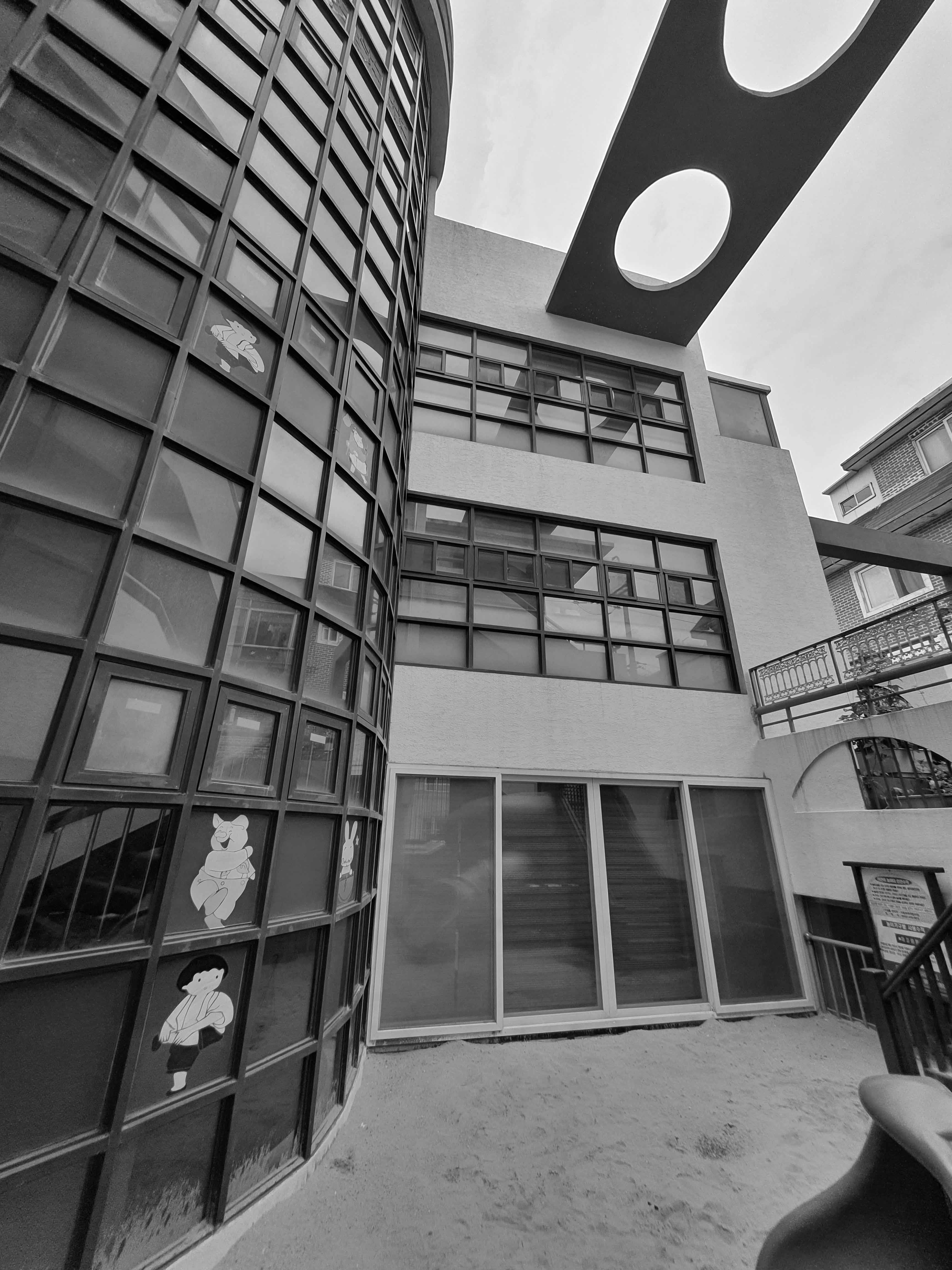 The elevation design revived the image of the circular window from the past, and a crescent-shaped design was reminiscent of the sun and moon was punctured so that it could be bright as the sun, be beautiful as the moon, and shine like the stars, just like the Bugok Daycare Center. The crescent moon was placed on the elevation and the right side of the building symmetrically around the corners, reminding one of the circular windows of the past and allowing one to imagine a crescent moon in the alleyway. The glass block wall was not demolished, but insulation was added to the interior, as it was determined that structural and leakage problems could occur in the future. In addition, the front of the glass block was covered with a punching metal exterior material to which the landscape color of Ansan City was applied. This elevation concept created a new landscape that allows the light of the moon and stars at night to be felt even at kindergarten.