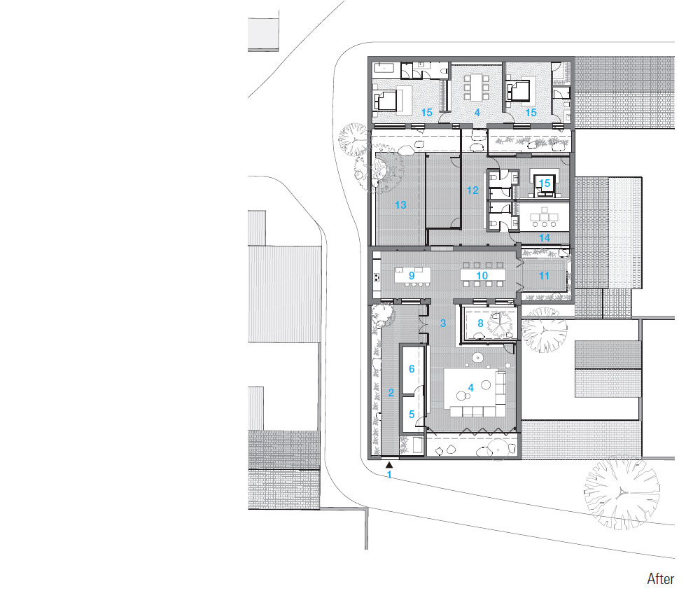 북쪽에는 개조한 오래된 건물이 있다. 이곳에는 부엌과 식당이 수평으로 펼쳐지고, 낡은 지붕과 새로운 지붕 구조가 서로 대화한다. 식당과 이웃집 담장 사이에는 대나무 마당이 있어 대나무 숲에서 먹고 마시는 경험을 할 수 있다. 식당을 지나면 뒷마당이 나오는데, 이 마당은 야외 활동을 위한 곳으로 반야외 공간인 베란다와 연결된다. 큰 나무가 심어진 여가와 수다를 떨 수 있는 즐거운 공간이 되었다. 침실은 뒤쪽 공간에 있다. 북쪽 건물과 목조 건축물은 유리 복도로 연결되어 자연스럽게 좁은 마당을 형성하고 있다. 세 개의 침실에는 충분한 빛과 환기를 제공하고, 야외 풍경을 바로 볼 수 있도록 시야에 방해되지 않게 했다. 다양한 마당 구성은 내부 공간 구석구석에 자연스러운 활력을 불어넣는다.