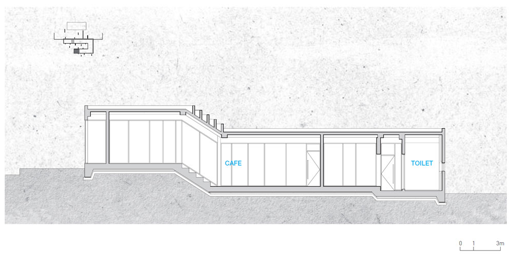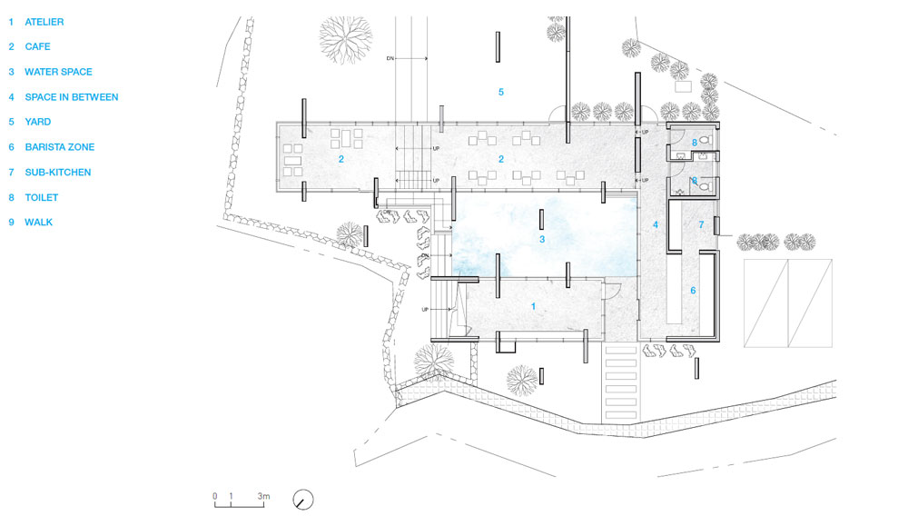 Entry is naturally made into the building while looking at the water space visible through the gap between the wall and the roof space with glass. The studio and the store create a point of connection through the water space. The narrow interior space passes through the barista area, bypasses the service line of movement, and enters deep inside. The interior and the exterior use the same slope toward creating a difference in height, and when they arrive at the upper level position, they go outside again. In the external space of the high tier, one would encounter a point which naturally leads to a half-a-story high roof and naturally traverse the roof. Walking through such a cycle, a visitor finds the point where each movement and space are connected.