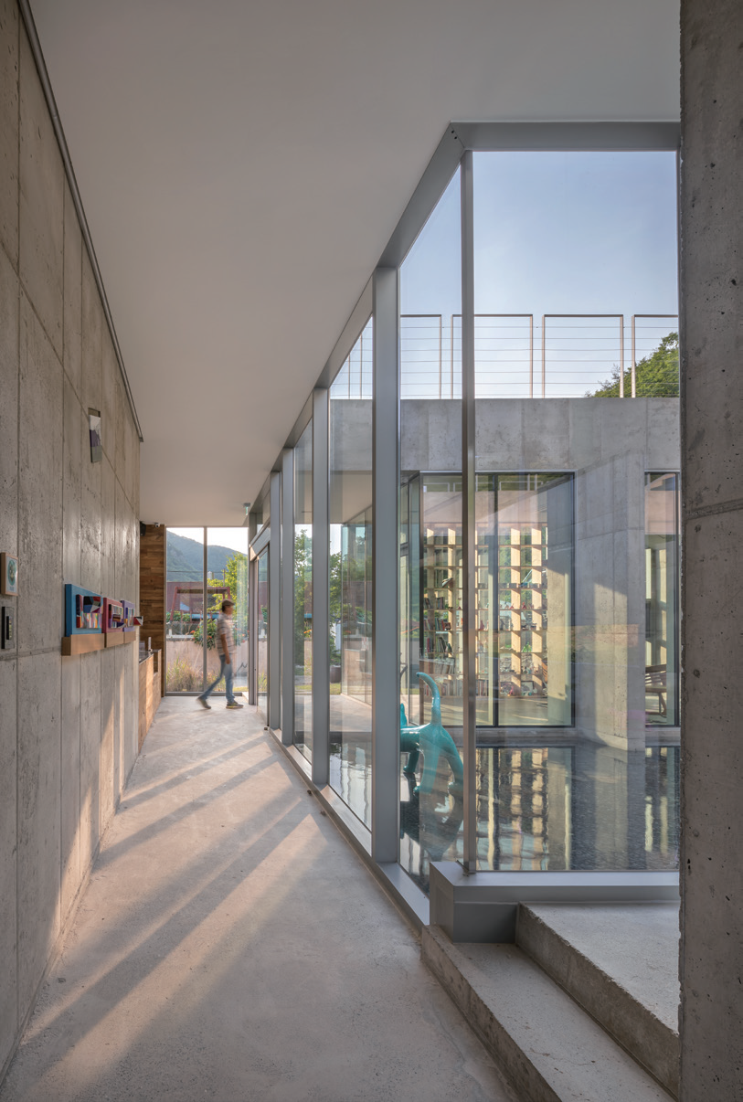 예술가 최인석의 작업을 계속해서 들여다보니 하나의 커다란 면에서 선으로 표정을 만들어내는 특징을 발견할 수 있었다. 그의 작업 특징을 대상지의 자연에 그대로 반영하는 가장 단순한 건축 장치로 동일한 방향의 흩뿌려진 벽들을 만들어 주변 풍경과 이어진 표정을 만들고자 하였다. 흩뿌려진 벽들은 때로는 내부 공간의 요소가 되고 때로는 외부 공간의 요소가 되기도 한다. 그리고 지형을 따라 흐르는 긴 선형의 최소 지붕이 지형을 따라 ㄷ자 배치로 놓이며 내부 공간을 구축한다. 지붕을 둘러싸고 내·외부 공간의 경계를 만들지 않기 위하여 모두 유리로 마감하여 자연에 열린 공간을 구축하였다. 이는 자연의 흩뿌려진 벽들 사이에 놓여 있는 분위기를 연출하기 위함이다.