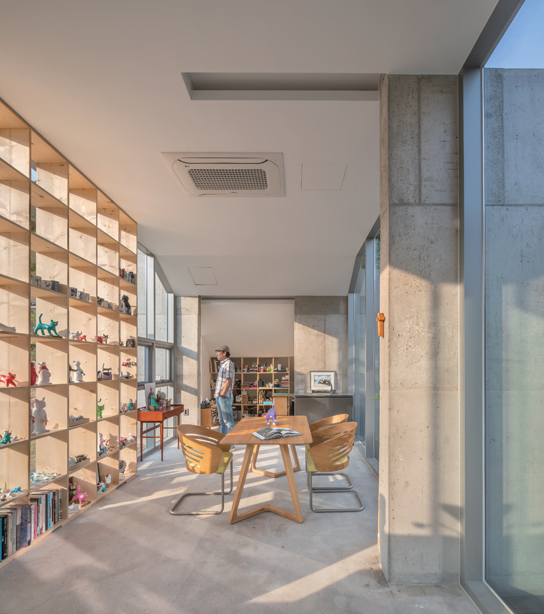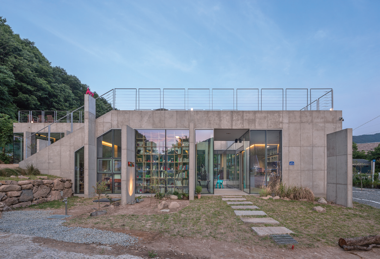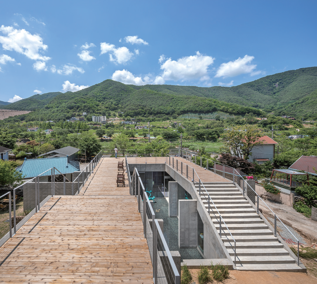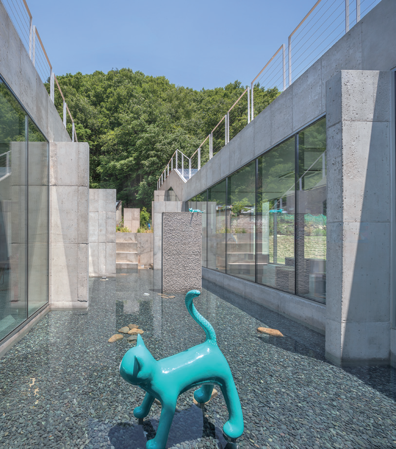 This sequestered site around Miryang Dam used to be a jujube field, and it is a slope where one can sit back in an alley from the road and where it faces towards the mountain. The client is an artist Insuk Choi who works with cat-themed paintings and three-dimensional art, and commissioned his small workshop and a family art cafe which he can run together with his son. As a space created by a family of retired artists, it was an experimental project which transformed a small rural area into a complex cultural space.