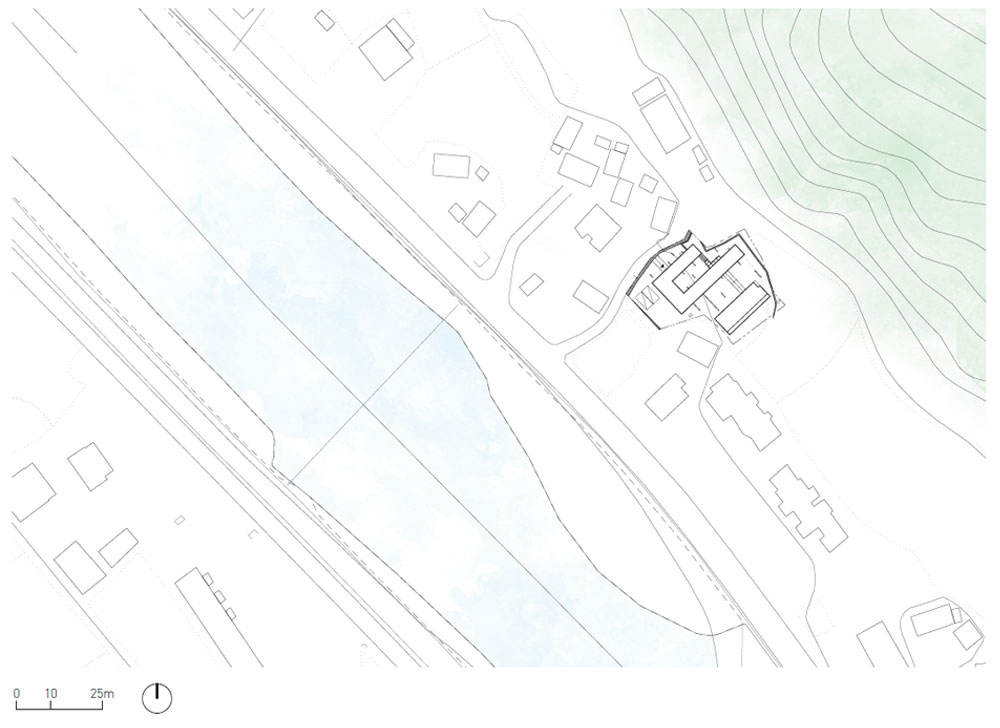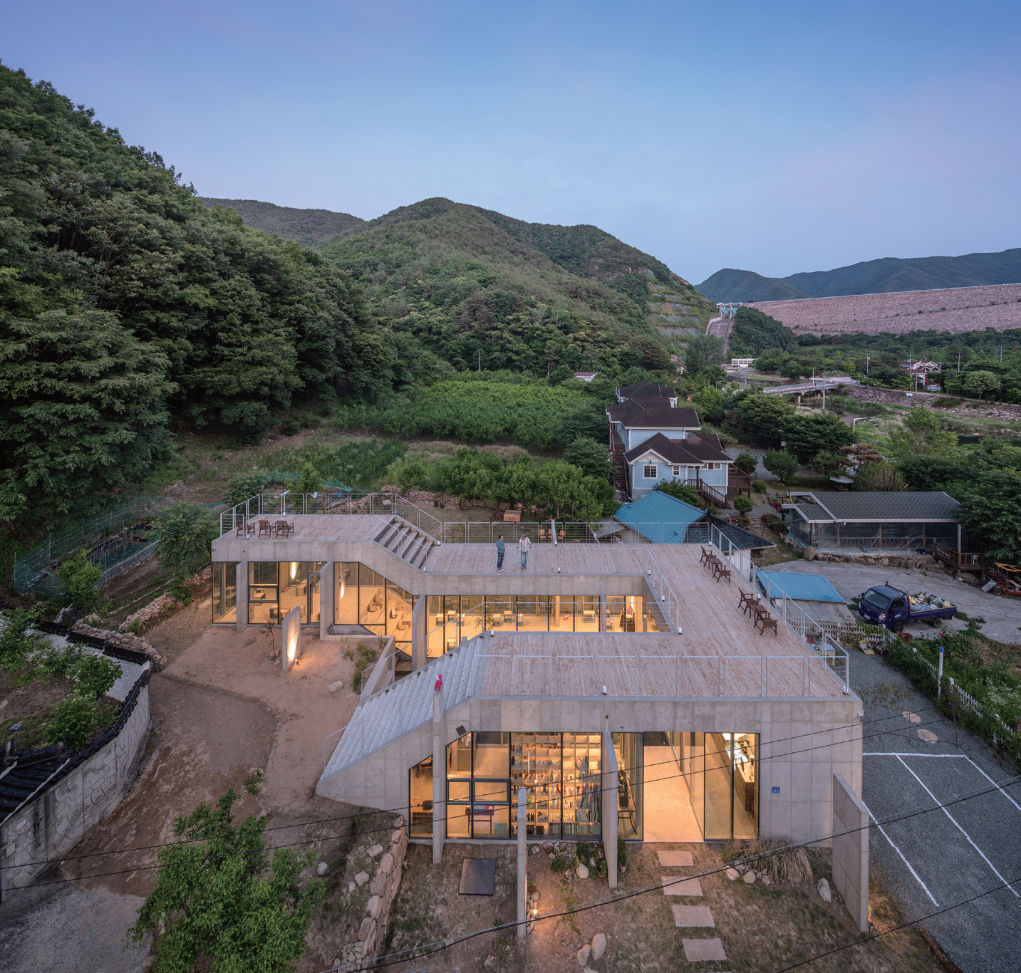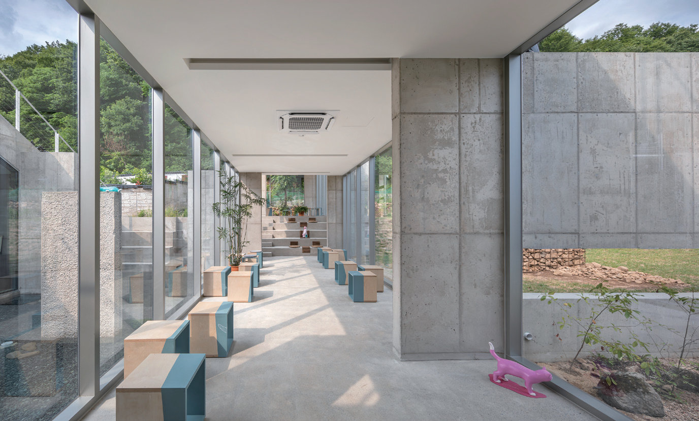 This sequestered site around Miryang Dam used to be a jujube field, and it is a slope where one can sit back in an alley from the road and where it faces towards the mountain. The client is an artist Insuk Choi who works with cat-themed paintings and three-dimensional art, and commissioned his small workshop and a family art cafe which he can run together with his son. As a space created by a family of retired artists, it was an experimental project which transformed a small rural area into a complex cultural space.