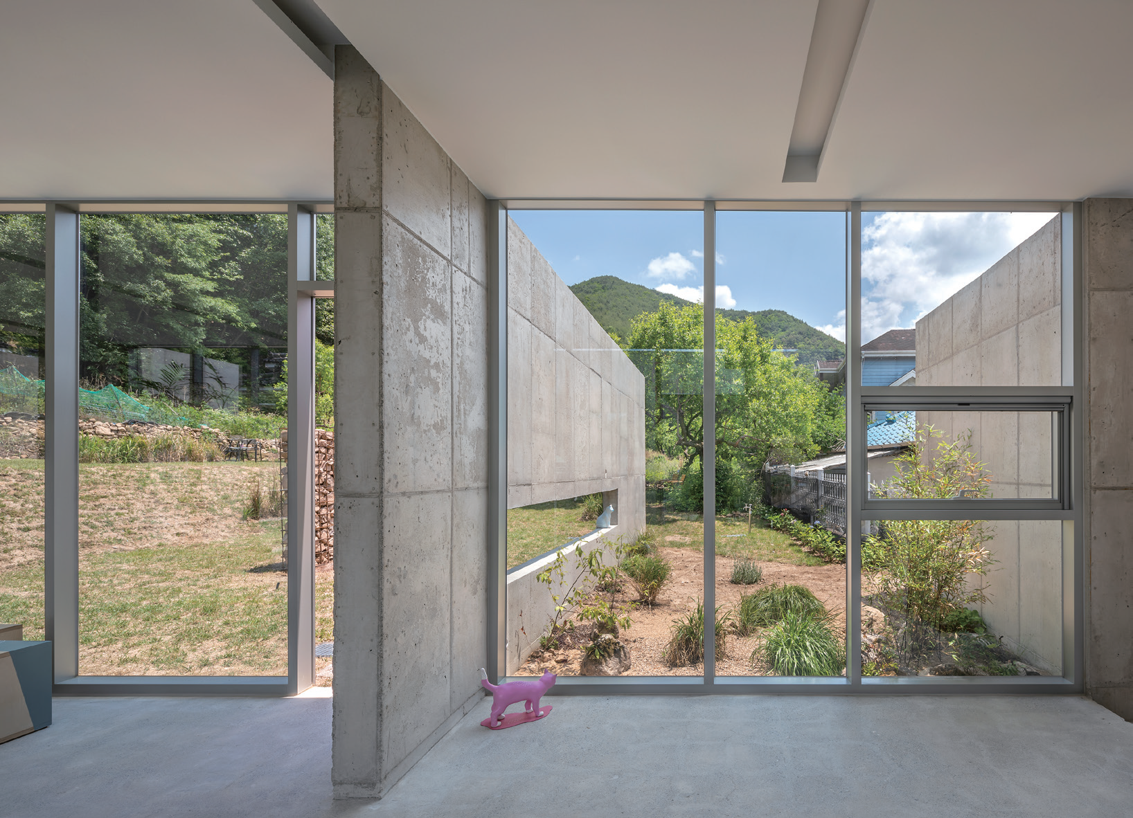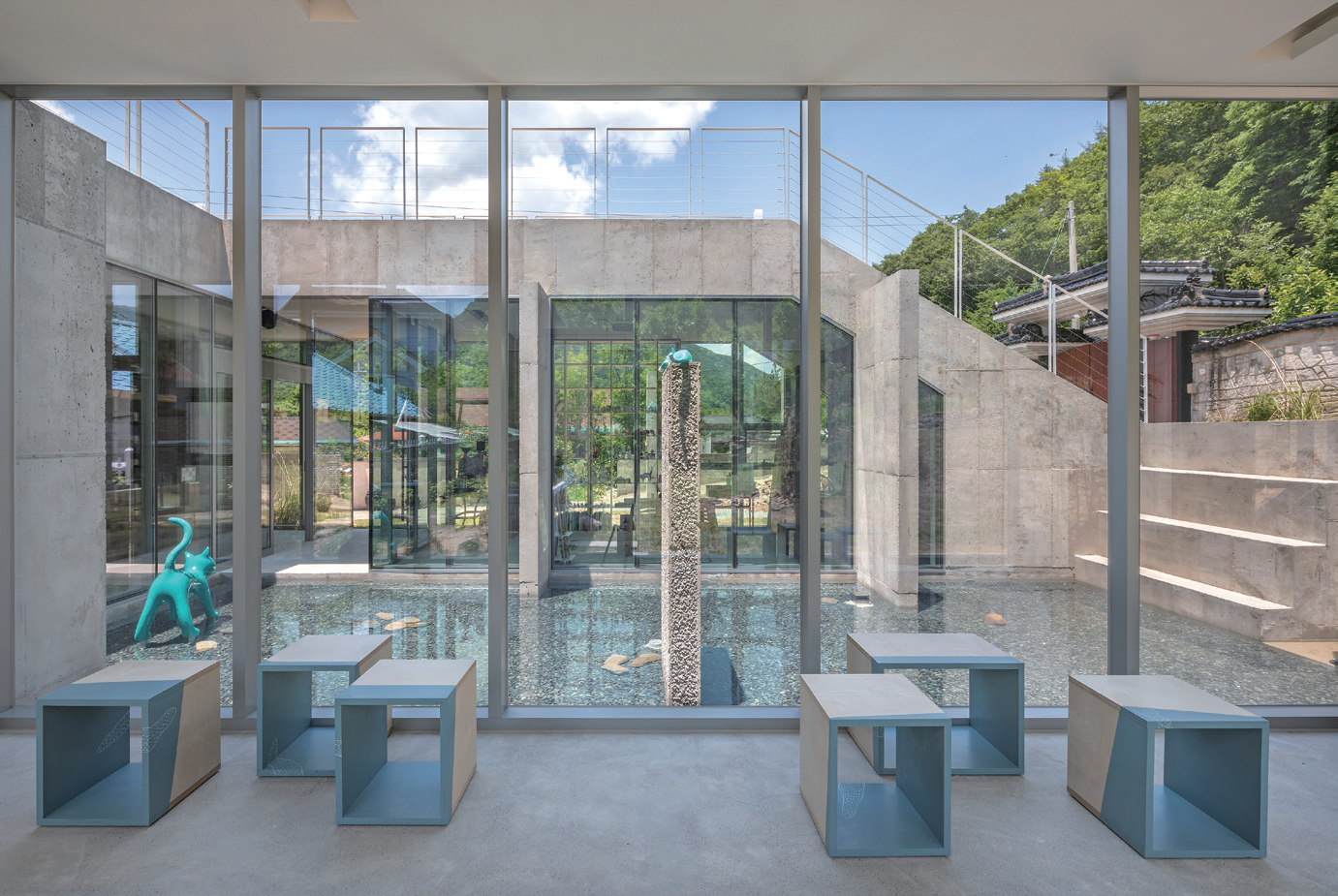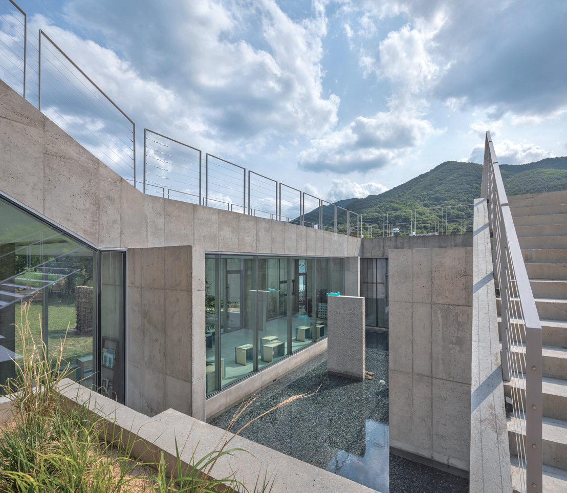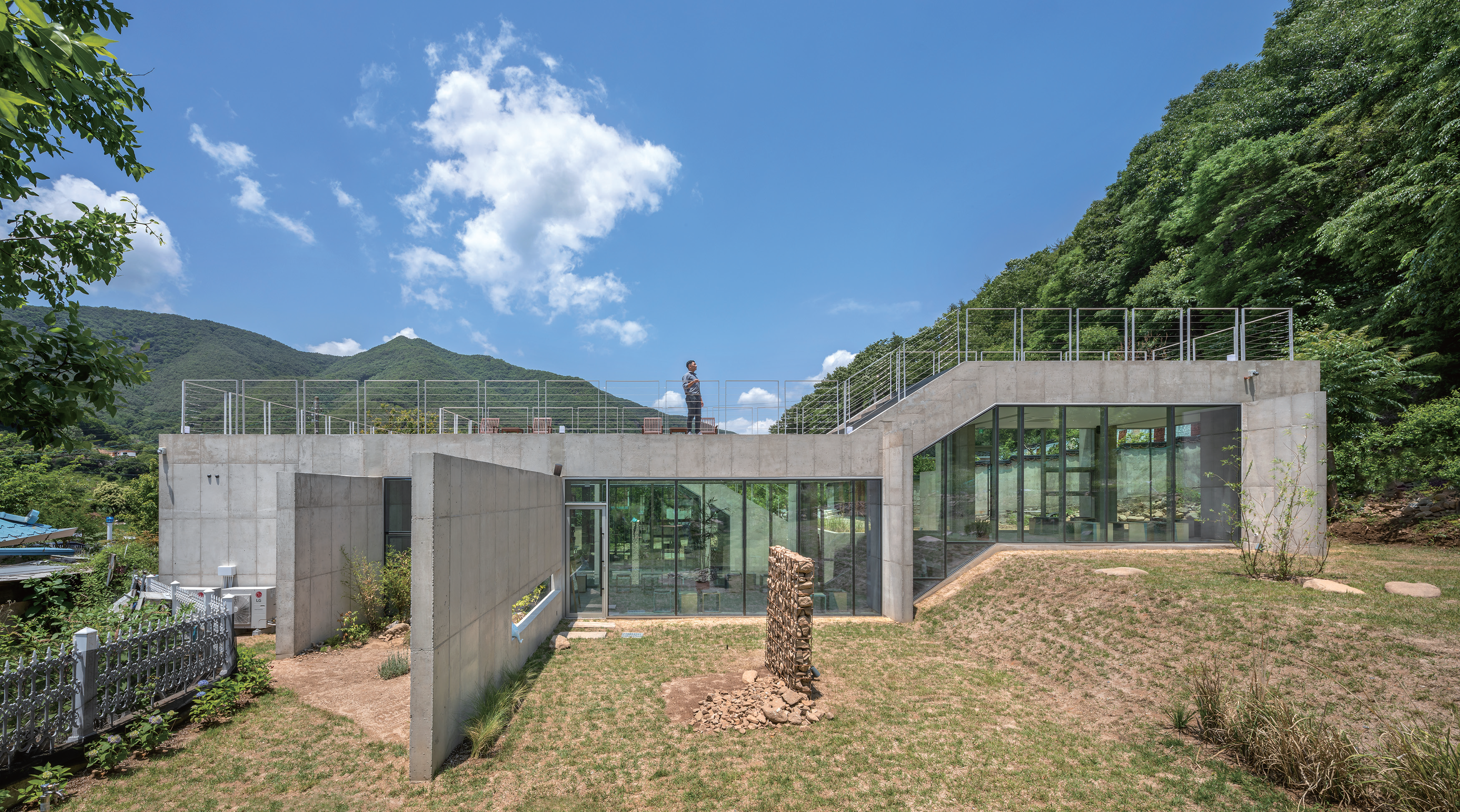 Continuously looking into the work of artist Insuk Choi, we discovered the characteristic of creating an expression with lines on a large side. As the simplest architectural device reflective of the characteristics of his work as it is in the nature of the site, he attempted to create an expression connected with the surrounding landscape by creating walls scattered towards the same direction. The scattered walls are sometimes an element of the interior space and an element of the exterior space. Furthermore, a long linear, minimal roof flowing along the terrain is laid out in a “ㄷ”-shaped letter along the terrain to construct the interior space. In order to avoid creating boundaries between the interior and exterior spaces around the roof, all of them are finished with glass to create an open space towards the nature. This is intended to create an atmosphere which lies in between the scattered walls of nature.