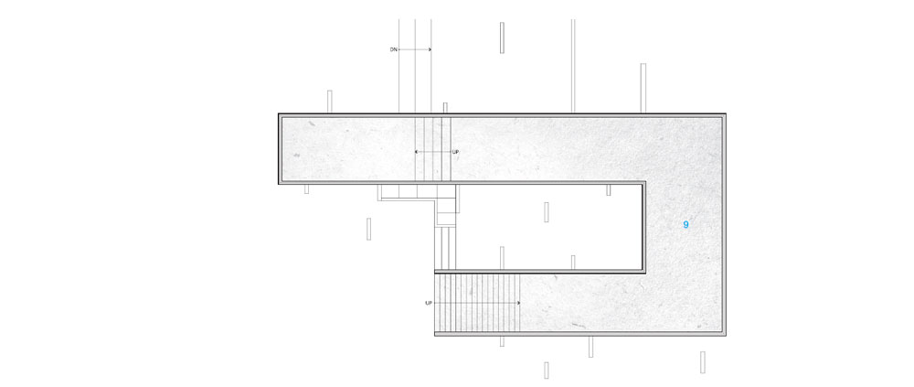 진입은 벽과 유리가 있는 지붕 공간의 벌어진 사이로 보이는 수공간을 보면서 건축물 내부로 자연스럽게 들어오게 된다. 작업실과 매장은 수공간을 통하여 연결의 지점을 만들고 있다. 폭이 좁은 내부 공간은 바리스타 영역을 지나고 서비스 동선을 우회하며 깊은 내부로 진입한다. 내부와 외부는 같은 경사를 이용하여 높이차를 만들고 높은 상단부에 도착하면 다시 외부로 나가게 된다. 높은 단의 외부 공간에서 자연스럽게 반층 높은 지붕으로 연결되는 지점을 만나고 자연스럽게 지붕을 순회하게 된다. 이 순환의 과정을 돌면서 방문객은 각각의 동선과 공간이 연결된 지점들을 확인하게 된다.