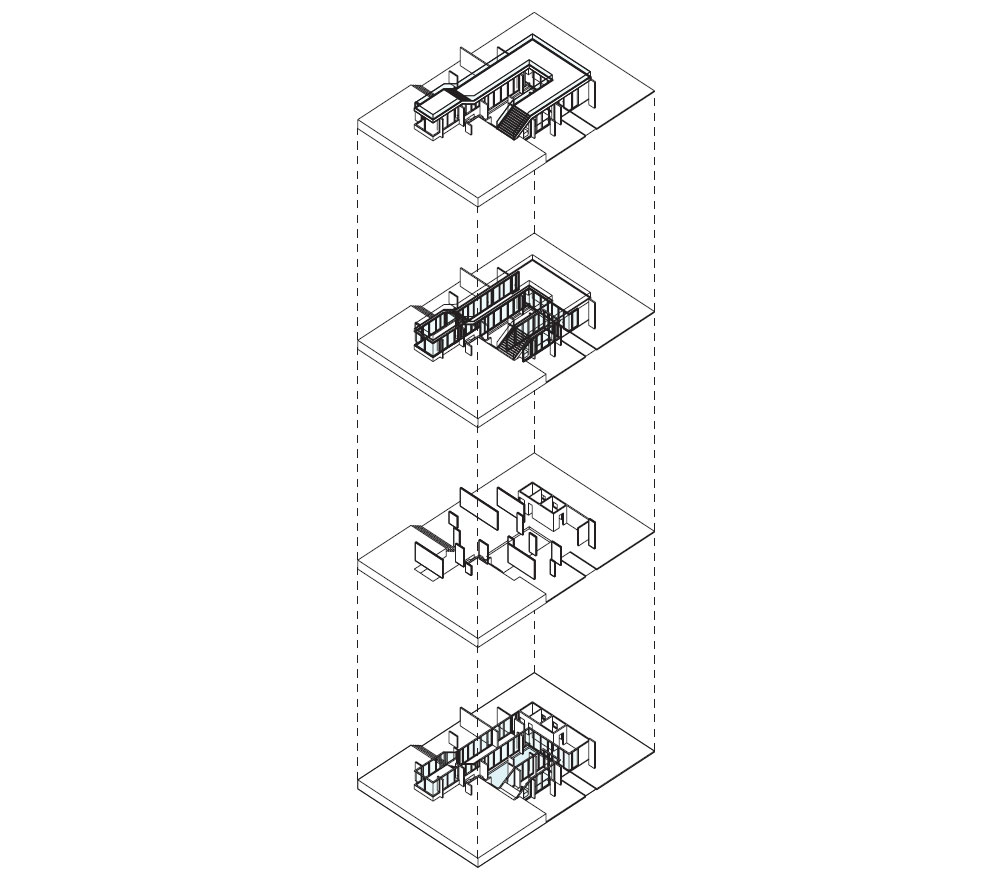 흩뿌려진 벽과 직교되는 방향으로 공간의 레이어를 구성하였다. 보통은 상업공간이 전면에 배치되고 작업 공방이 안쪽에 배치되는 것과 반대로 작업 공방을 전면에 배치하고 투명한 유리로 마감하여 도로와 안쪽 상업공간에서 항상 이 공간을 인지할 수 있도록 하였다. 작은 작업공간이지만 극장의 무대인 것처럼 본 건축물의 보이지 않는 중심이 되는 것이다. 나비공작소는 진입 및 작업 공방, 외부 공간인 수공간, 커피를 마시는 내부 공간, 그리고 그 다음은 외부 공간으로 이어지는 레이어로 구성되어 있다. 모든 공간에서 겹겹이 중첩되는 공간들의 연속성을 시각적으로 확인할 수 있고 이를 통하여 레이어의 경계가 생기지 않고 오히려 흩뿌려진 물리적인 벽들에 의해 하나로 열린 중간계에 있는 듯한 착각을 불러일으킨다.
