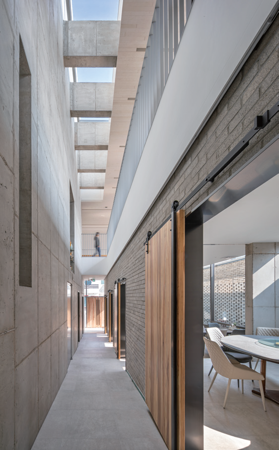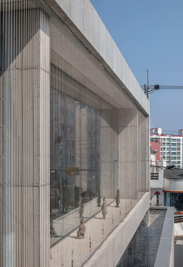 The closed space on the first floor and the open space on the second floor meet in the middle open space. This is a space filled with light falling from the ceiling. The stairs leading to the second floor are usually placed at or towards the entrance, whereas in Lóngmén, it was situated towards the inside to allow one to experience and bypass the light filled space between. The shadows created by the light falling from the skylight in the space between are cast on the walls of the straight staircase, thereby allowing one to experience the passage of time in the shape of the shadows that change according to the movement of light, which plays a role in creating a balance between the closed and open spaces.