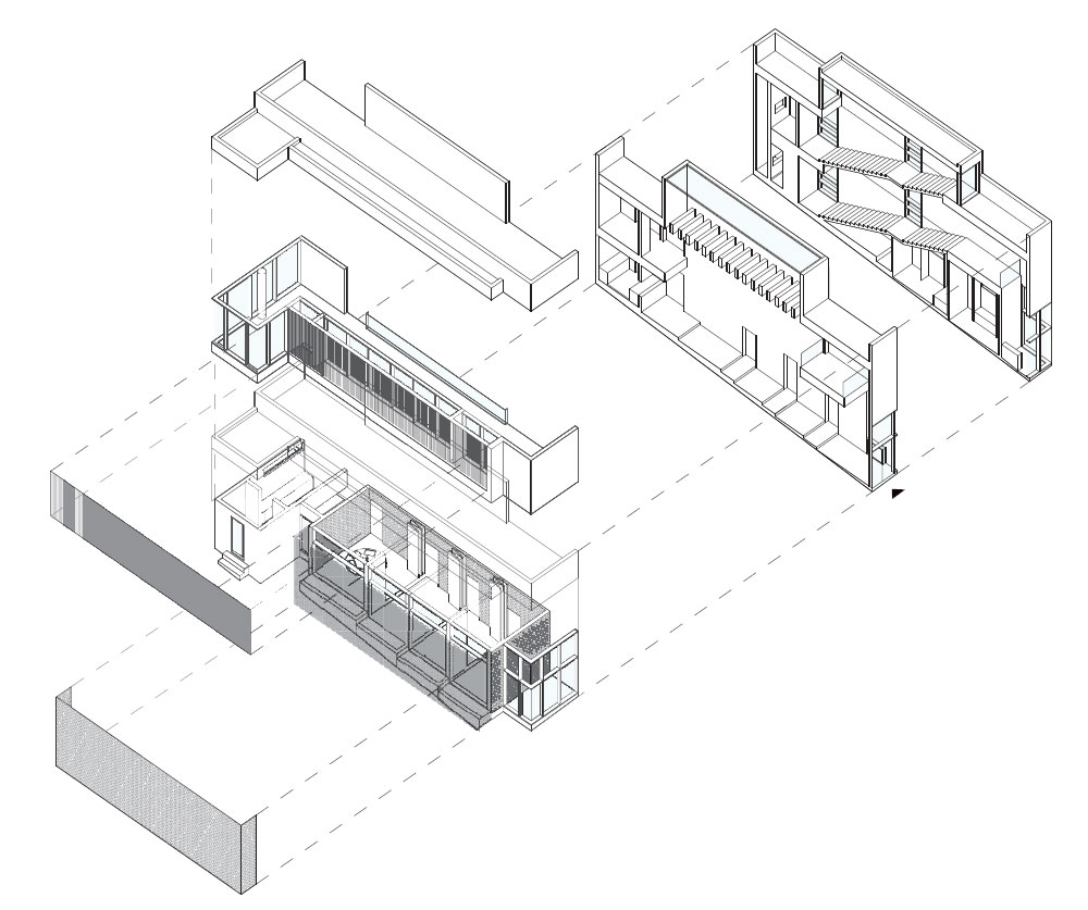 1층의 지형 높이차를 활용한 4단의 실내 공간은 가변형 벽체로 구획하였다. 필요에 따라서 하나의 공간으로 또는 여러 개의 나뉜 공간으로 이용할 수 있다. 모든 공간의 구획을 열어서 하나의 공간으로 만들면 자연스럽게 높이차에 따라 생긴 극장 같은 무대가 형성된다. 룸으로 구성된 공간은 차량의 통행이 많은 열린 도로와의 시각적 차단을 위하여 사이 공간인 포켓 정원을 만들어 도시와 관계하는 하나의 스크린 역할을 하도록 하였다.