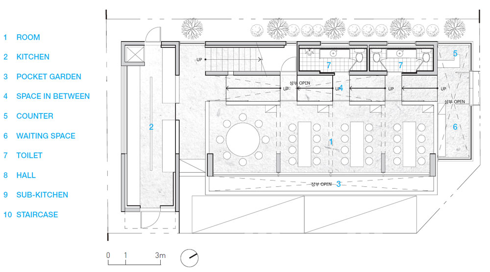 If the foundation is filled as much as the height of the sloping bedrock with the underground bedrock, the floor height of the first floor will increase by 1.2m. This is fatal for the accessibility of commercial architecture. However, there were many issues owing to the density of the surrounding residential facilities and the increase in the construction costs to proceed with the bedrock construction. Conventionally, restaurants have a large hall on the first floor, and private rooms are located on the second floor or in an invisible space. Rather, the formation of the program was paradoxically reformed by taking advantage of the poor conditions of the site. Private rooms were placed on the first floor, where there is heavy traffic, and an open hall was constructed on the second floor availing the view towards Mt. Hamwol and the sceneries. By utilizing the height difference of the terrain, the height of the first floor’s floor for each room was made to change according to the terrain.