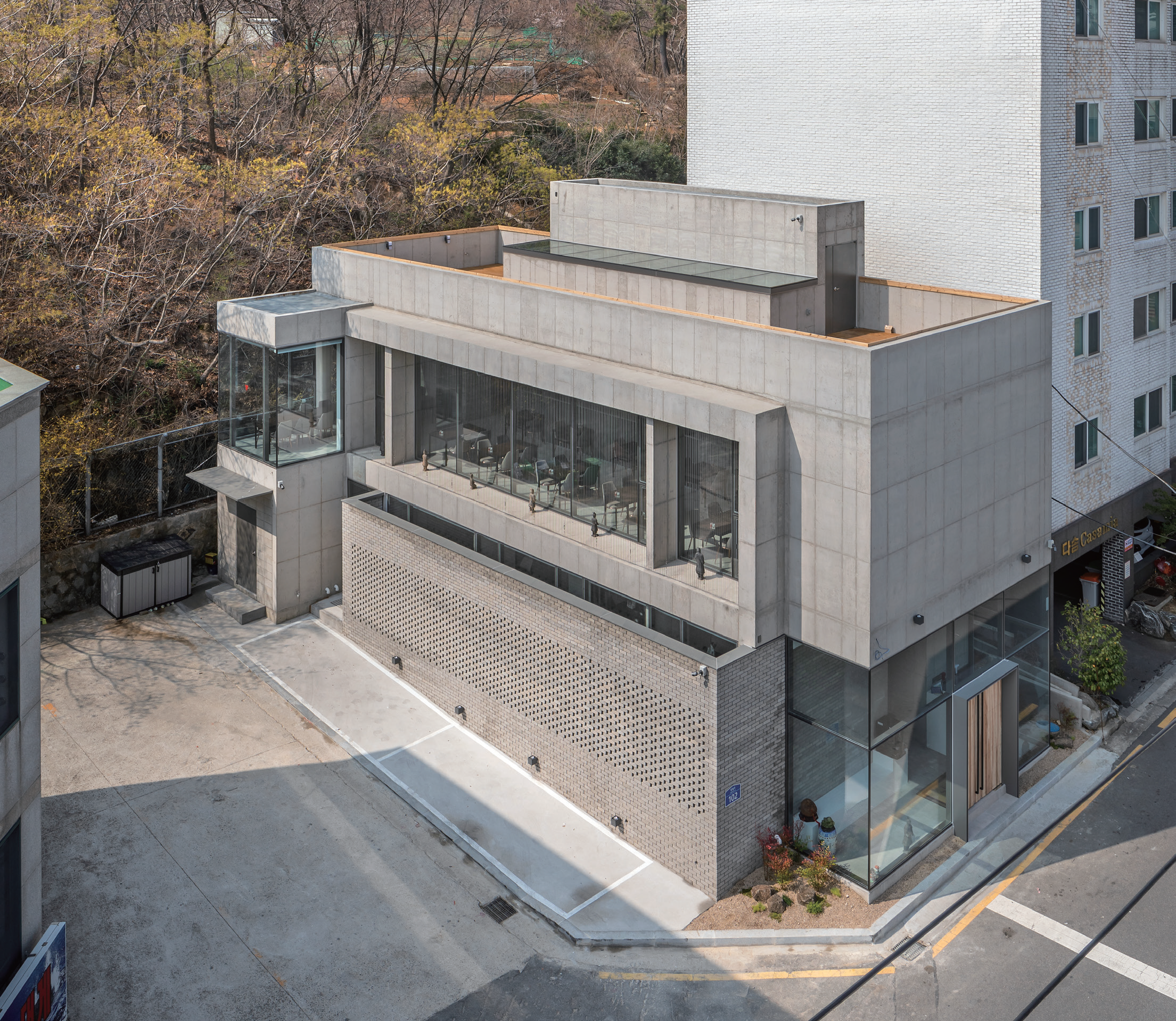 The four-layered indoor space utilizing the topographical height difference on the first floor was partitioned with variable walls. They may be used as a single space or as several divided spaces as necessary. If all the spaces are opened and made into a single space, a theater-like stage is naturally formed according to the height difference. The space consisted of rooms was designed to operate as a screen relating to the city by creating a pocket garden, which is a space between, to visually block the open road with heavy traffics.