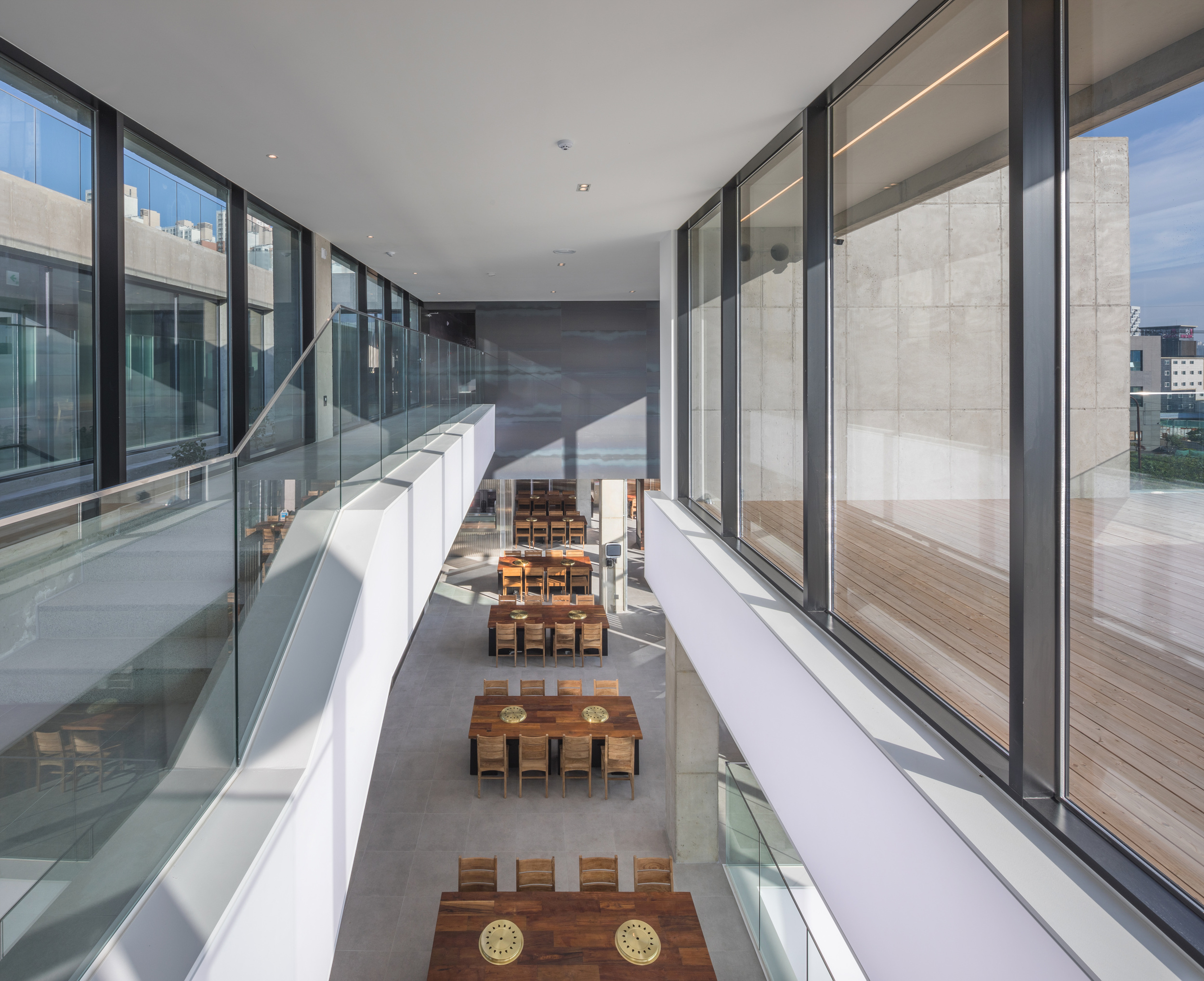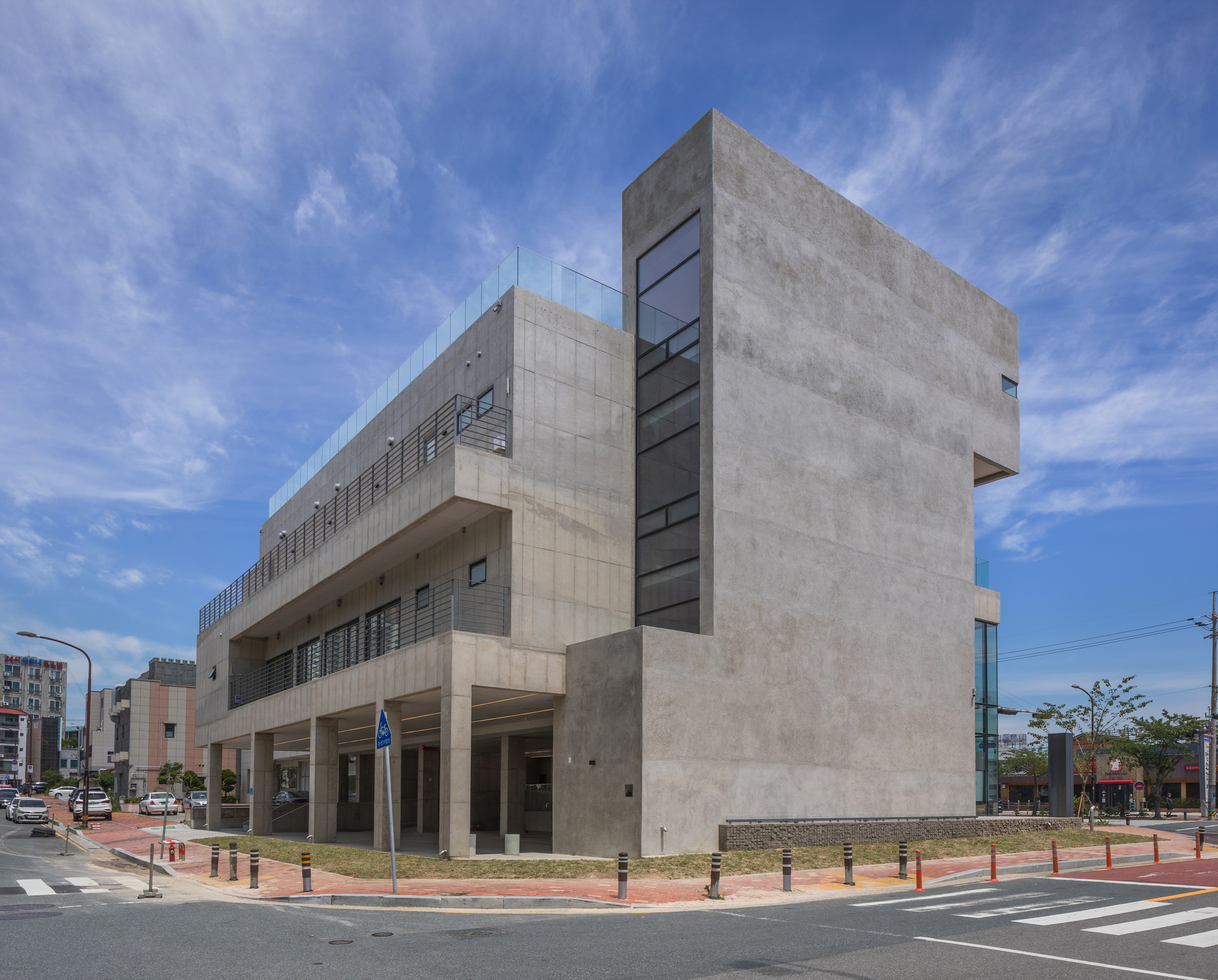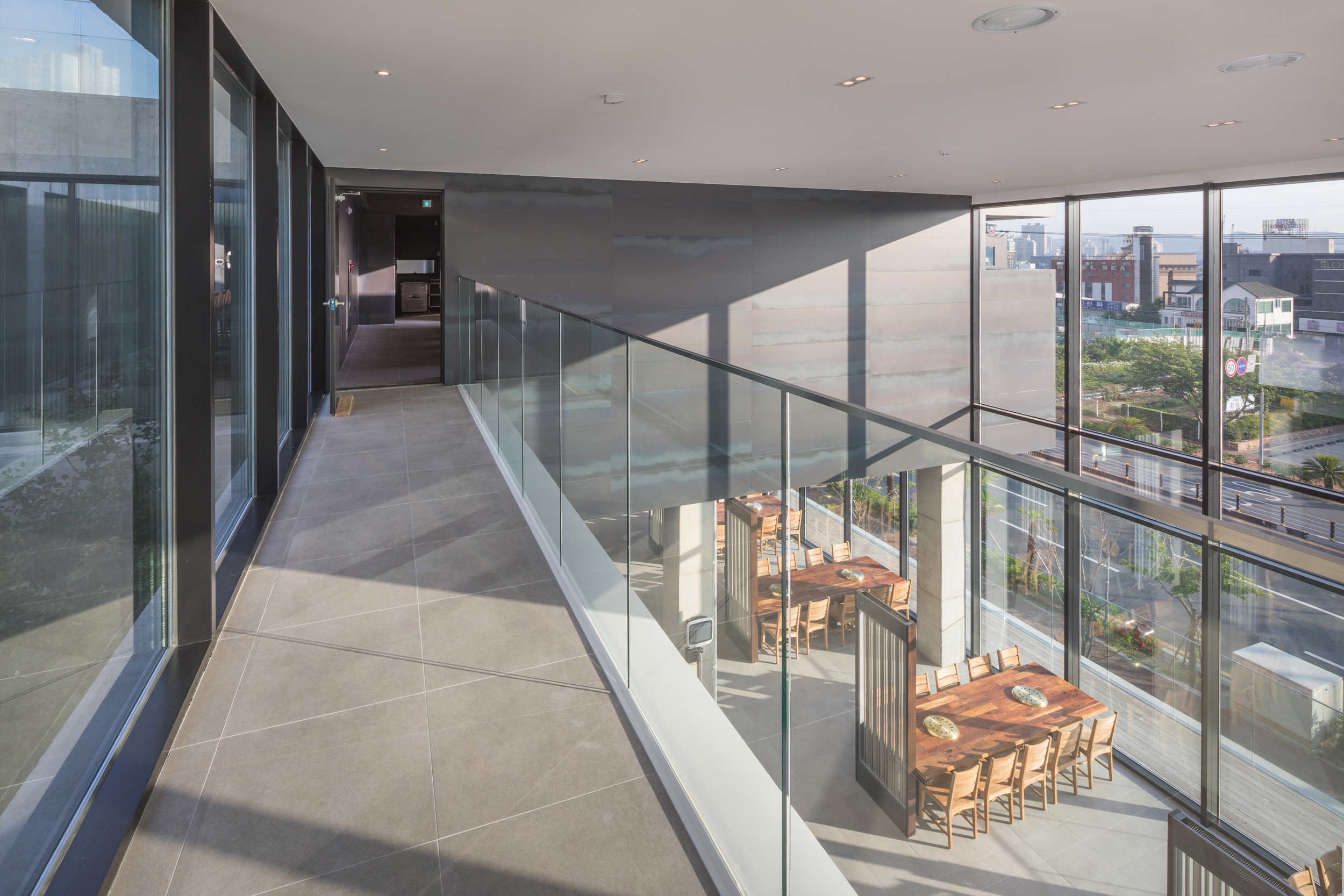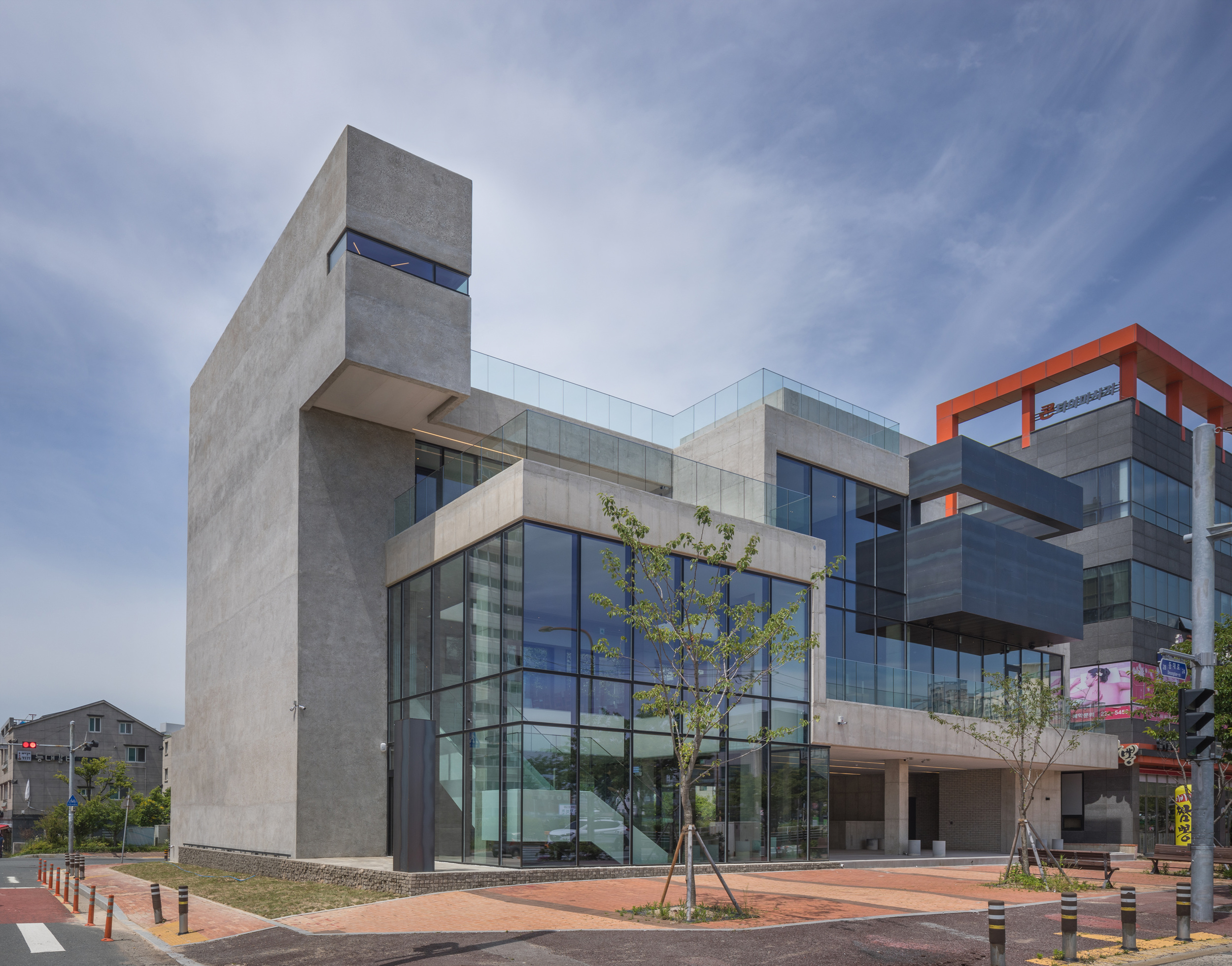 Conventionally, a strong sunlight from the south presents the issue of always having to lower the blinds in commercial spaces. The rooms were arranged on the southern side of the second and third floors to address this issue, and the large hall was placed on the northern side to secure a sense of openness and to control the issue of sunlight. In both the south and the north, the space between the cities was formed by arranging the external space rather than directly being related to the cities. By creating a courtyard in the area where the room and the hall are related, a middle area was formed where the two different structures are balanced. The exterior observation plaza derived from the south and north movements of the second floor relates to the cities in a vertical structure. The rooftop is an external city observation deck that may be used as a multi-purpose space and event. From the piloti parking lot, which serves as an empty city plaza on the first floor, the external spaces on the second and third floors are stacked with a single inner space layer and are a middle area that connects the relationships and integrates the outer spaces stacked on the roof top.