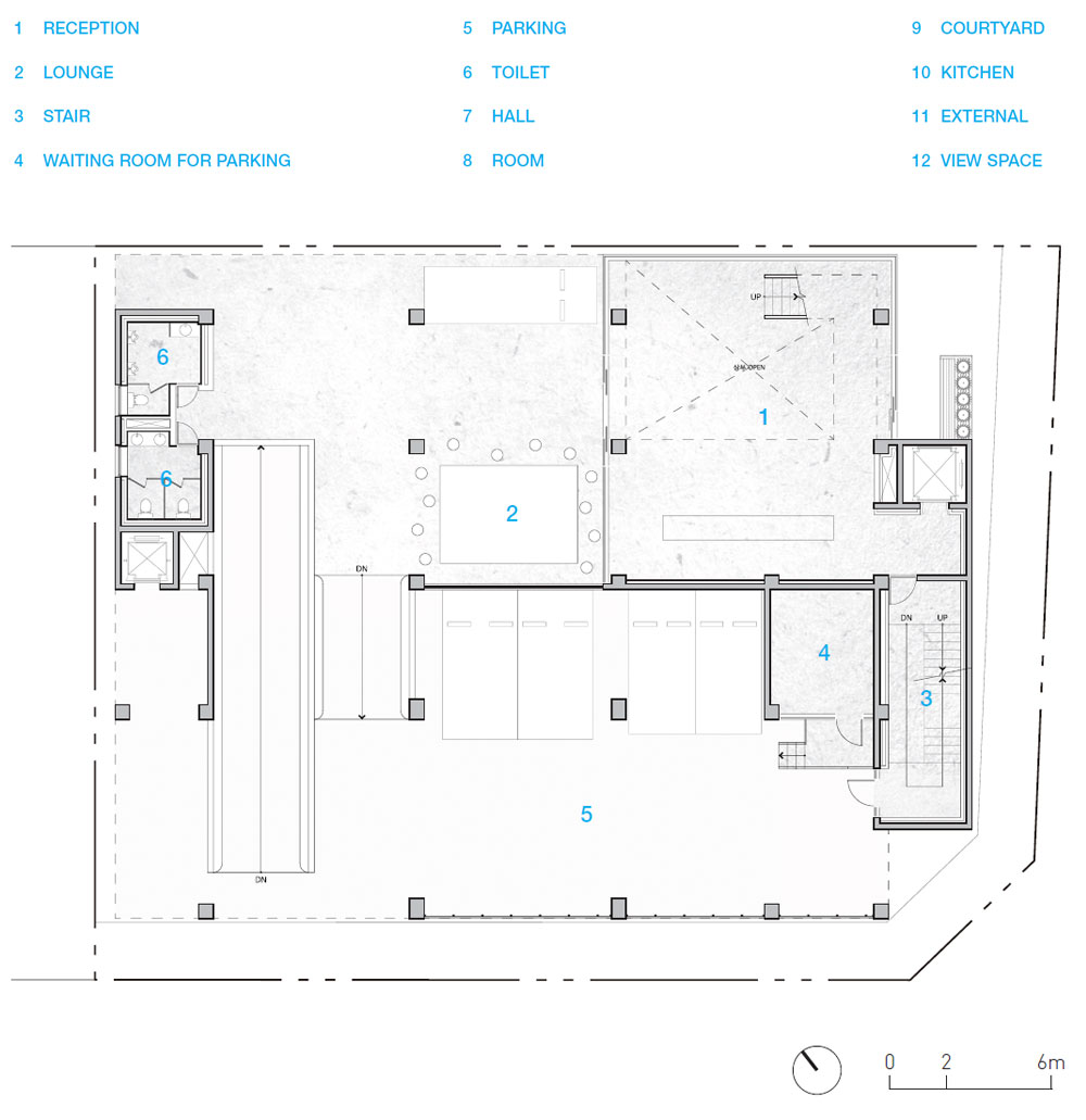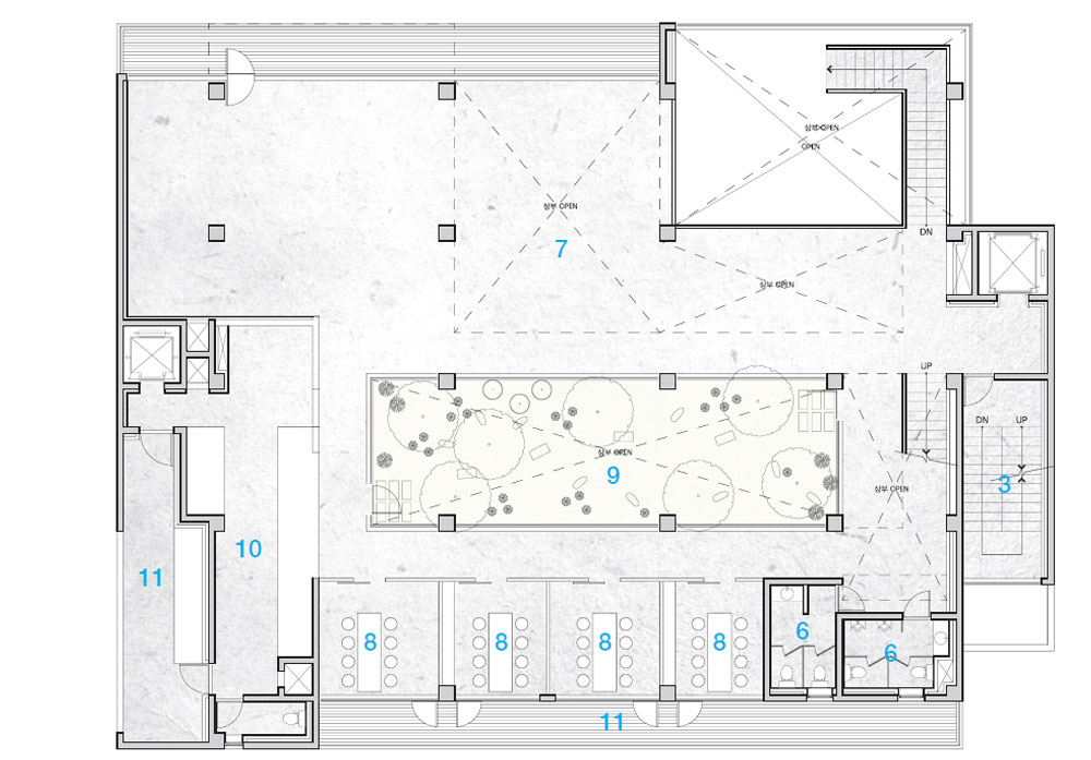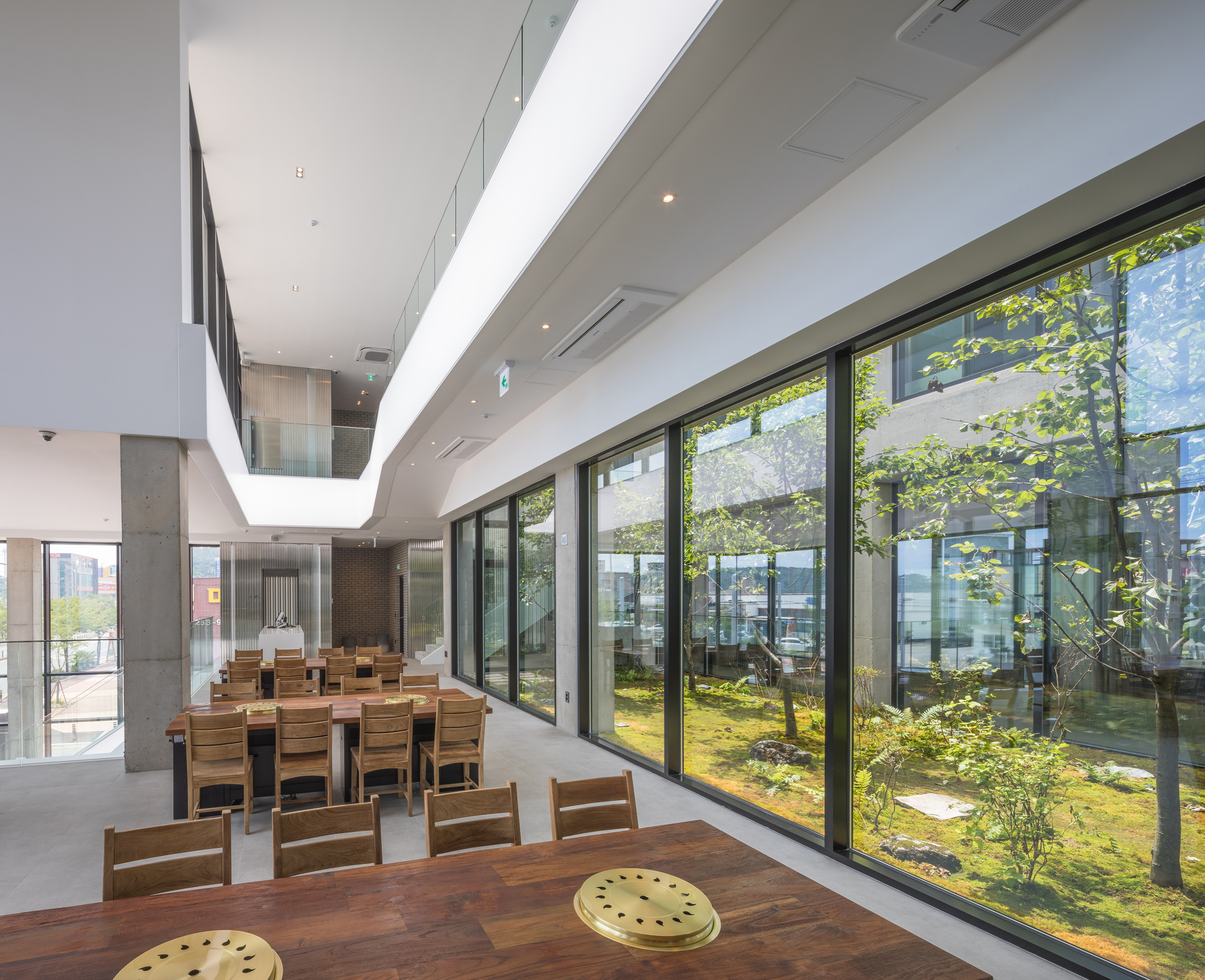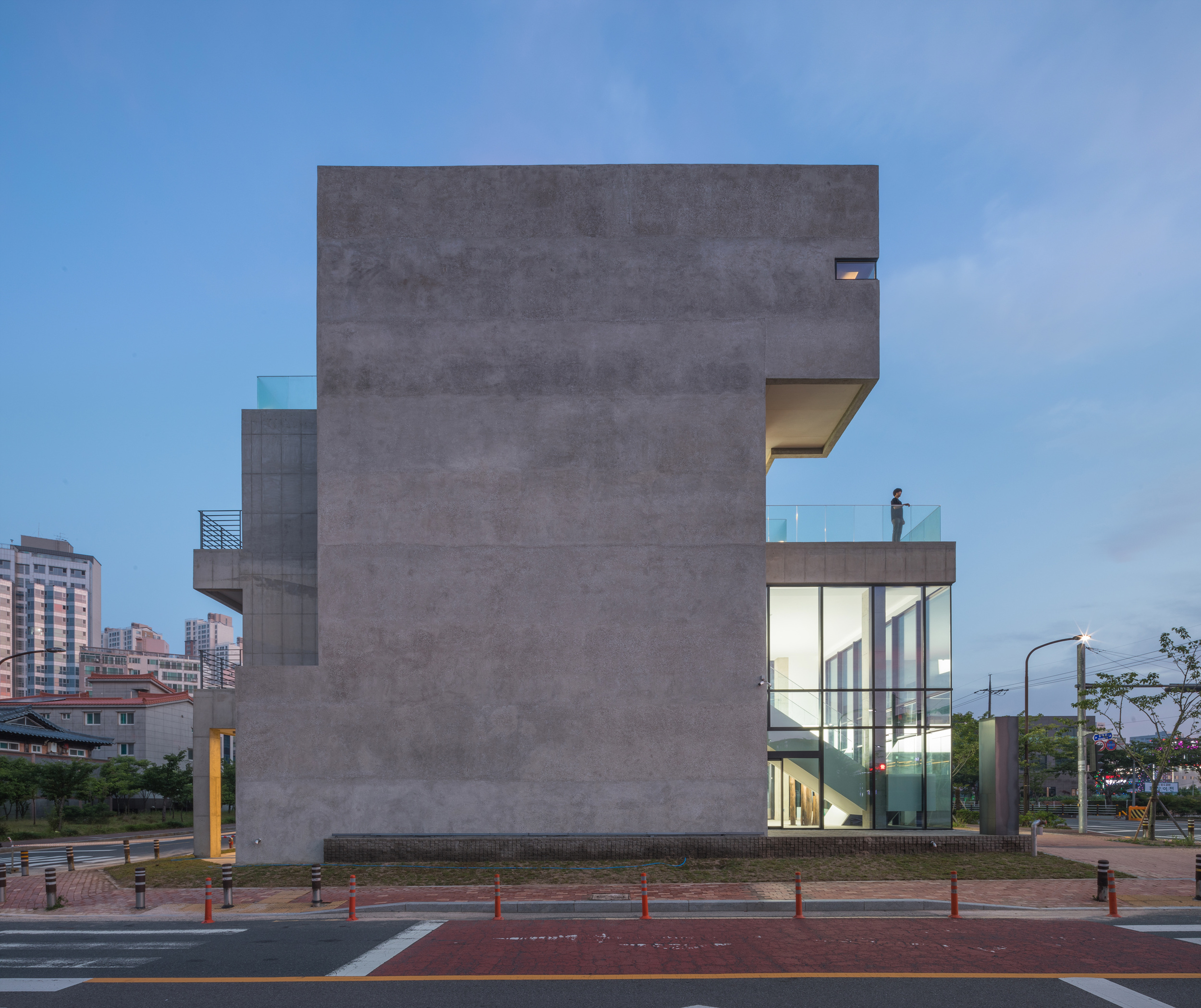 Conventionally, a strong sunlight from the south presents the issue of always having to lower the blinds in commercial spaces. The rooms were arranged on the southern side of the second and third floors to address this issue, and the large hall was placed on the northern side to secure a sense of openness and to control the issue of sunlight. In both the south and the north, the space between the cities was formed by arranging the external space rather than directly being related to the cities. By creating a courtyard in the area where the room and the hall are related, a middle area was formed where the two different structures are balanced. The exterior observation plaza derived from the south and north movements of the second floor relates to the cities in a vertical structure. The rooftop is an external city observation deck that may be used as a multi-purpose space and event. From the piloti parking lot, which serves as an empty city plaza on the first floor, the external spaces on the second and third floors are stacked with a single inner space layer and are a middle area that connects the relationships and integrates the outer spaces stacked on the roof top.