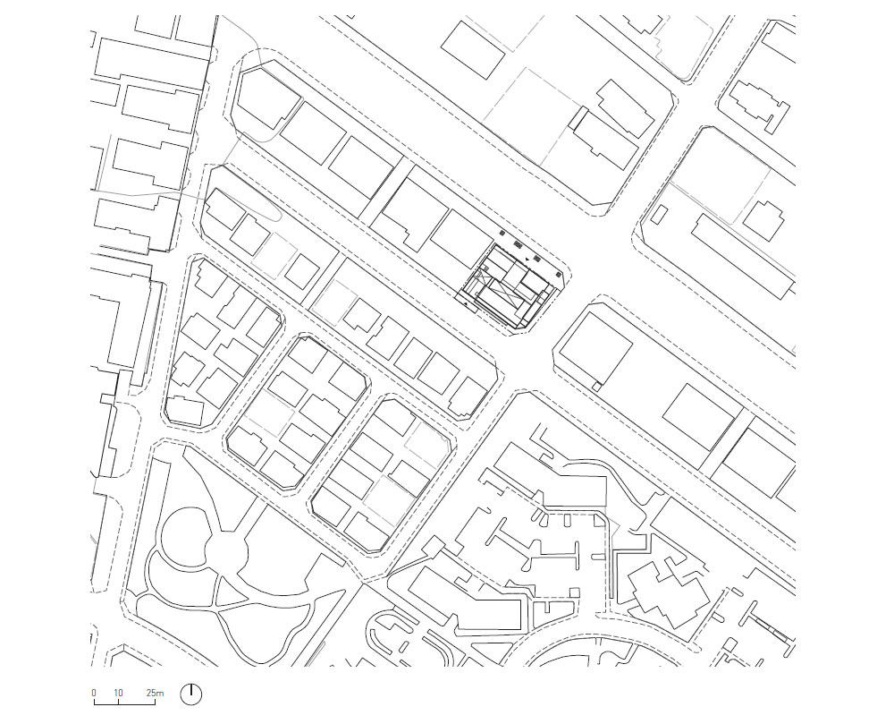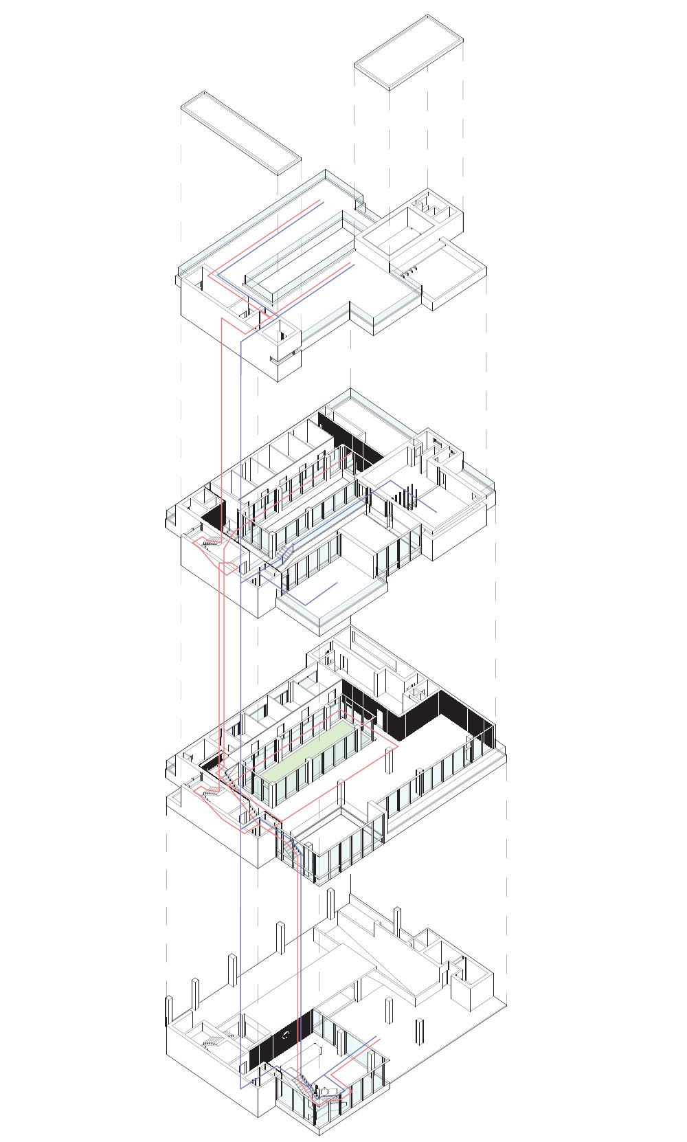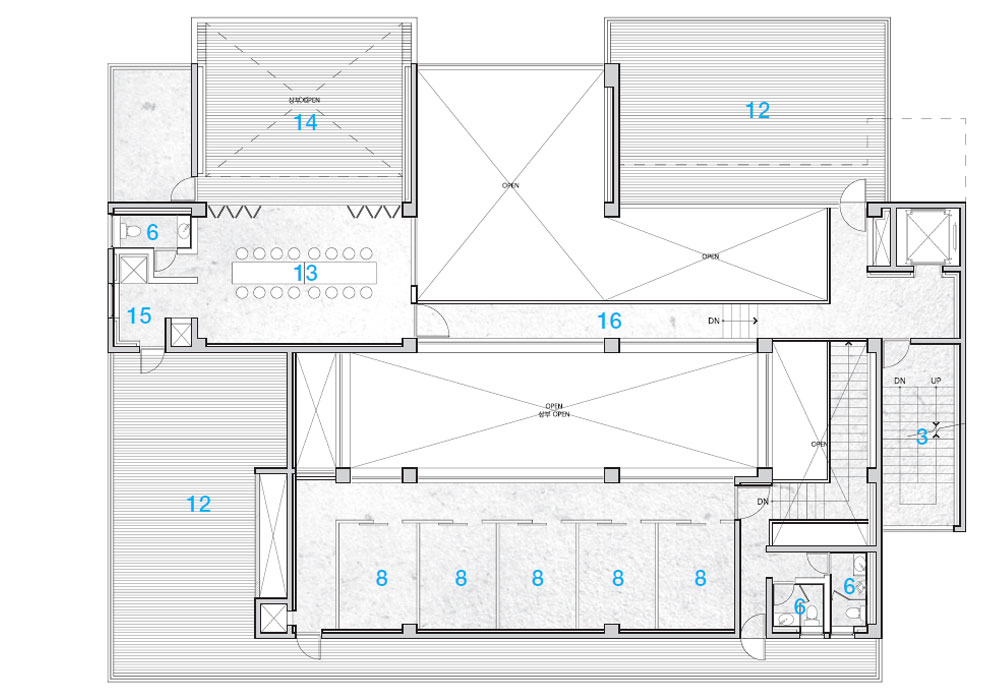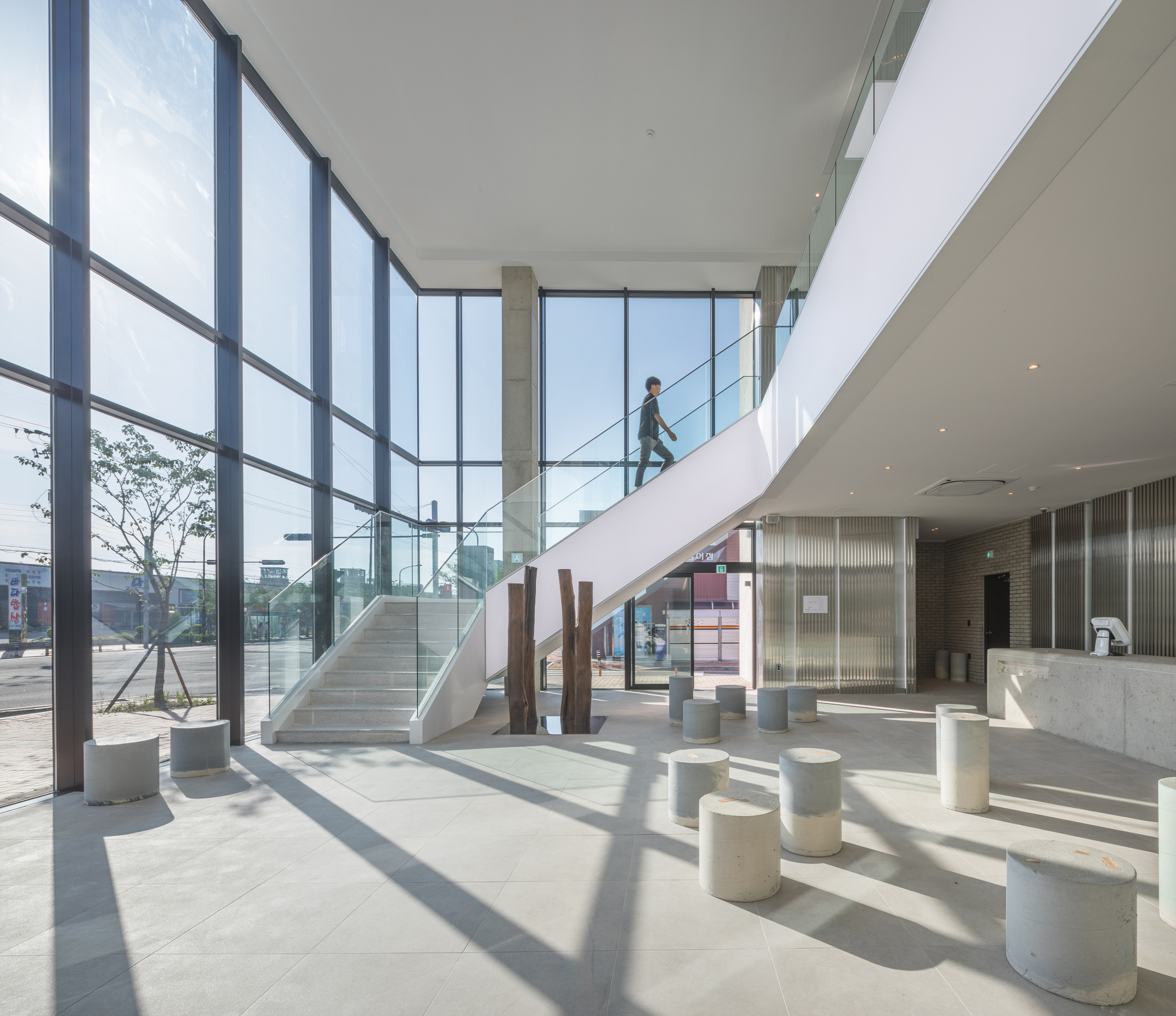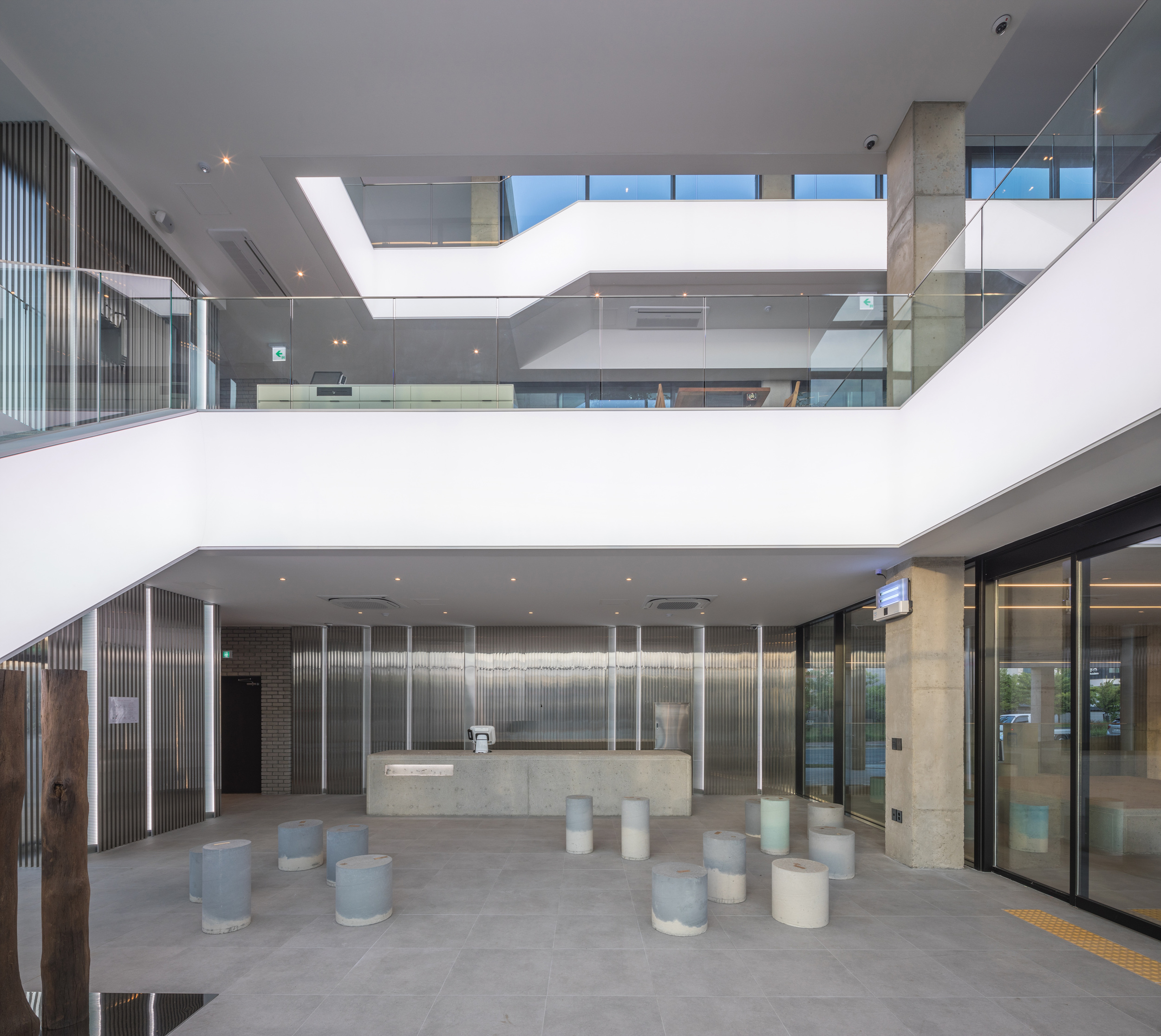 Conventionally, a strong sunlight from the south presents the issue of always having to lower the blinds in commercial spaces. The rooms were arranged on the southern side of the second and third floors to address this issue, and the large hall was placed on the northern side to secure a sense of openness and to control the issue of sunlight. In both the south and the north, the space between the cities was formed by arranging the external space rather than directly being related to the cities. By creating a courtyard in the area where the room and the hall are related, a middle area was formed where the two different structures are balanced. The exterior observation plaza derived from the south and north movements of the second floor relates to the cities in a vertical structure. The rooftop is an external city observation deck that may be used as a multi-purpose space and event. From the piloti parking lot, which serves as an empty city plaza on the first floor, the external spaces on the second and third floors are stacked with a single inner space layer and are a middle area that connects the relationships and integrates the outer spaces stacked on the roof top.